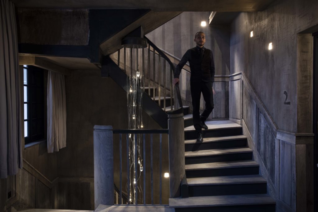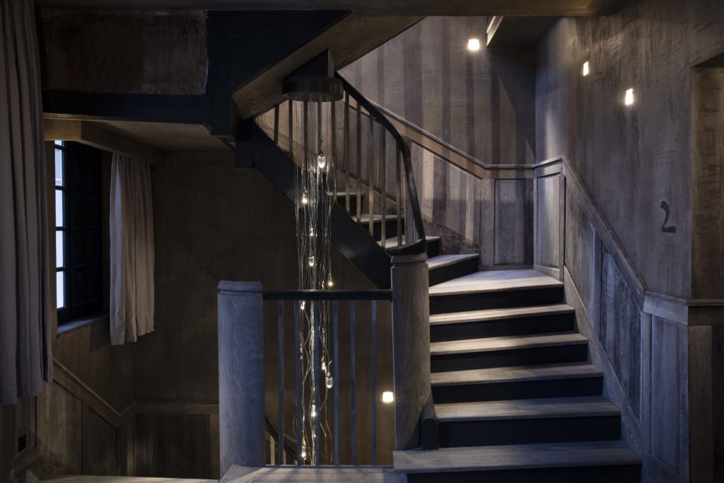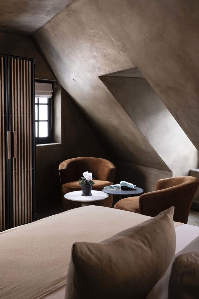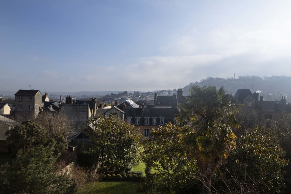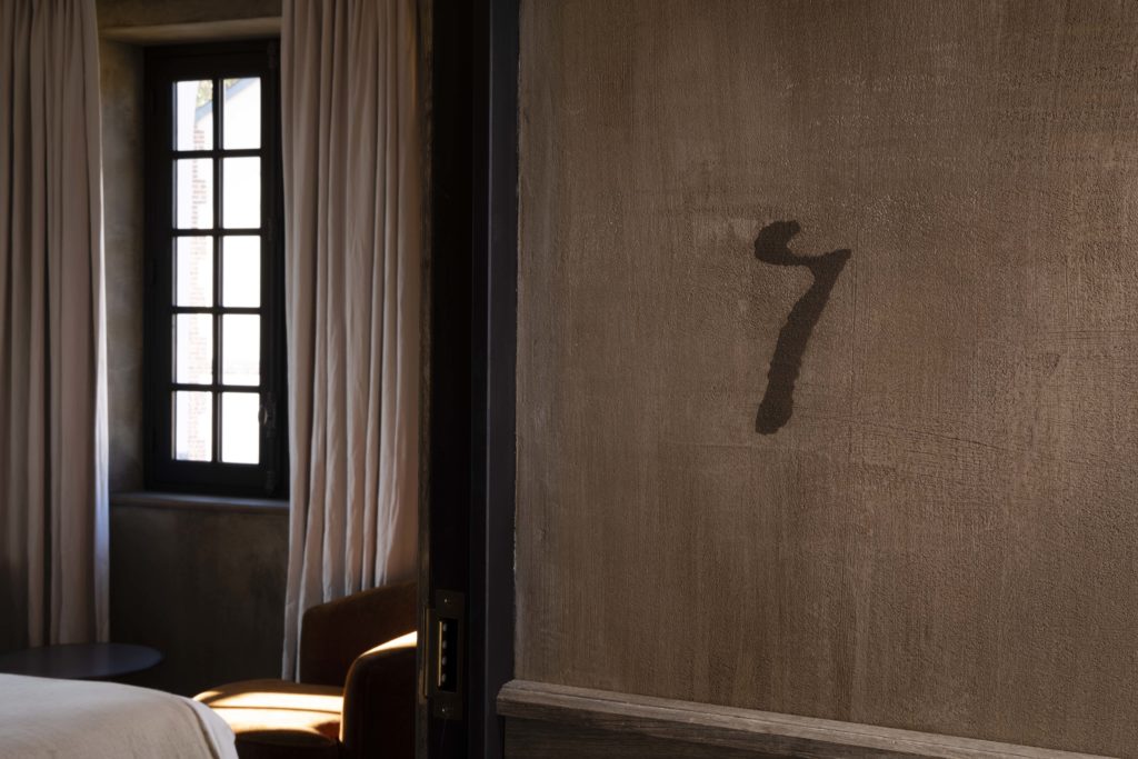 Chaque élément est pensé, construit ou cousu sur mesure. Les matériaux sont nobles et naturels, la décoration est épurée et chaleureuse. L’atmosphère y est cosy. Du beige, du marron, du noir, du blanc. Du chêne, du lin, du métal, du marbre, du daim… Des fauteuils généreux, un parquet en pointes de Hongrie, des tapis à poils longs, des dressings en latte de bois, des têtes de lit imposantes en bois brut… Les lumières sont tamisées, discrètes, cachées dans les plinthes. Le plafonnier pourrait presque déranger. La touche colorée, plusieurs fresques exposées dans les chambres. Imaginées depuis des zooms de peintures de Saint-Délis, elles représentent Honfleur et ses alentours. Étonnant de voir que dans ces fresques très contemporaines se cachent les dessins d’un grand peintre du 19 /20ème siècle. Dans cette adresse confidentielle, tout en respectant la tradition, les designers apportent un léger souffle moderne et créatif et s’inspirent des oeuvres du peintre, toujours sous l’œil aguerri des architectes des bâtiments de France. De quoi attiser la curiosité et redécouvrir l’art du maître des lieux.