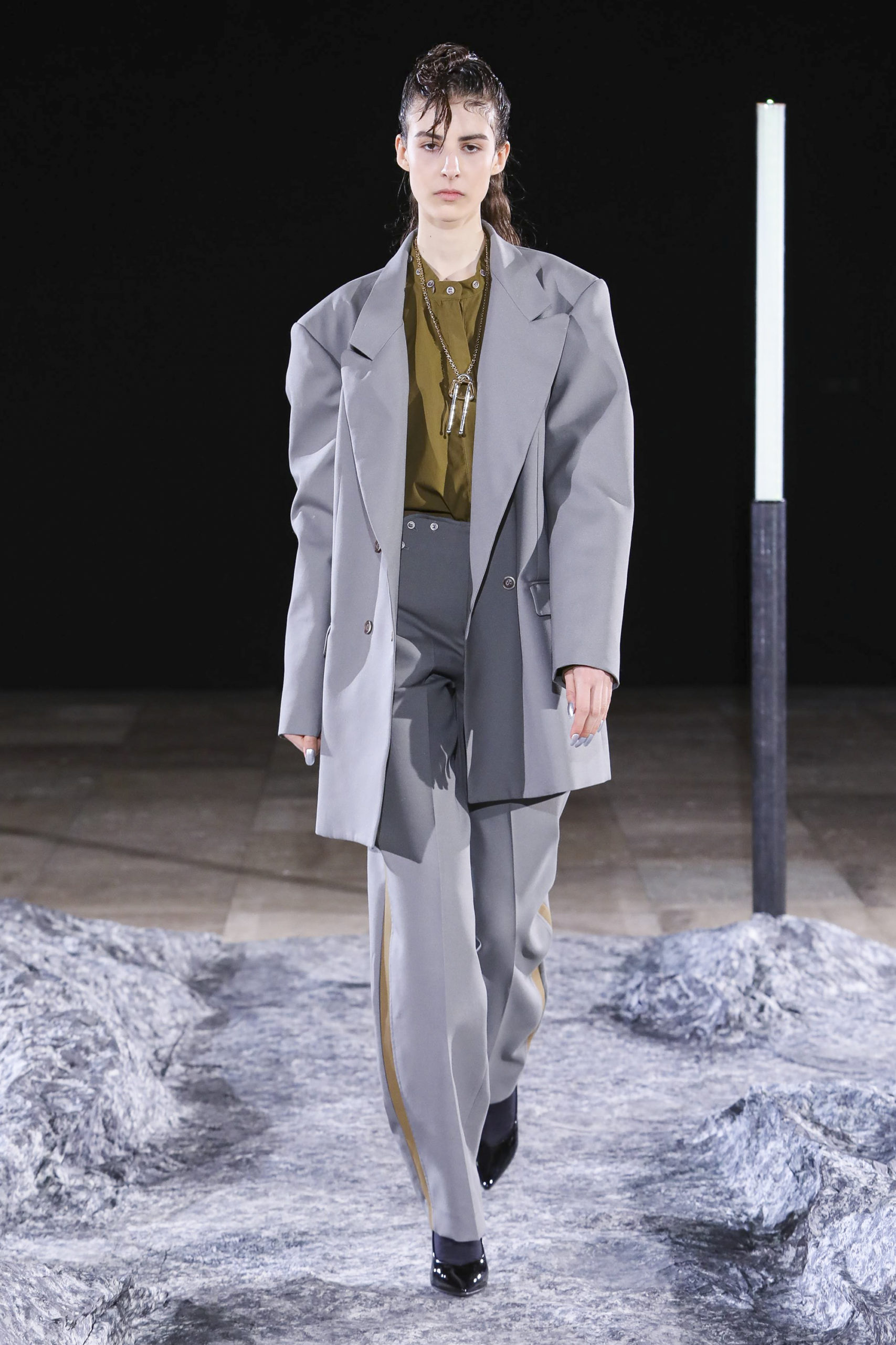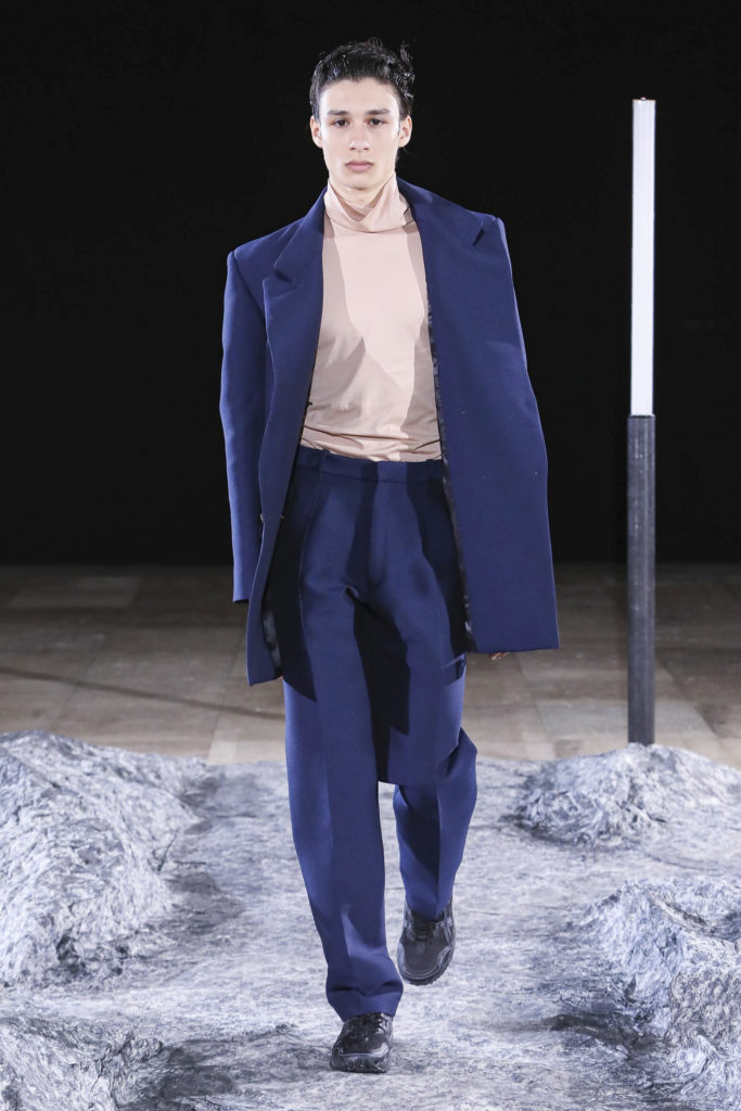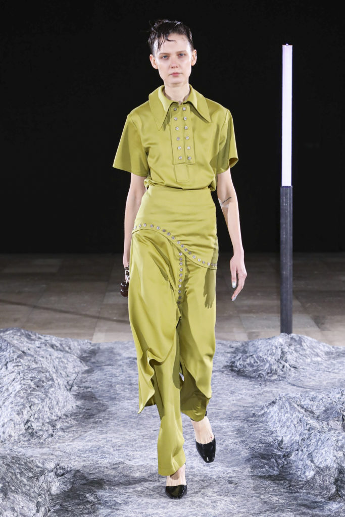 La palette de cette saison s’étend du vinyle violet sombre aux lainages verts anis en passant par le vert céladon et le kaki. Des accents rouges viennent de temps entemps rompre cette harmonie trop calme.