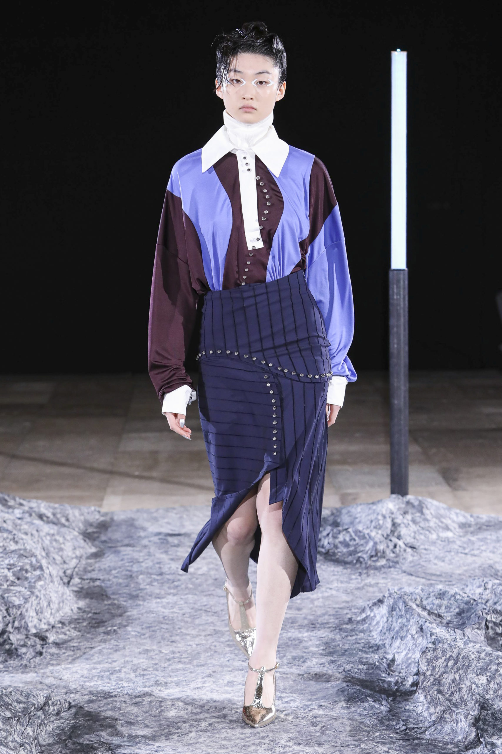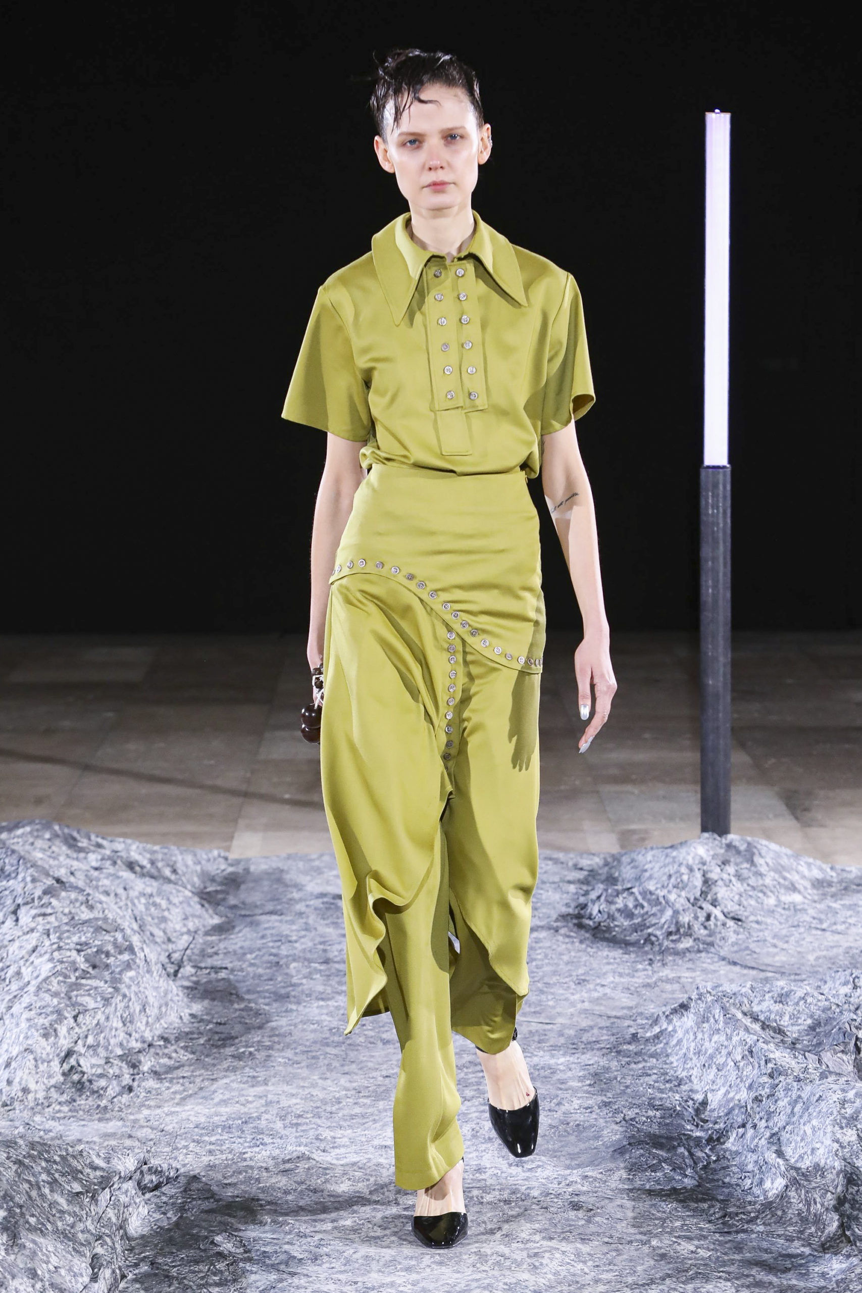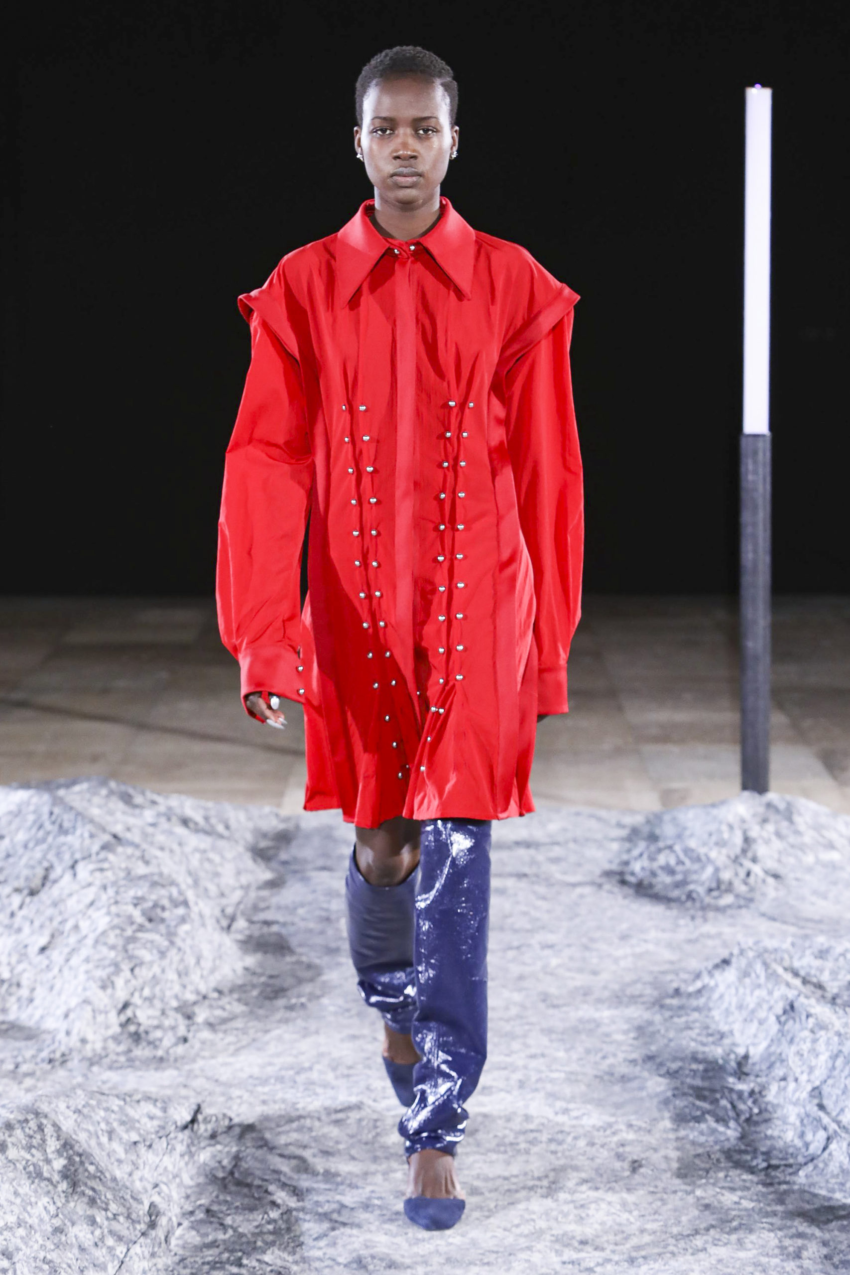 Comme signatures de Mazarine, les boutons et les vagues parcourent les différentes silhouettes de la collection et les versions métalliques sont autant de constellations imaginaires.