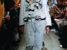 FACETASM is well known in the fashion world for their philosophical and deconstructive approach to design, creating clothes that are both conceptual and wearable, masculine and feminine. Often it’s about taking something apart, re-engineering it, and putting it back together in a strange and fascinating new way. For Levi’s® x FACETASM, that conceptual approach mainly involved mutilating and twisting a range of Levi’s Truckers—like adding FACETASM’s signature silhouette to the Type I and Type III trucker, transforming a classic biker jacket into a new ‘Biker’s Trucker’. The collection also includes the shredded, deconstructed, and tied-together (with deerskin leather) Linked Trucker, and the Wide & Slim Trucker, that incorporates two unique patterns, creating different trucker sizes on the left and the right. Jeans, too, get the twisted treatment, with a deconstructed/reconstructed Linked 501® to match the Linked Trucker, a Wide & Slim 501® to match the Wide & Slim Trucker, and a Twisted Denim jean with ultra-twisted seams, the Wide & Slim pants and the Twisted Denim being two of FACETASM’s iconic original designs.