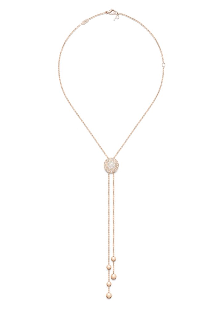 Cette année, nous proposons un nouveau service de personnalisation qui permet aux clients de faire graver le dos d’un pendentif Possession pour le transformer en porte bonheur. Ces merveilleux colliers se déclinent en or blanc ou rose et sont dotés d’un motif central en forme de cabochon qui peut se retourner sur lui-même. L’un des côtés du motif est orné de 46 diamants taille brillant (env. 0,48 carat), tandis que l’autre reste vierge pour accueillir une gravure personnalisée, comme une date, un chiffre porte-bonheur, des initiales ou un symbole. Le motif extérieur est également serti de diamants sur un côté, vous permettant de porter votre collier de différentes façons.