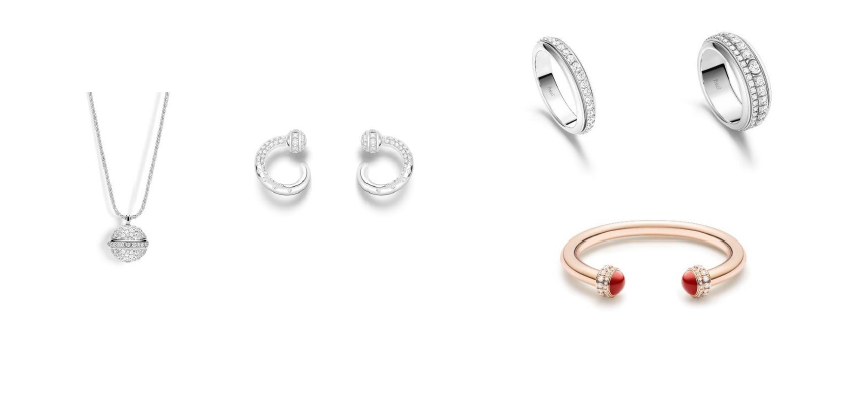 Plusieurs créations qui existaient en or rose sont désormais disponibles en or blanc, notamment le long pendentif tournant Piaget Possession, entièrement pavé de diamants (205 diamants taille brillant, 2,63 carats env.), les créoles Possession pavées de diamants dotées d’un anneau tournant (104 diamants taille brillant, 0,57 carat), une bague Possession avec un anneau tournant (36 diamants, 0,70 carat) et un diamant serti en demi-lune, ainsi qu’une bague Possession composée de deux anneaux tournants – l’un comportant des diamants plus gros que l’autre – et d’un diamant serti en demi-lune (74 diamants taille brillant, 1,33 carat). Un grand bracelet Possession en or rose fait également partie des nouveautés de l’année, avec ses deux cabochons en cornaline rouge vif et ses deux anneaux pavés de diamants à chaque extrémité (72 diamants taille brillant, 1,71 carat).