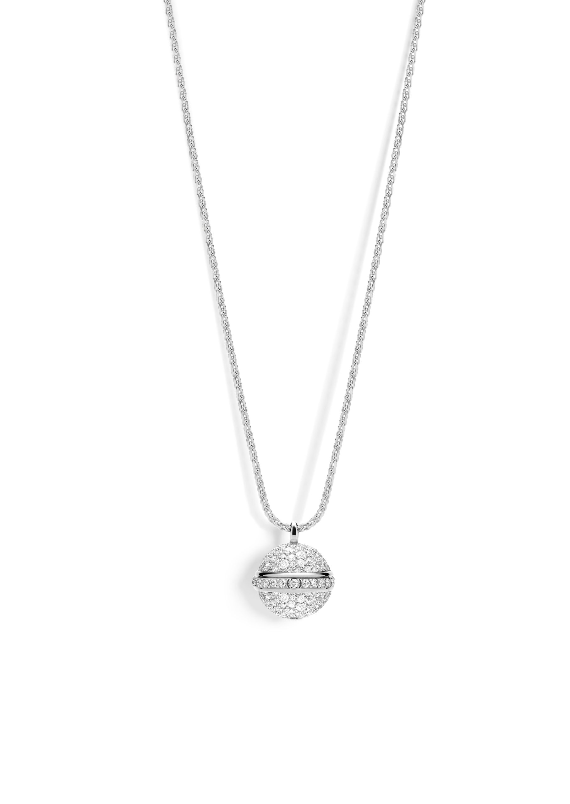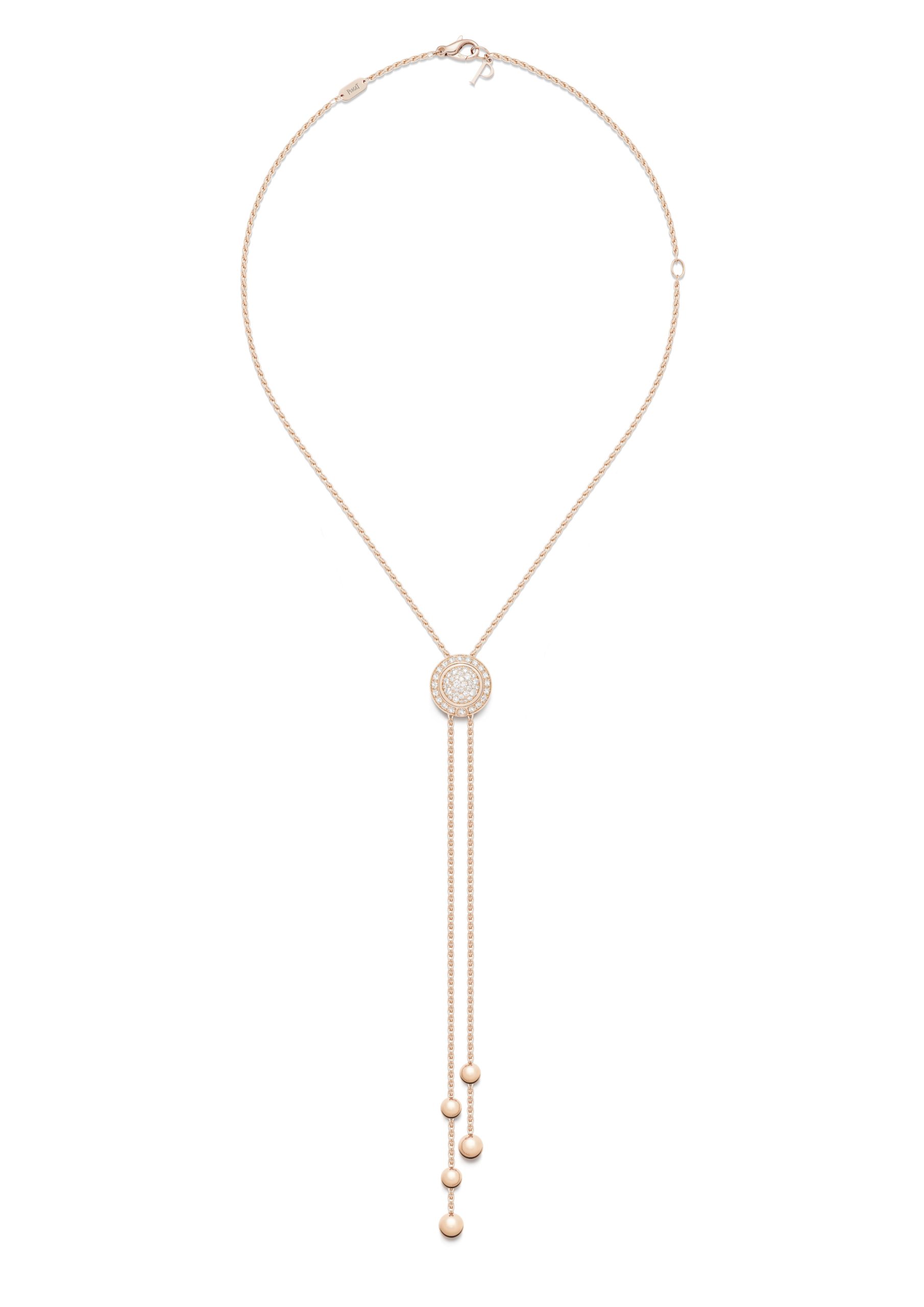 Les nouveaux pendentifs coulissants de la collection Possession sont ornés d’un motif cabochon fixe serti de 55 diamants taille brillant (env. 0,68 carat) cerclé d’un anneau tournant serti de diamants. Une animation supplémentaire permet de faire glisser le motif le long de la chaîne pour régler la longueur du collier, permettant de porter le pendentif coulissant de mille façons différentes. L’extrémité de chaque chaîne est lestée de délicates billes en or – deux d’un côté et trois de l’autre – pour apporter une touche d’élégance à toutes vos tenues.