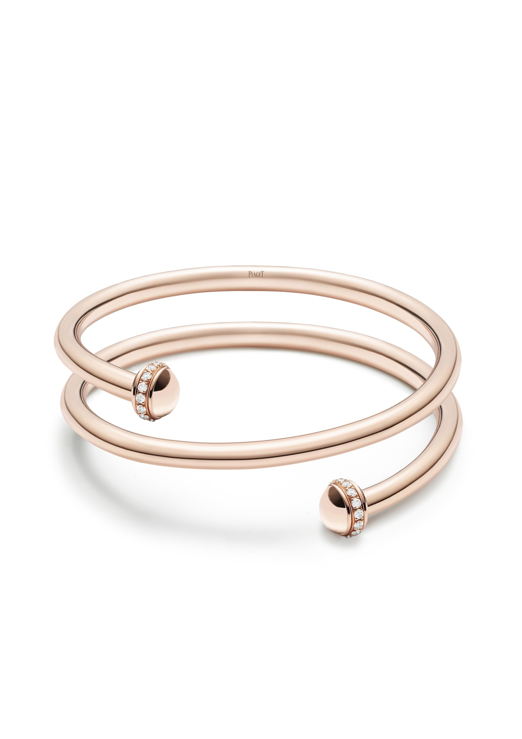 La collection de bracelets Possession s’agrandit elle aussi cette année, avec des créations plus généreuses et plus étincelantes. Elle propose notamment un bracelet qui s’enroule autour du poignet en un double tour sophistiqué et qui arbore des cabochons en or rose et des anneaux tournants sertis de diamants à chaque extrémité (30 diamants taille brillant, 0,42 carat).