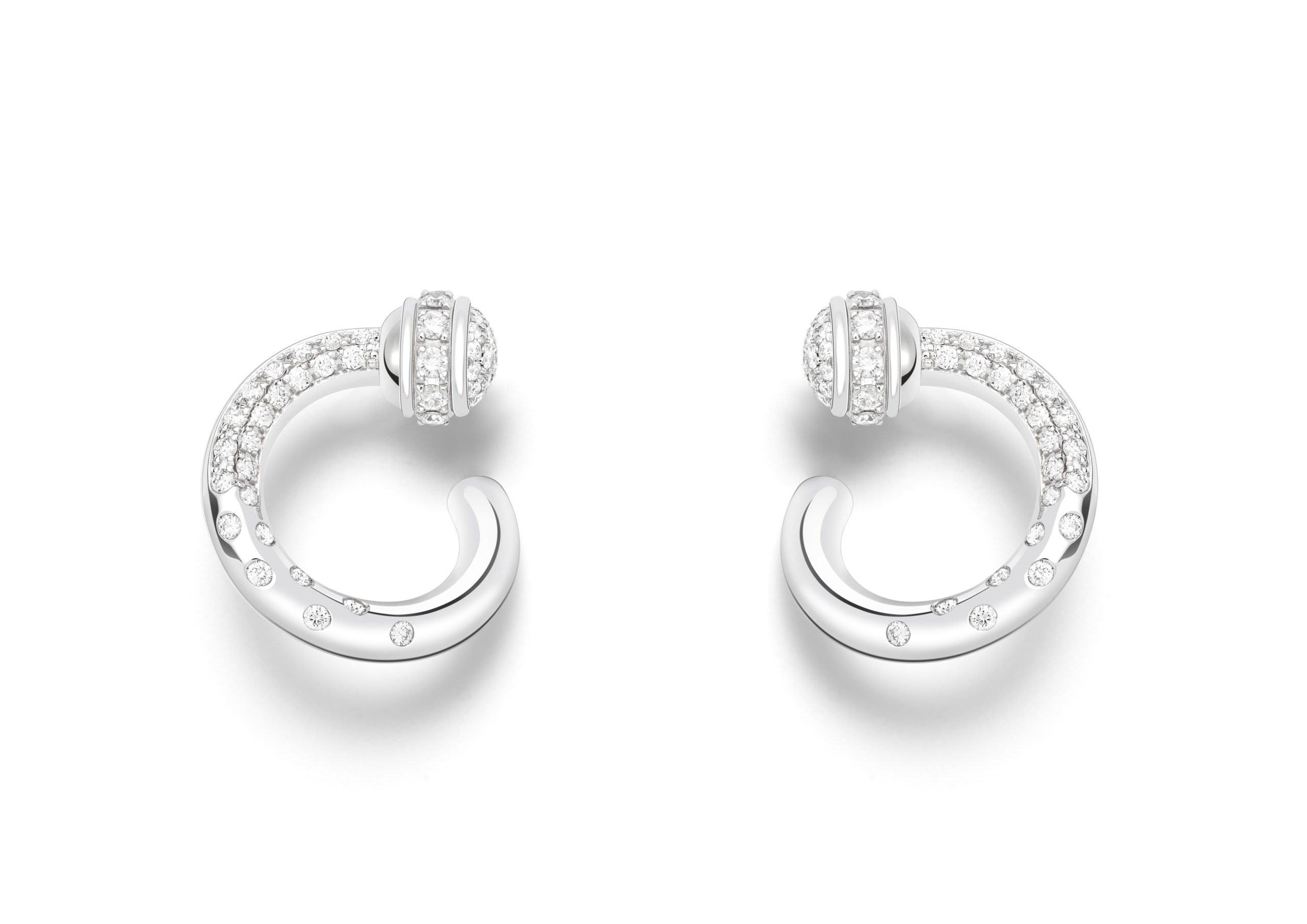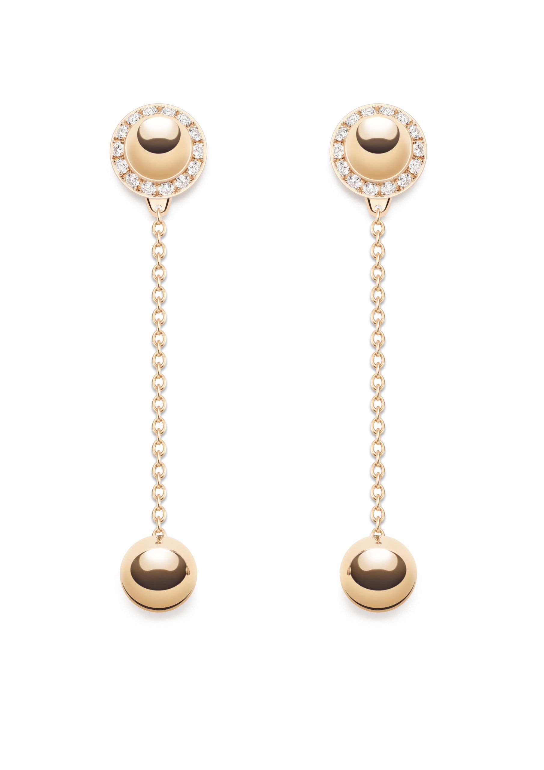 Cette année, une nouvelle paire de boucles d’oreilles en or rose rejoint la collection Possession. Elle se compose de billes en or rose suspendues sous l’oreille ainsi que de clous d’oreilles sertis de 28 diamants chacun (env. 0,32 carat). Vous pouvez les porter de différentes manières : clous d’oreilles seuls, clous accompagnés des perles, ou encore de façon asymétrique si vous le souhaitez.