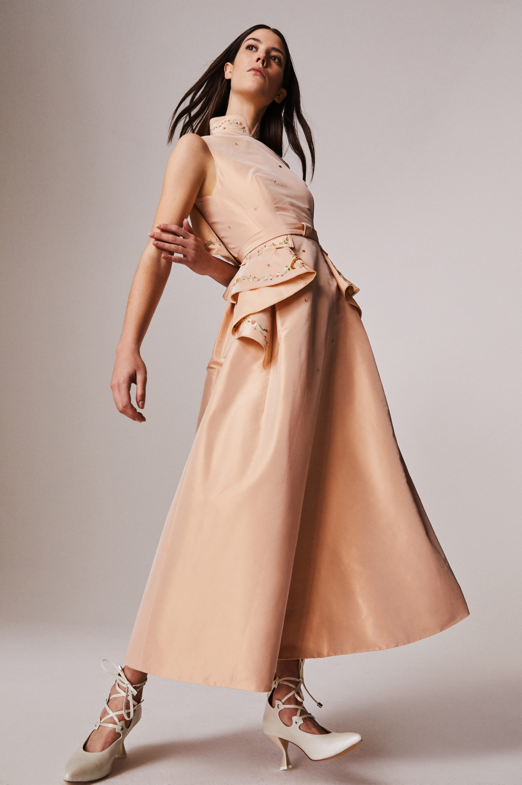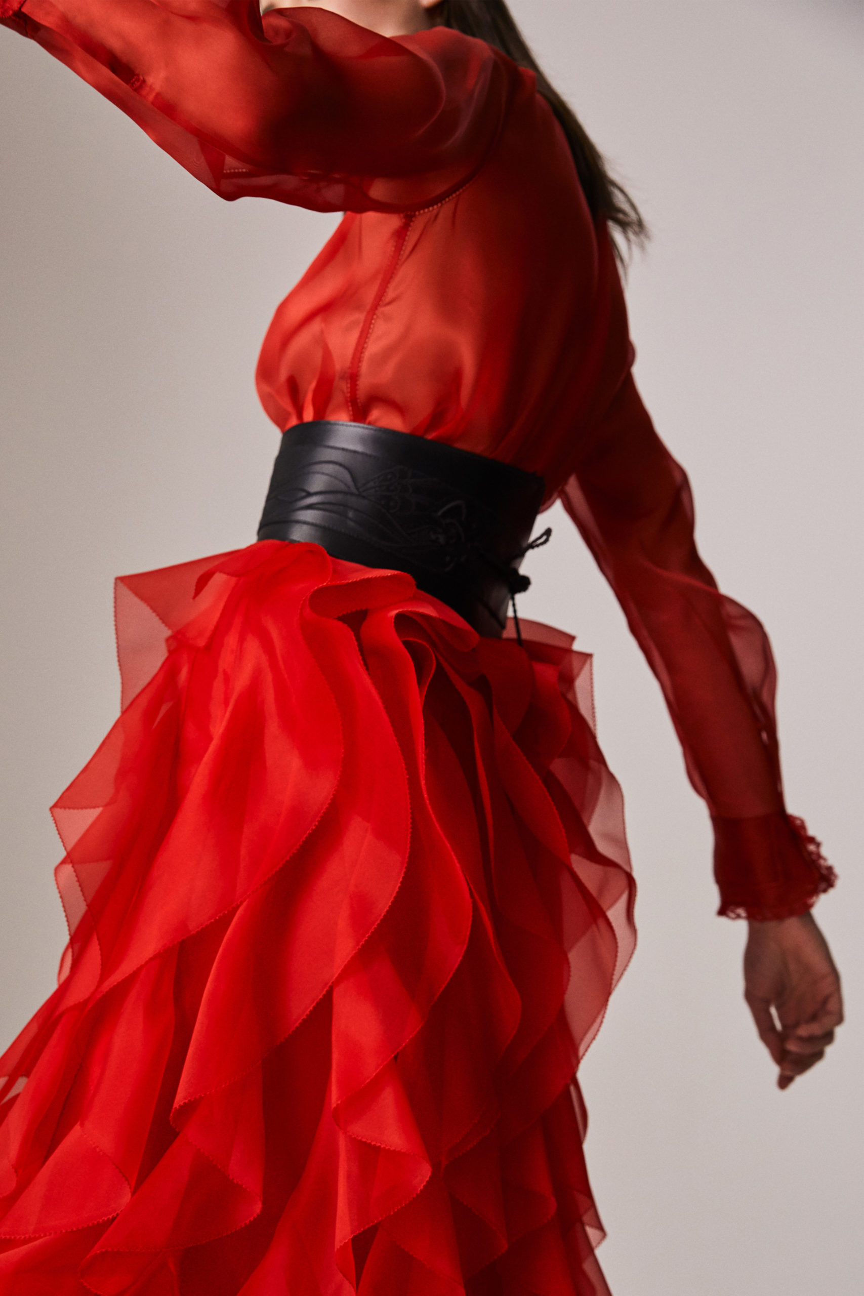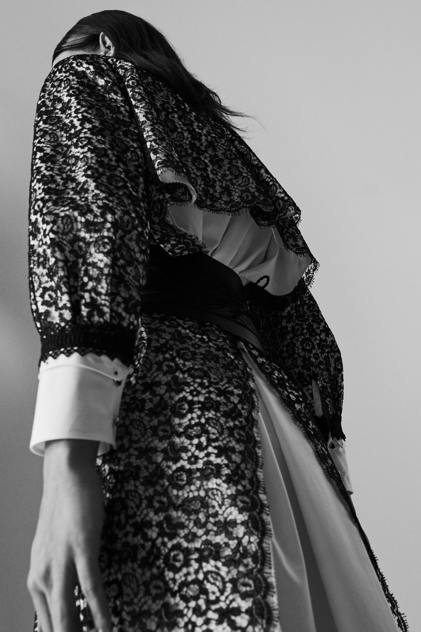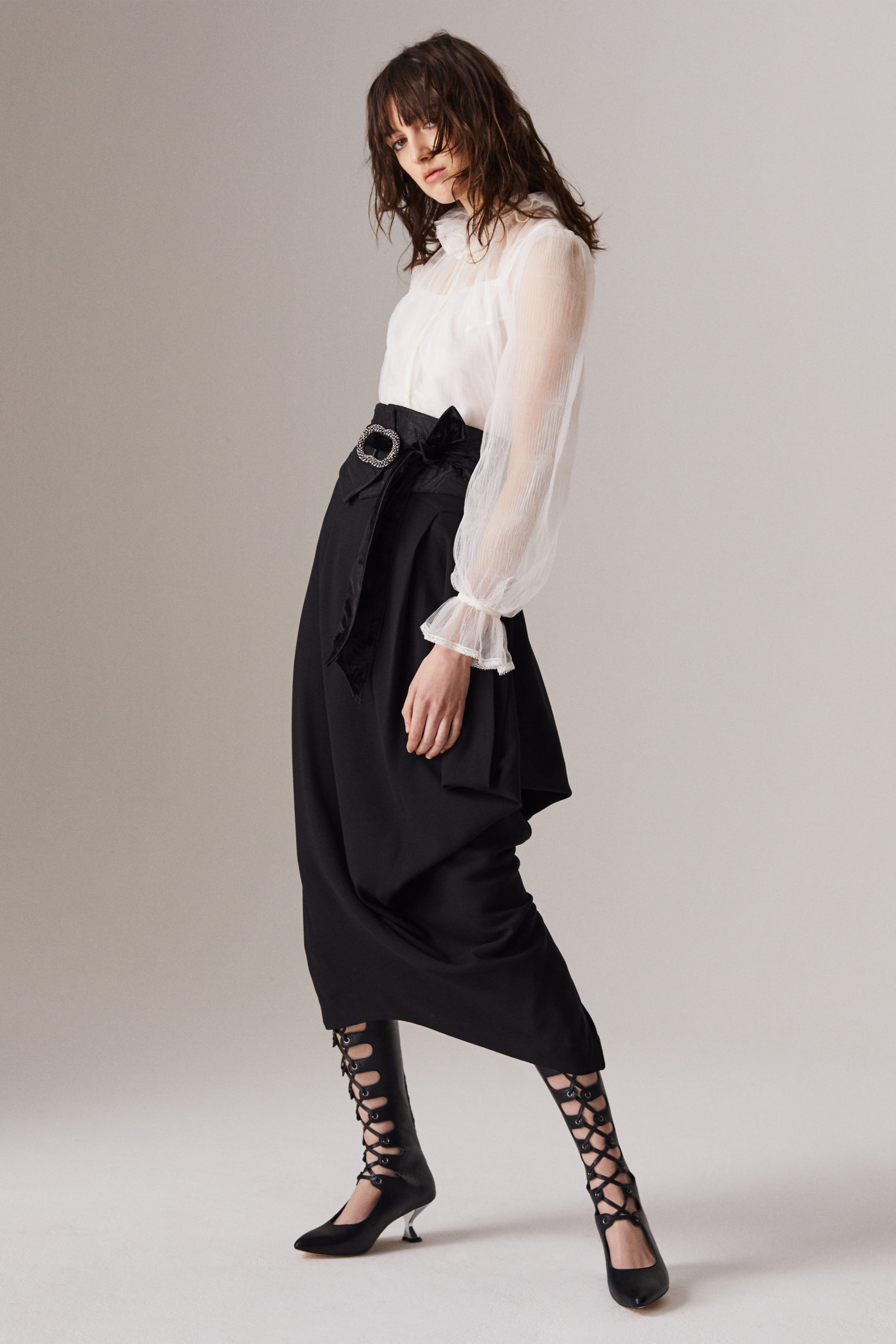 The contour of this season builds on the combination of clothing cultures from the east and the west, elevating classical elements with a modern look. The upper body speaks a variety of languages with the regal Baroque style coinciding with the cloud collar and elaborate headdress common to the Beijing Opera, laces and embroidery turning the band collar into an intricately layered collar and mantelet. Wavy curves and asymmetrical pleats are generously adopted in the entire collection, with the use of lantern sleeves echoing the theme by adding volume to the pieces.