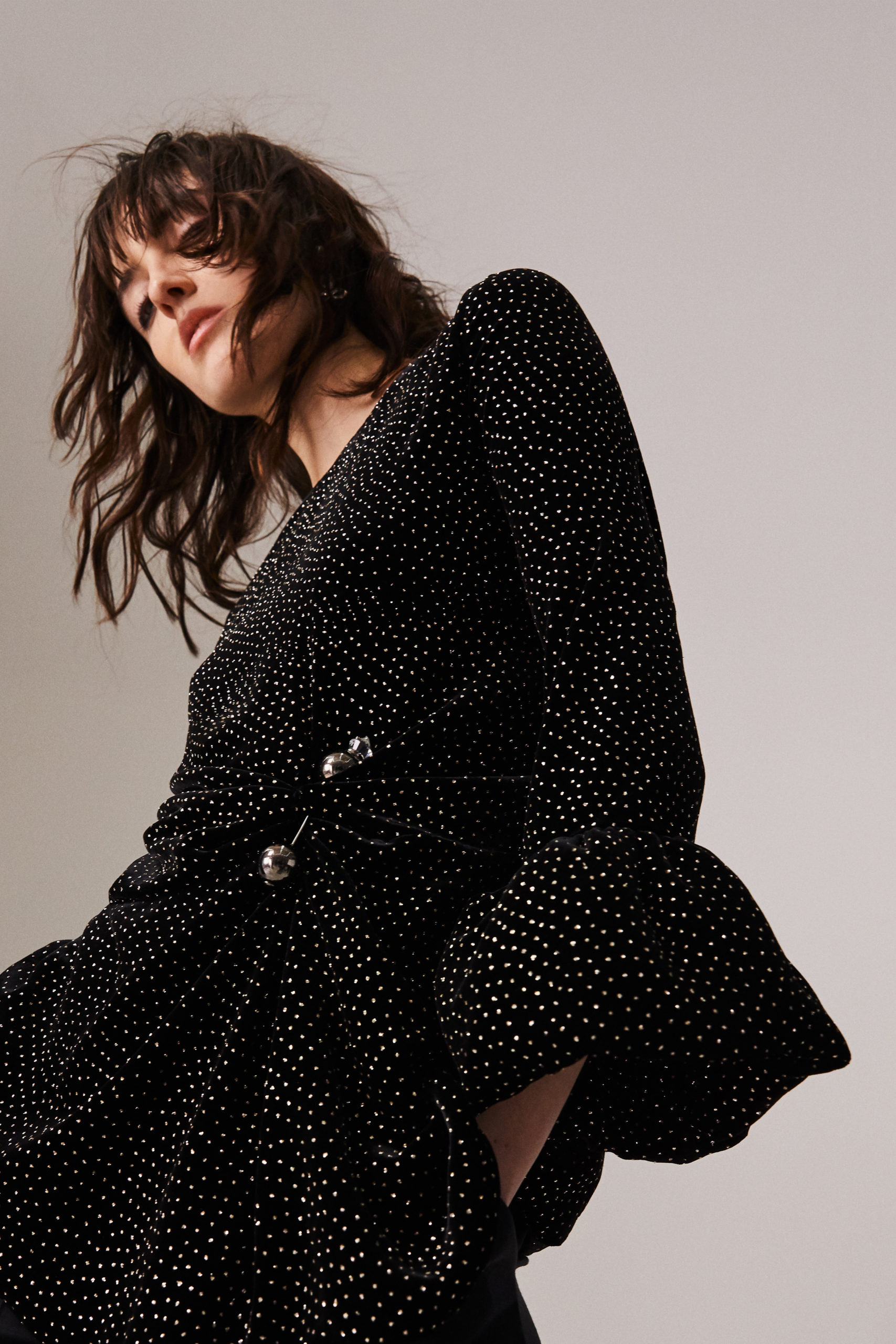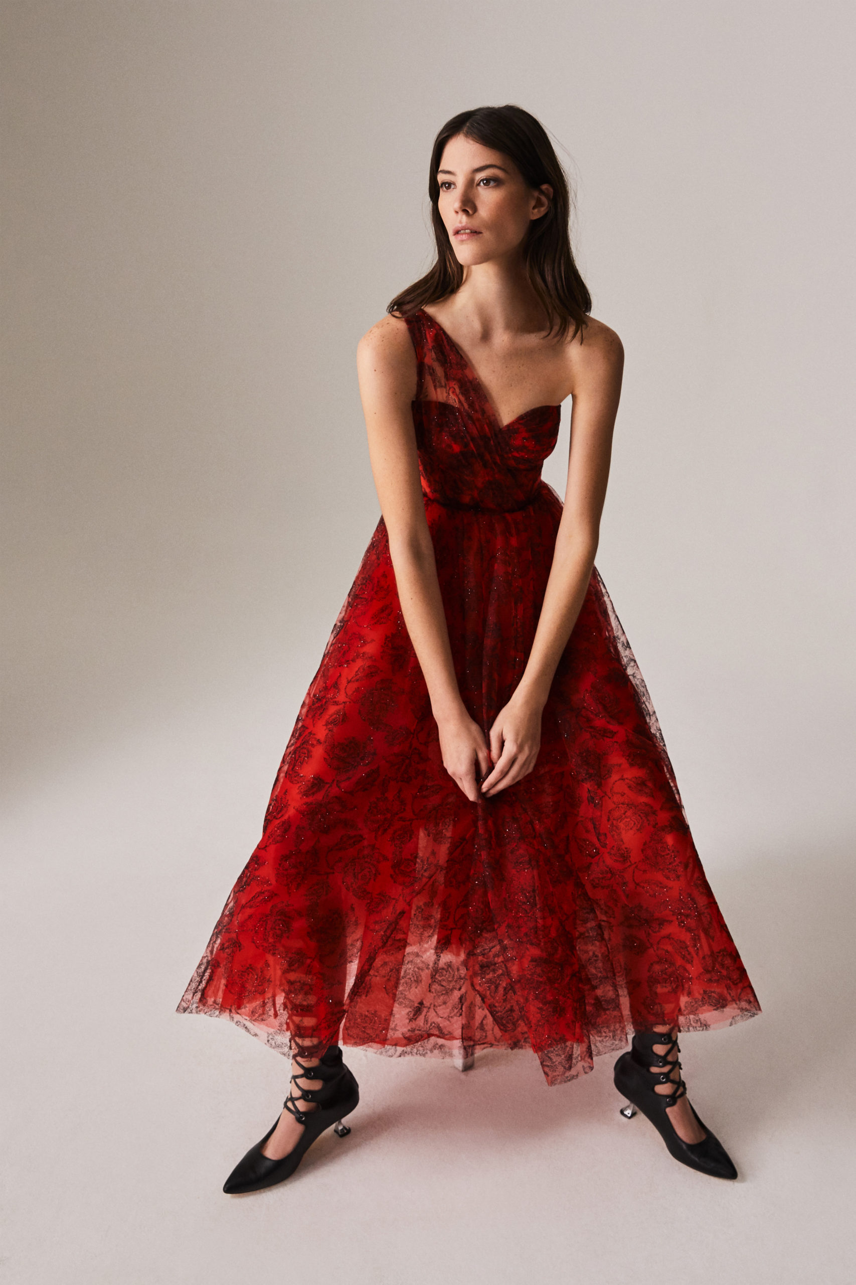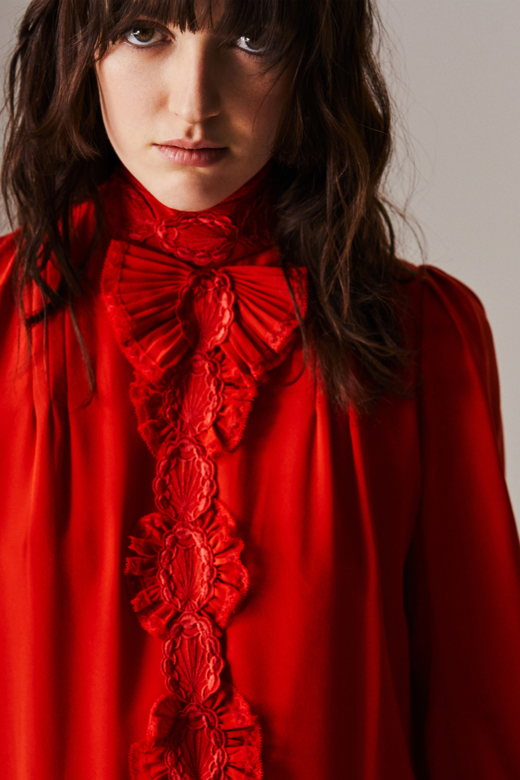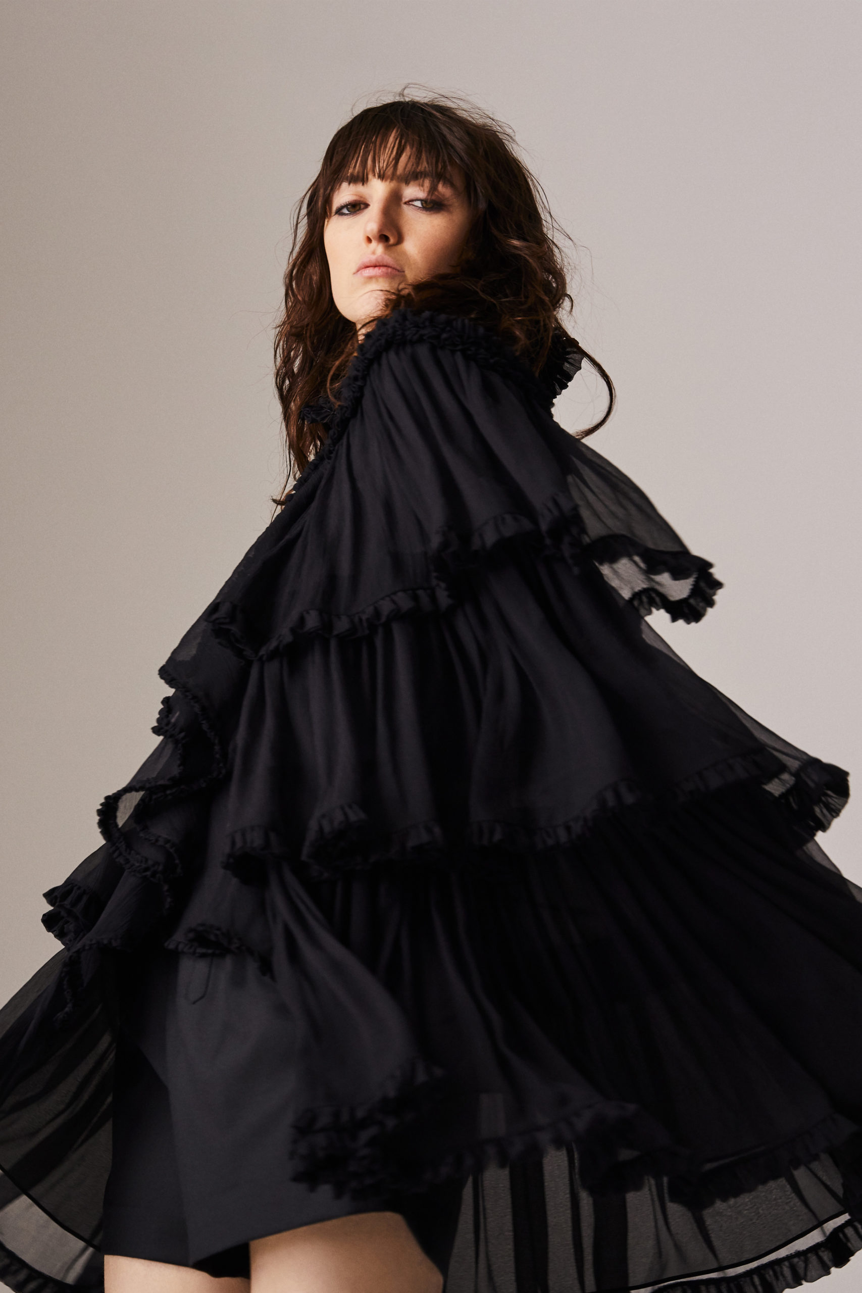 The contour of this season builds on the combination of clothing cultures from the east and the west, elevating classical elements with a modern look. The upper body speaks a variety of languages with the regal Baroque style coinciding with the cloud collar and elaborate headdress common to the Beijing Opera, laces and embroidery turning the band collar into an intricately layered collar and mantelet. Wavy curves and asymmetrical pleats are generously adopted in the entire collection, with the use of lantern sleeves echoing the theme by adding volume to the pieces.