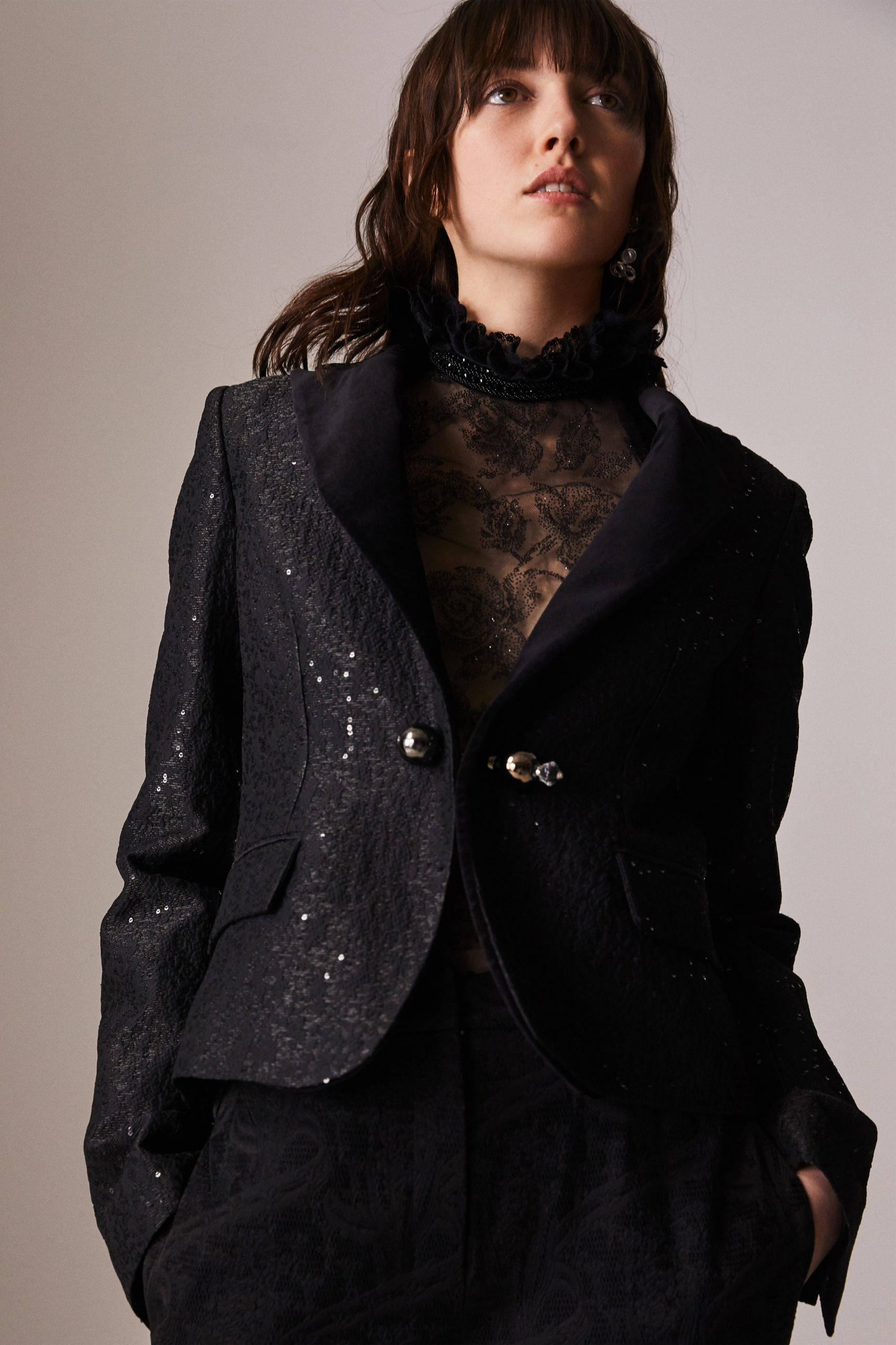 Metallic fabrics are extensively used to create the different shades often seen in the theater. Jacquard printing on yarn is attempted for the first time while maintaining the SHIATZY CHEN tradition of embracing and experimenting with different textiles. From classic sheer organza, chiffon and French Solstiss lace, to cozy wool, silk velvet that drapes beautifully, the Italian jacquard textile with that ambiguous metallic sheen, and the luxuriously smooth satin and silk.