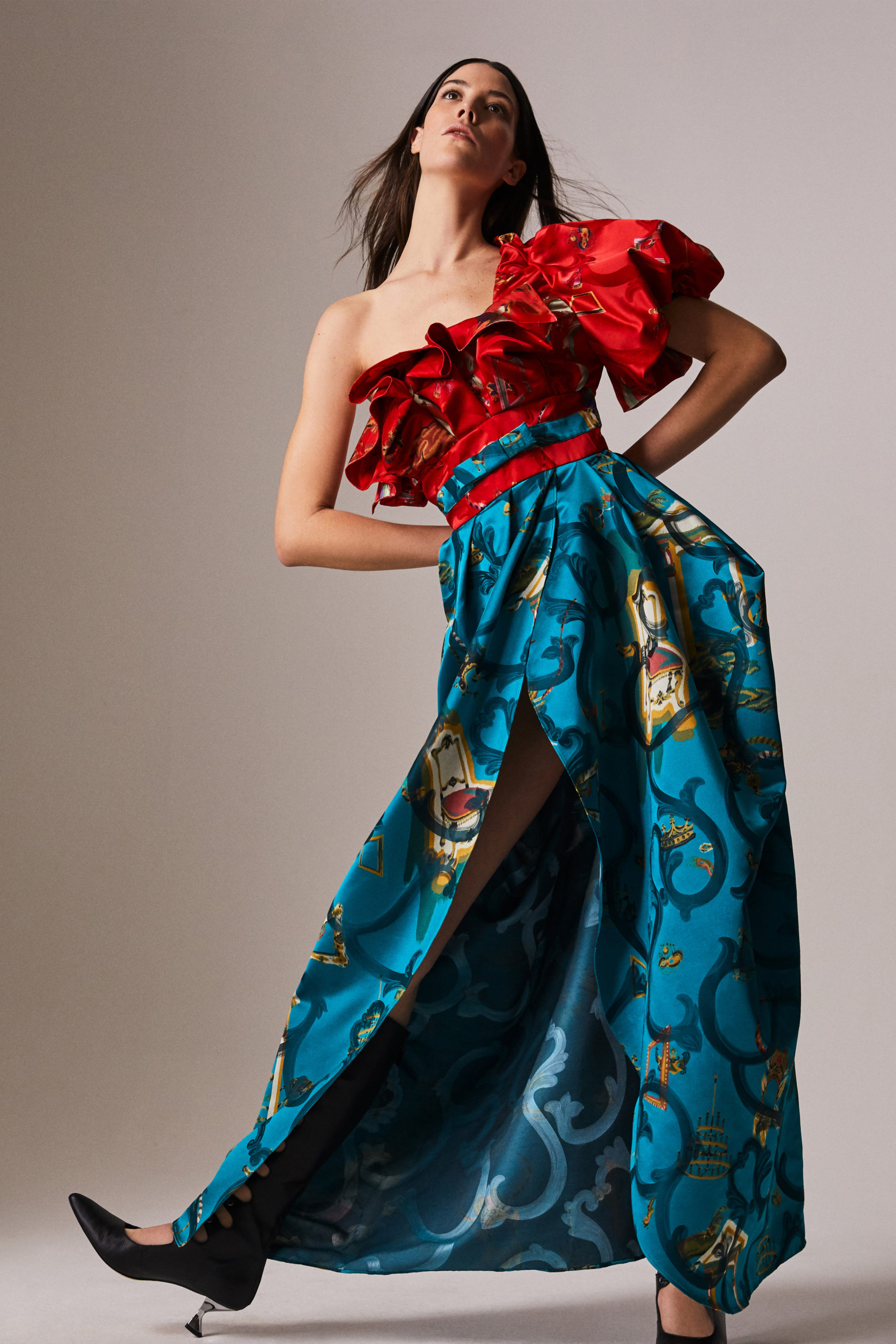 With the mysterious black as canvas, fiery red, snowy white and that gentle skin tone interlaces, the classic contrasting colors of black, red and white coupled with the luxurious luster natural to the textiles highlight the theatrical tension inherent in this collection; the finishing touches of gaudy turquoise and multi-colored jacquard totems point to the cheerfulness of a play.