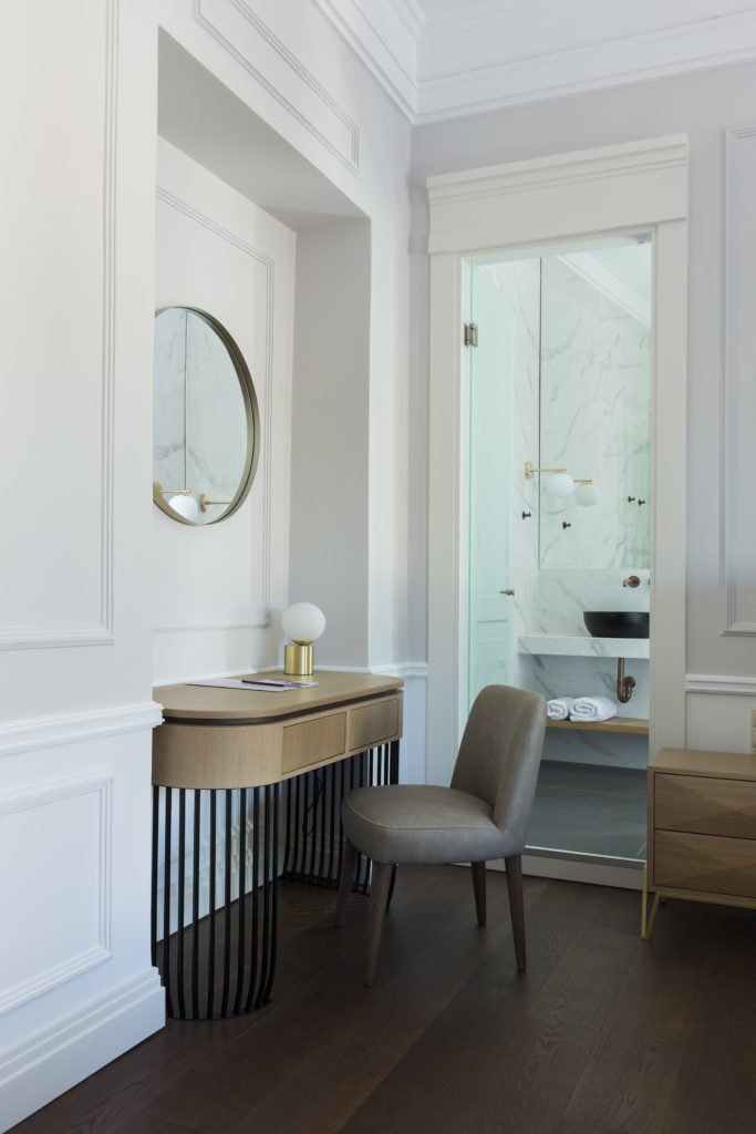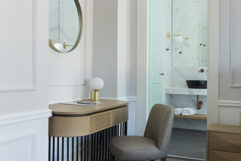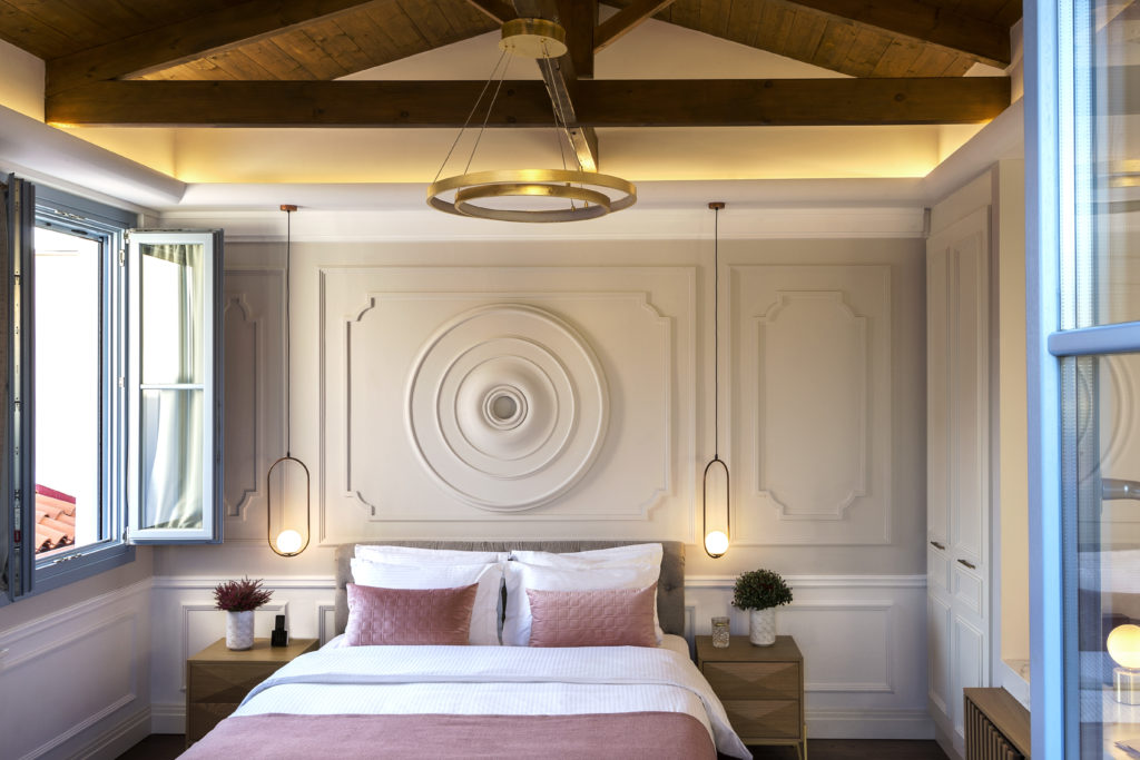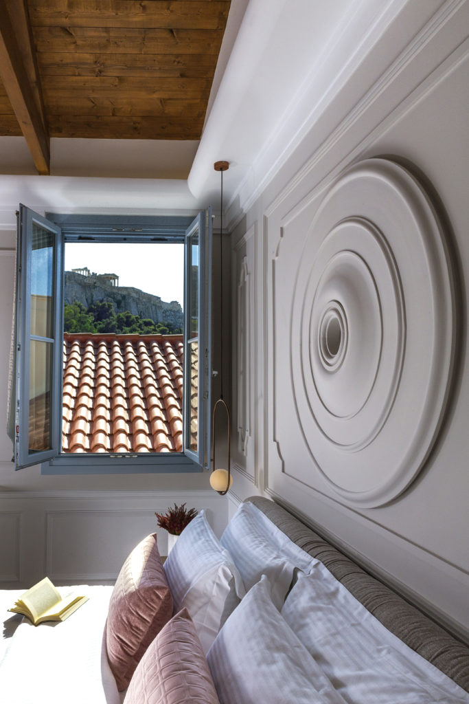 Chaque suite est unique, une évasion urbaine baignée de teintes terreuses et de nuances de gris, au design éclectique mais avec le confort à l’esprit. Inspiré par la riche histoire de la ville avec un clin d’œil à la modernité, l’intérieur séduit les sens en comblant le fossé entre romantisme et sophistication. L’histoire du bâtiment, le quartier et les scènes entourant les suites A77 par Andronis ont énormément influencé l’esthétique du design. Des lignes épurées et simples et un jeu avec la géométrie s’harmonisent avec les détails architecturaux néoclassiques évidents partout. Le marbre, le bois, les touches en laiton et les plafonds en gypse avec des détails en corniche se mélangent avec des draps doux et du velours pour créer un environnement d’une élégance irrésistible. Le luxe est là, sobre, séduisant. Le sens de l’endroit et de l’emplacement est évident partout, encadré par les vues emblématiques de l’Acropole, de Plaka et des toits d’Athènes. Les 12 suites sont réparties sur 4 étages et dans 5 styles: la petite, l’élégante, la suprême, l’iconique et la cour. Étant les joyaux de la collection de suites, ces deux derniers sont difficiles à battre. Située au dernier étage, la suite Iconic offre l’expérience de séjour la plus phénoménale à ce jour. La terrasse extérieure meublée et privée offre une vue spectaculaire sur l’Acropole, tout en disposant d’un jacuzzi pour profiter du meilleur de la ville d’Athènes. Avec une cour extérieure verdoyante pour profiter de moments de loisir sous le charme des couleurs et des senteurs