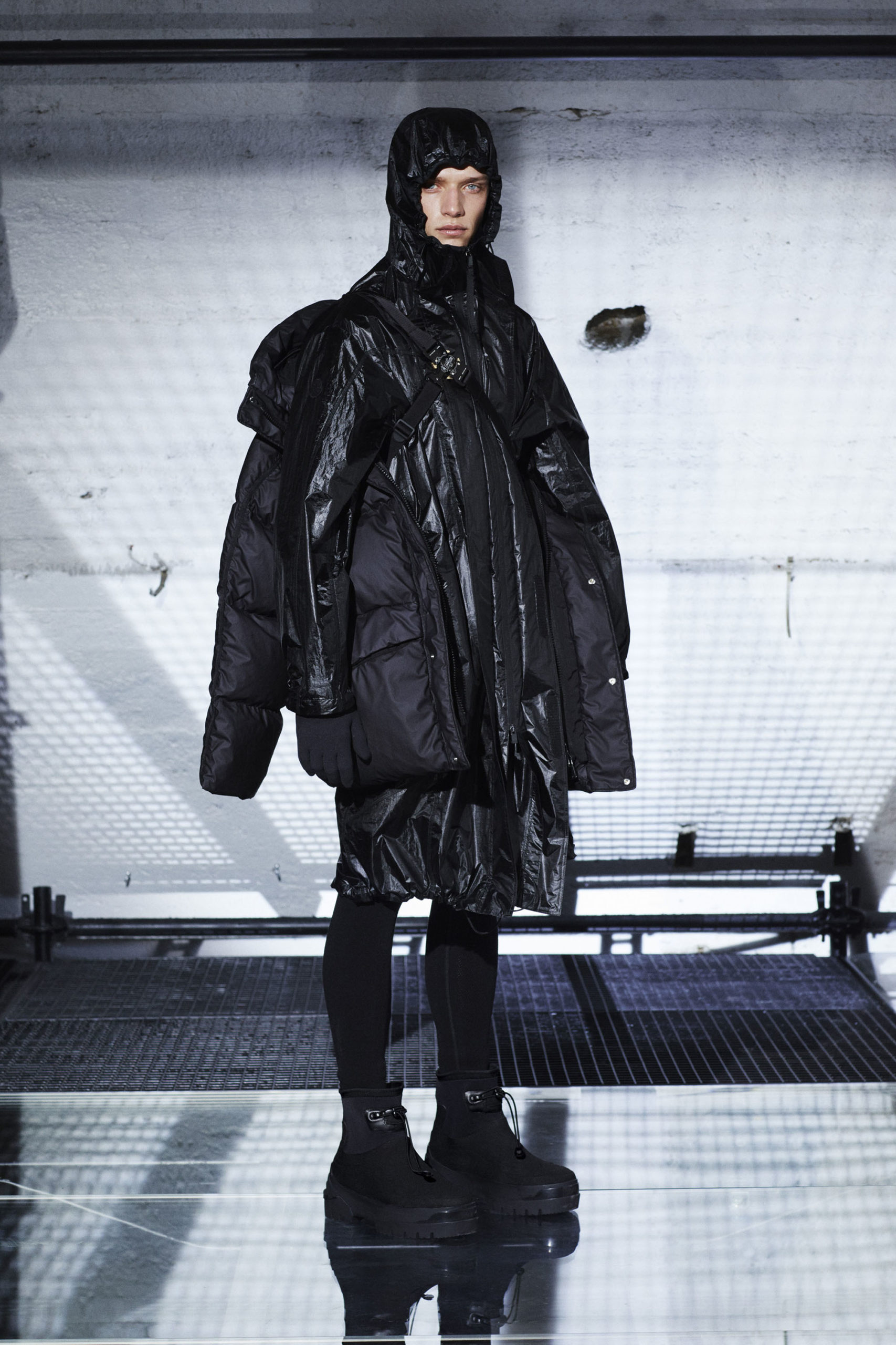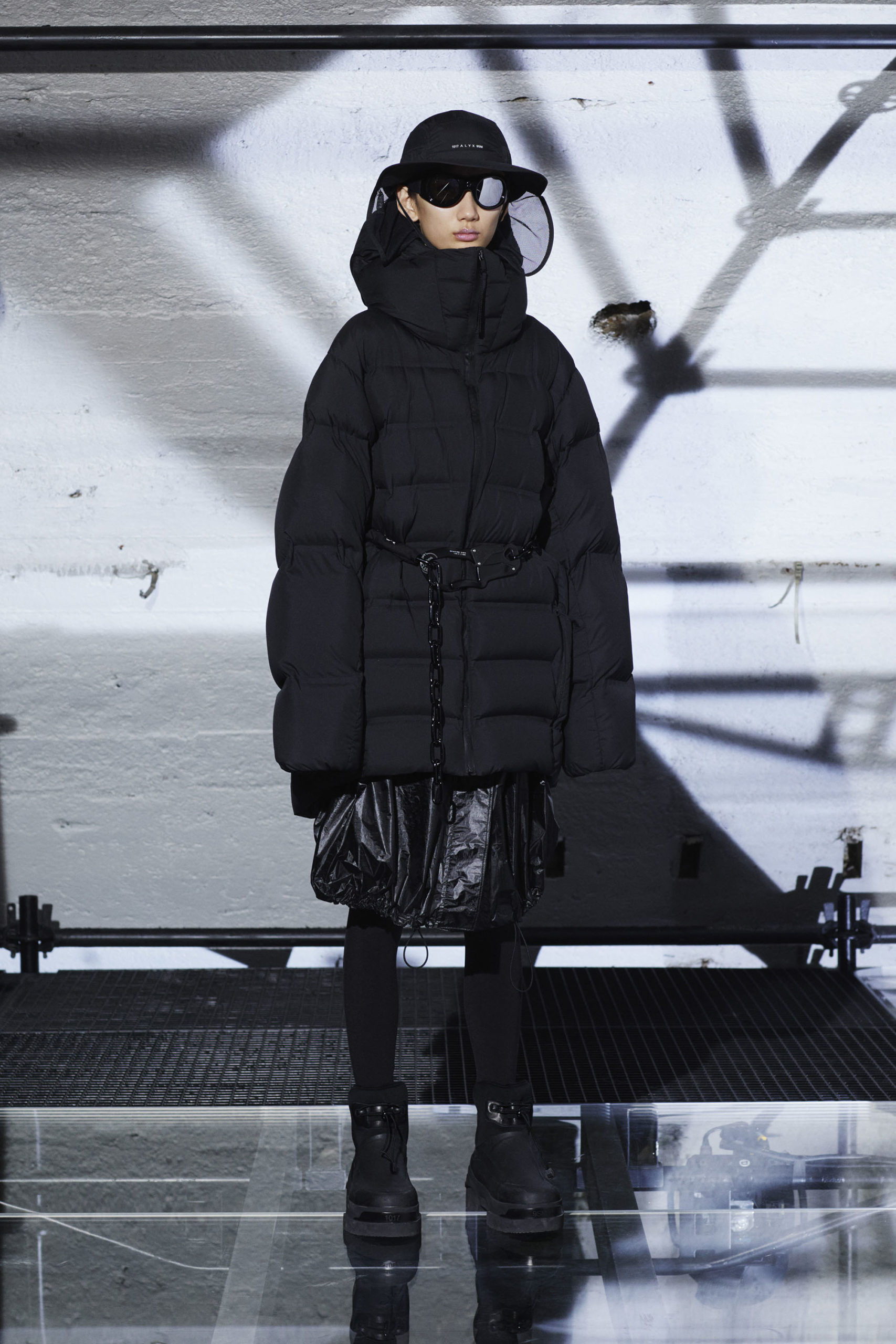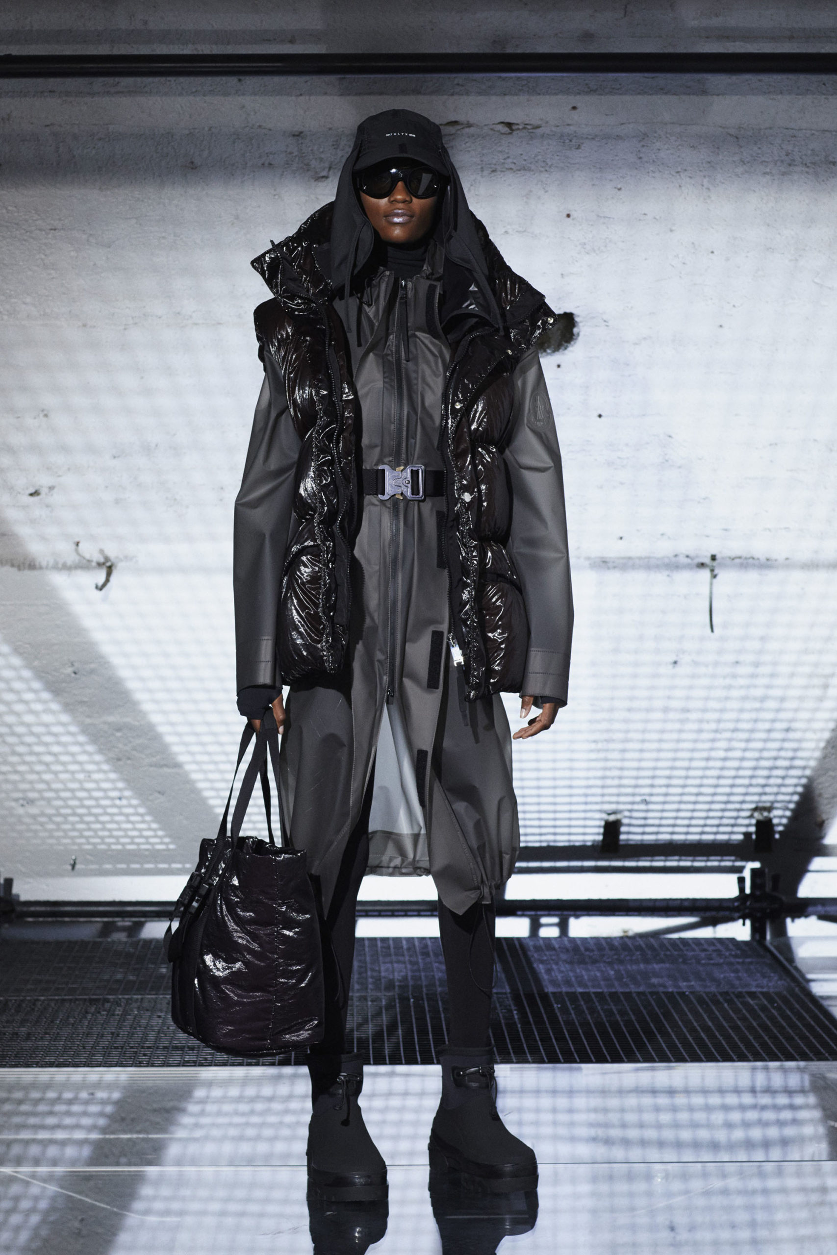 Pour Matthew Williams, fondateur et directeur artistique, 1017 ALYX 9SM reflète une sensibilité industrielle et métropolitaine dénuée de toute froideur. Il apprécie ainsi l’aspect chaleureux et naturel des choses qui ont été touchées par la main de l’homme. La collection 6 MONCLER 1017 ALYX 9SM a donc été imprégnée de ces éléments ainsi que des techniques de fabrication particulières de la marque et ses éléments emblématiques. Le confort et la fonctionnalité, indispensables à 1017 ALYX 9SM comme à Moncler, sont les bases de cette collection moderne de vêtements d’extérieur versatiles. Doudounes, parkas matelassées, anoraks coupe-vent ultra légers, vestes sans manches ou pièces en cuir auxquels s’ajoutent de la maille et des accessoires plus fonctionnels, comme des ceintures chaînes à crochets, des sacs à dos à capuche et des bottines en néoprène avec semelles en caoutchouc. L’idée est de laisser les deux ADN fusionner afin de créer des produits que Moncler n’avait encore jamais réalisés. Par exemple, les doudounes sont retravaillées par le designer afin de leur insuffler son style urbain caractéristique. Les gradations de couleurs réalisées sur une base de nylon donnent un rendu irrégulier texturé. Les techniques de soudure par ultrasons et de contrecollage sont des largement utilisés, tandis que les collants et les hauts sont fabriqués à partir d’Econyl®, un nylon « régénéré » dérivé de matériaux de rebut tels que du plastique récupéré des océans. La palette de couleurs utilisée est résolument métropolitaine : noir, gris et blanc en majorité, agrémentée de touches de rouge et orange.