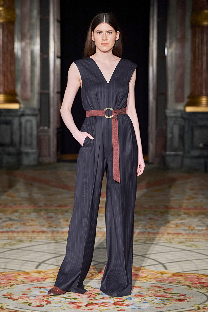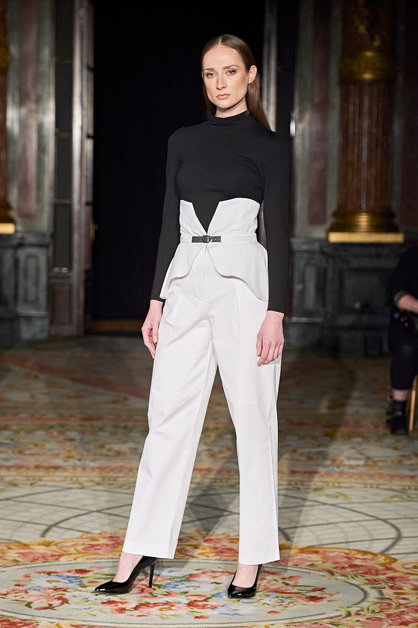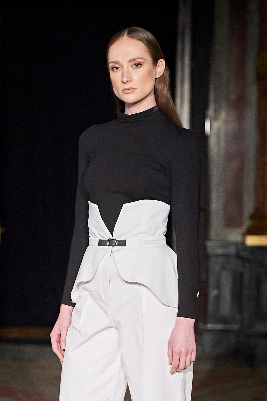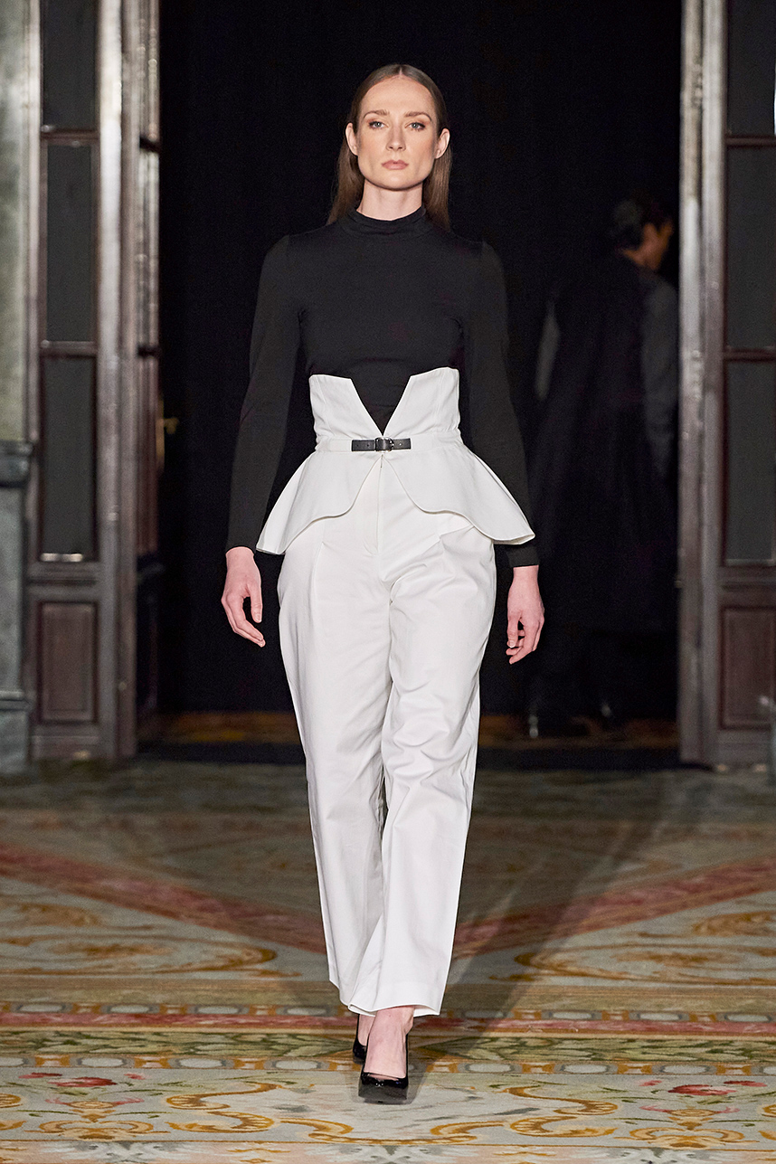 A white peplum suit corset was fresh and unexpected yet wearable and figured flattering paired with a black mock turtleneck and matching white trousers. A v-neck pinstriped palazzo pantsuit was accented by a burgundy belt seemingly inspired by the 70’s but in a completely fresh and modern way.