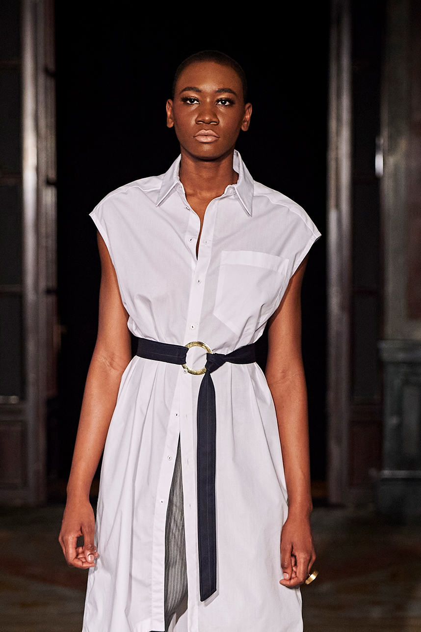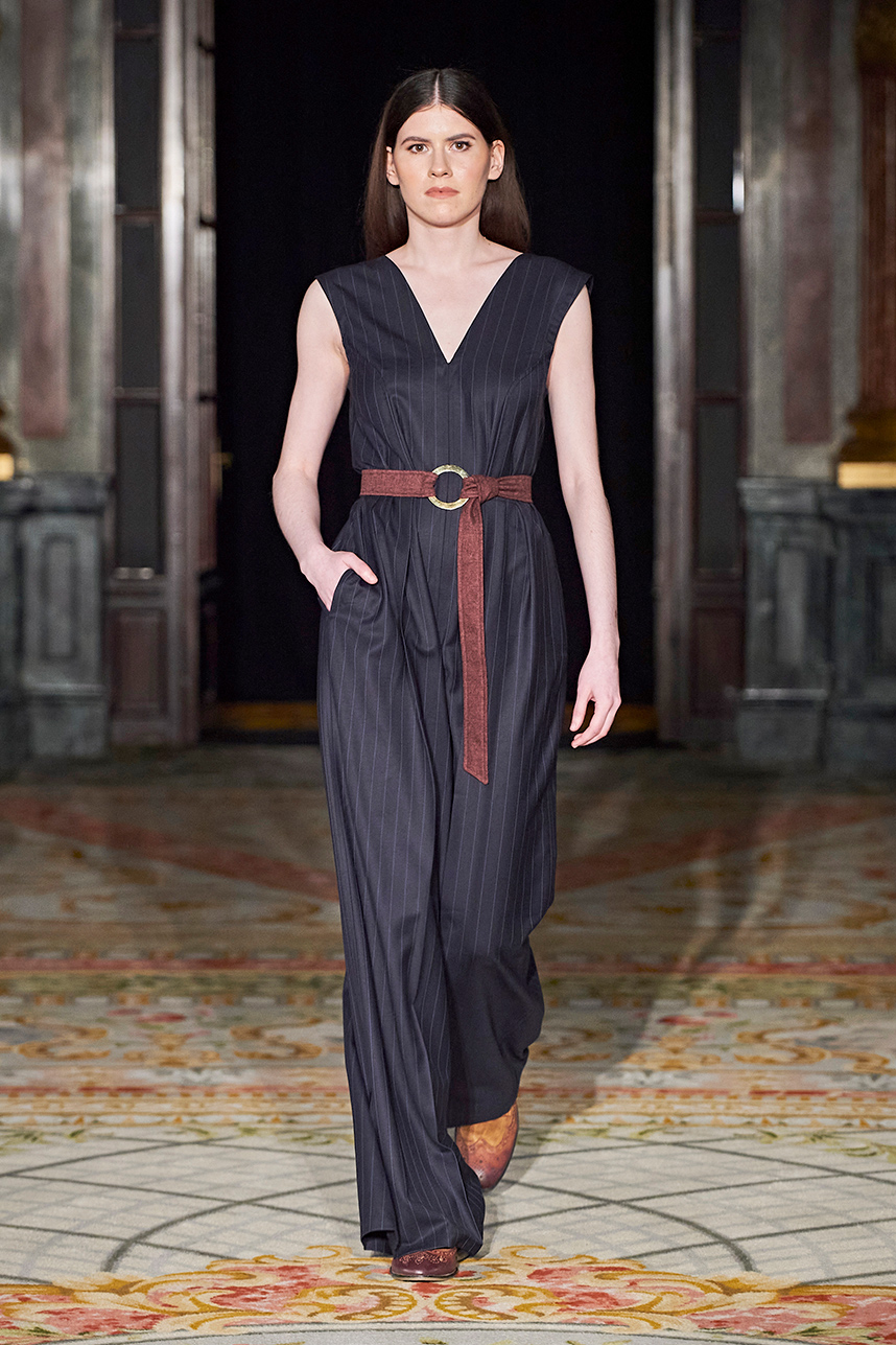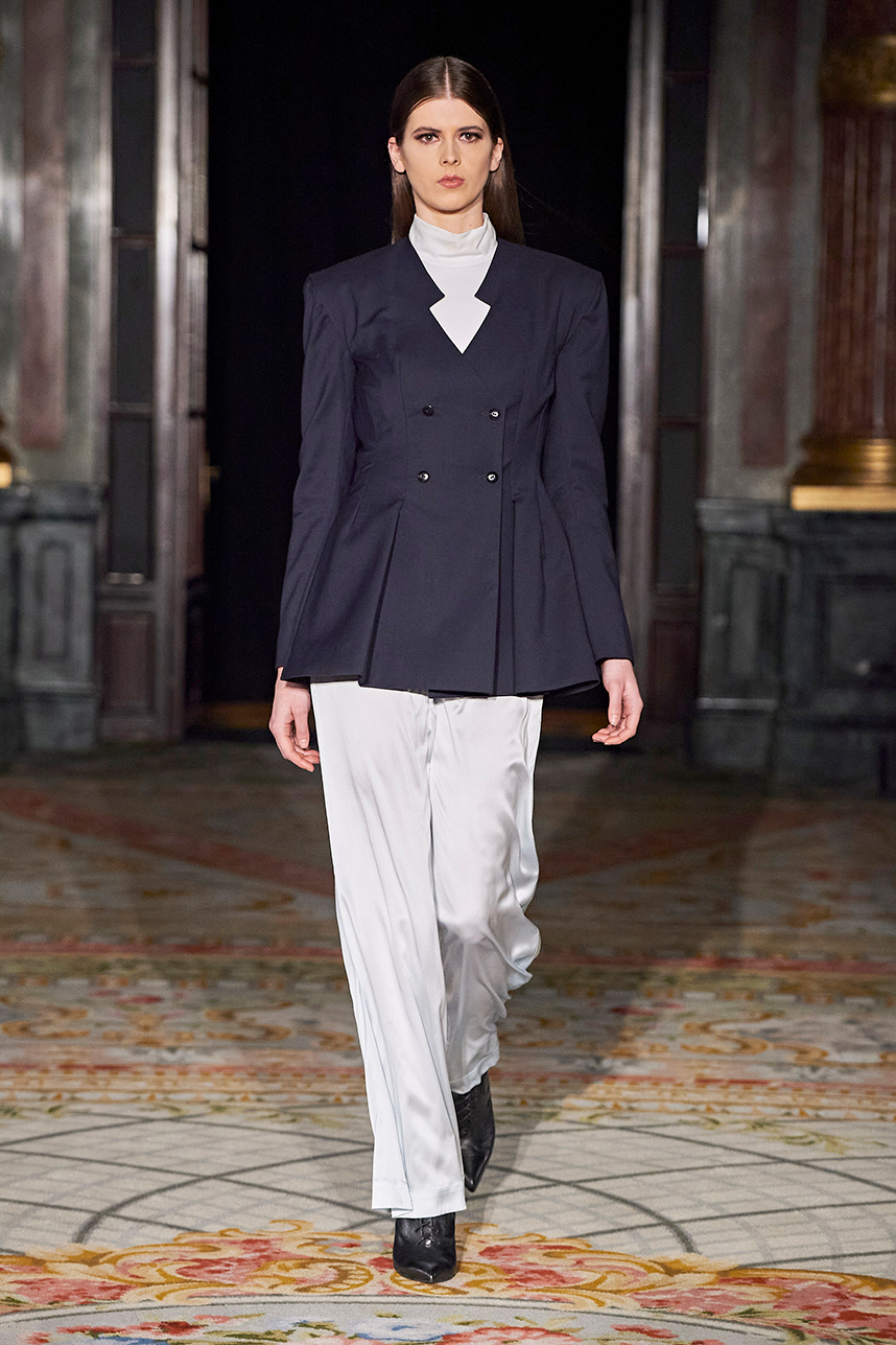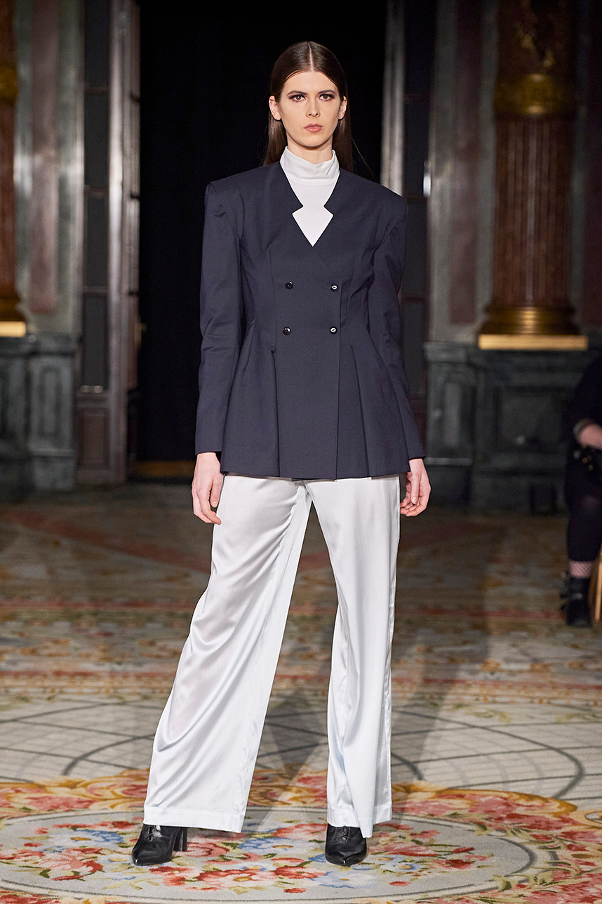 A white peplum suit corset was fresh and unexpected yet wearable and figured flattering paired with a black mock turtleneck and matching white trousers. A v-neck pinstriped palazzo pantsuit was accented by a burgundy belt seemingly inspired by the 70’s but in a completely fresh and modern way.