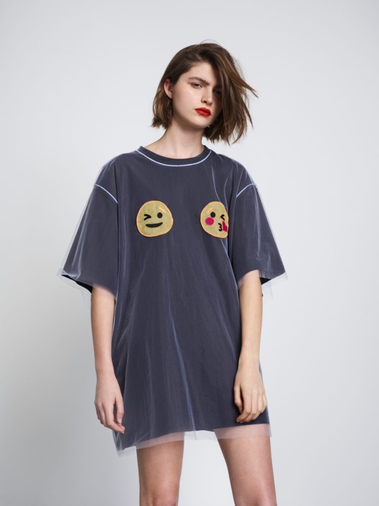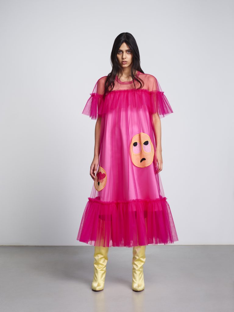 This season’s Viktor&Rolf Tulle Fall/Winter 2020 collection features a variety of playful and outspoken tulle pieces inspired by the Viktor&Rolf Haute Couture Surreal Satin collection. Three- dimensional satin daisies emerge from the garments as wallflowers plucked out of a 70s wallpaper. Tactile artworks are crafted out of a multitude of intricately placed tulle ruffles, a continuation of ‘Fashion Statements’ banal slogans in the form of emoticons.