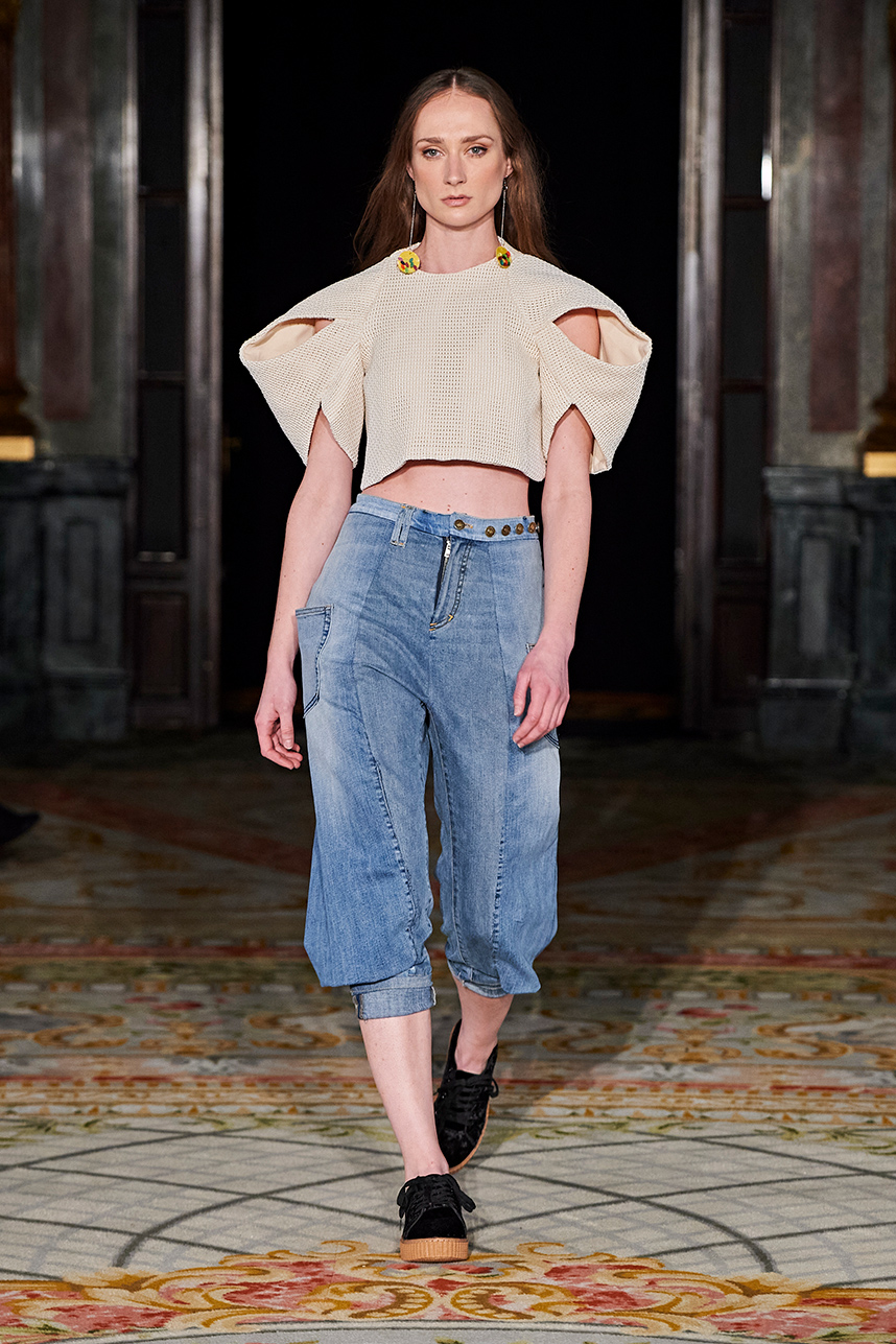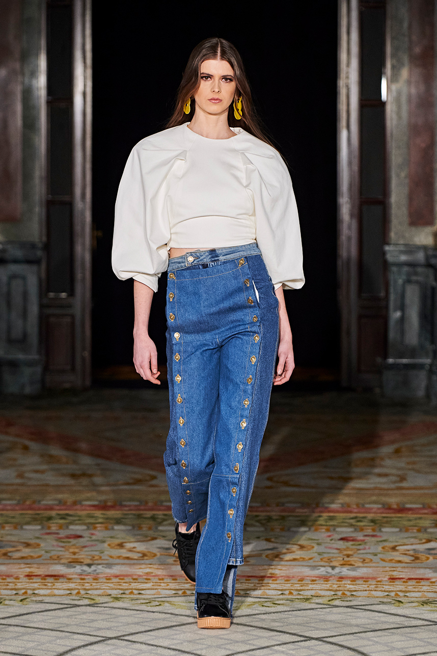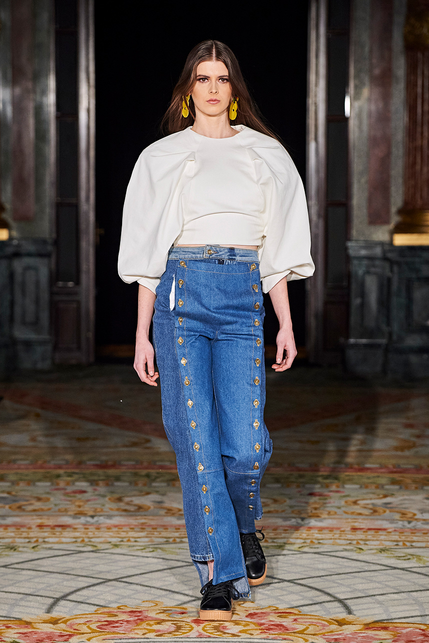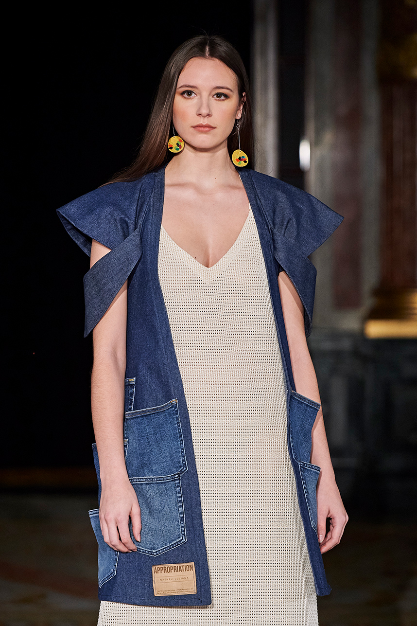 Puerto Rican designer Nashili of Netflix’s “Next In Fashion” presented her collection “Appropriation,” inspired by politics, social and religious issues. The collection featured upcycled, organic and recycled fabrics with an emphasis on denim constructed in the most interesting and architecturally structured way. Denim in various hues of blues were paired with cream, and white separates.