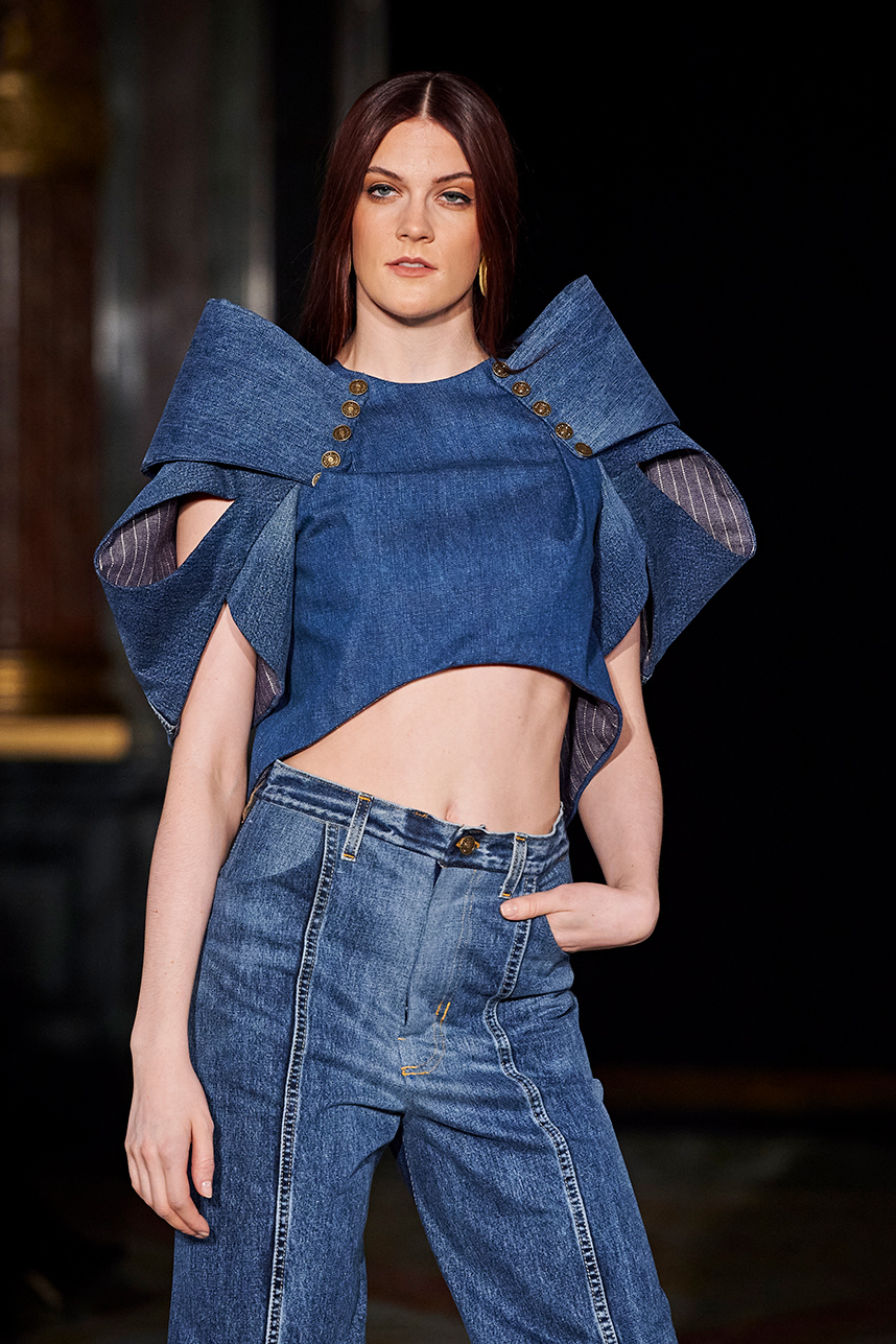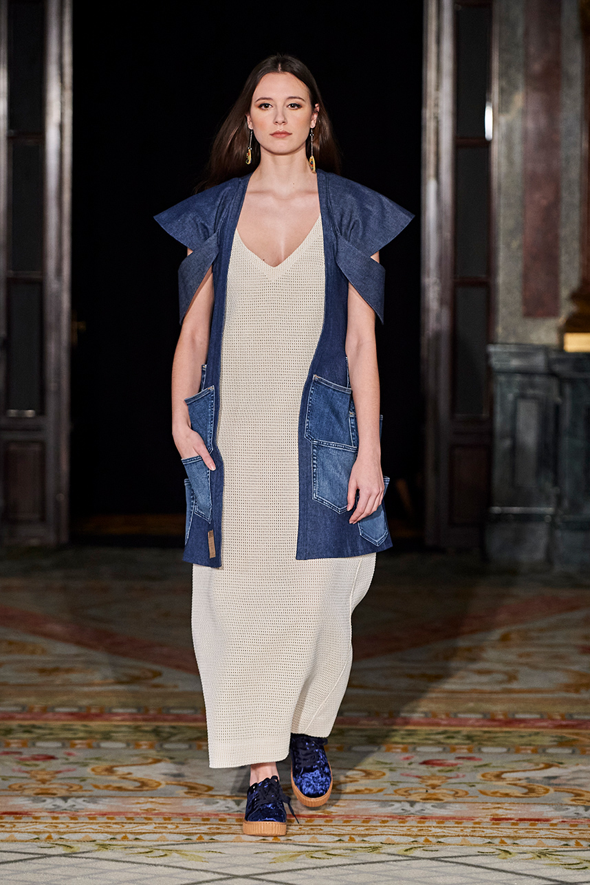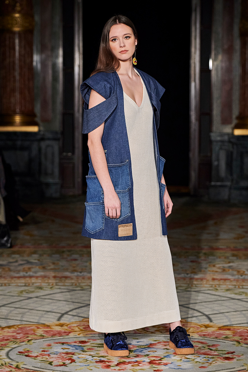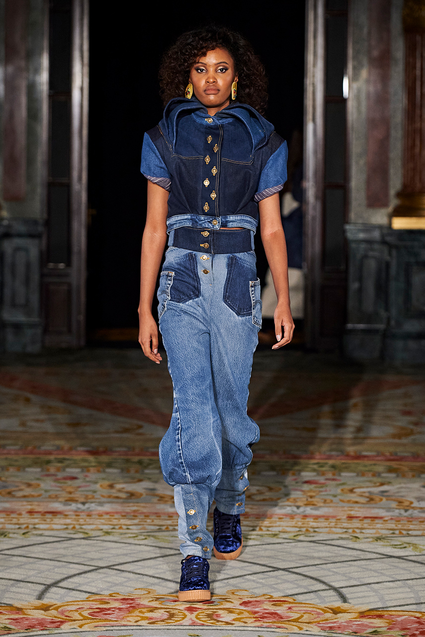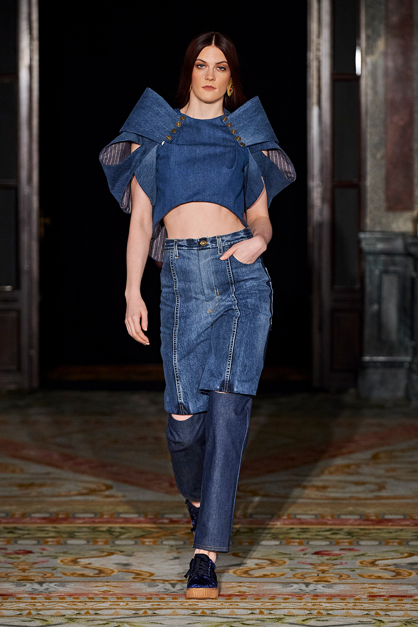 Puerto Rican designer Nashili of Netflix’s “Next In Fashion” presented her collection “Appropriation,” inspired by politics, social and religious issues. The collection featured upcycled, organic and recycled fabrics with an emphasis on denim constructed in the most interesting and architecturally structured way. Denim in various hues of blues were paired with cream, and white separates.