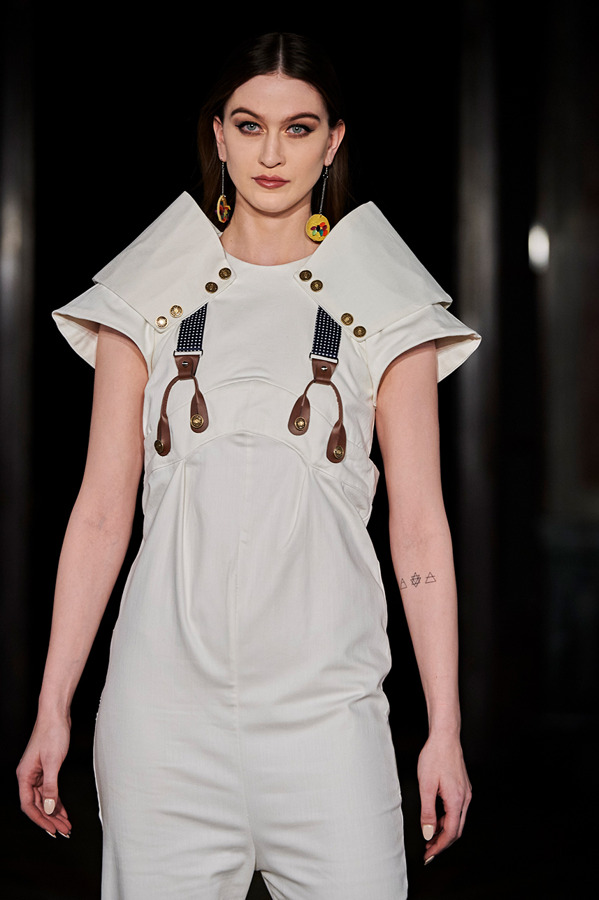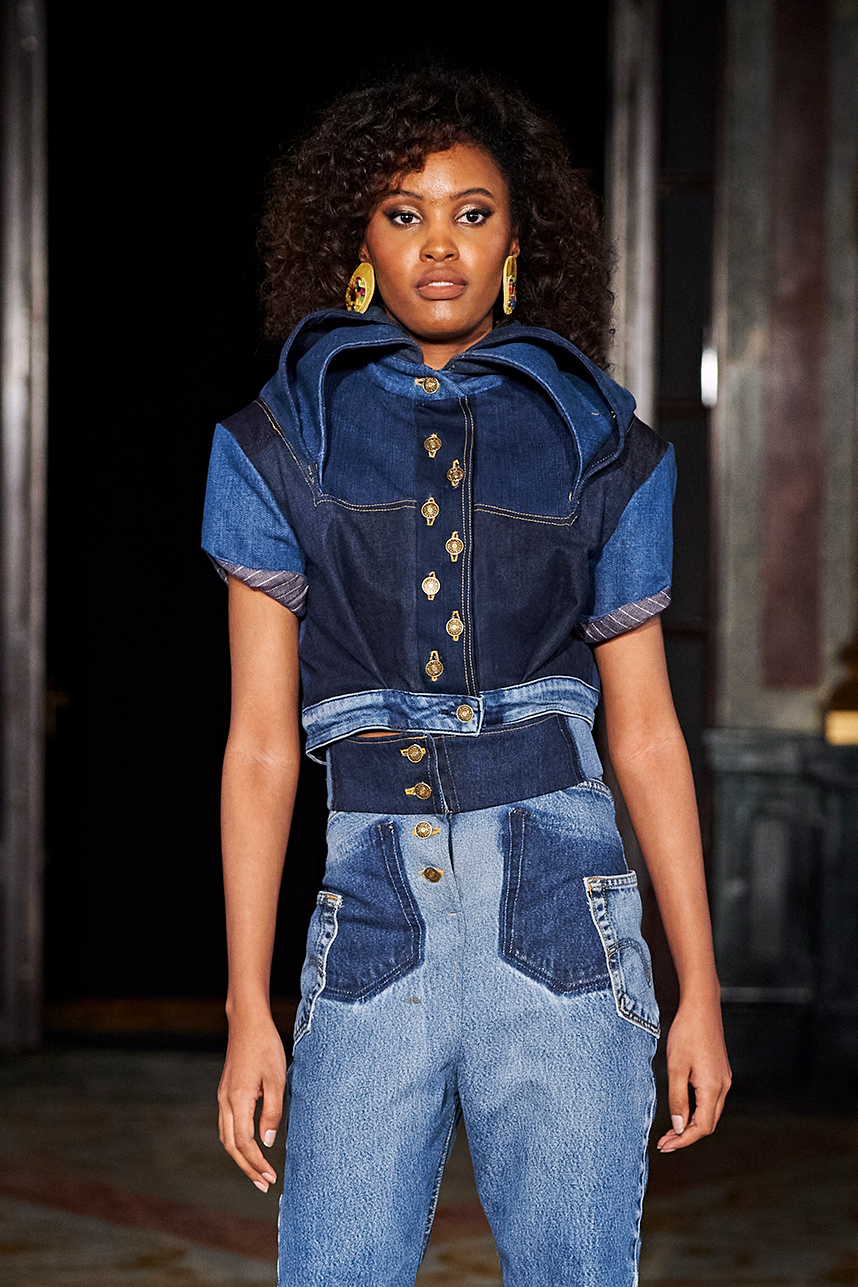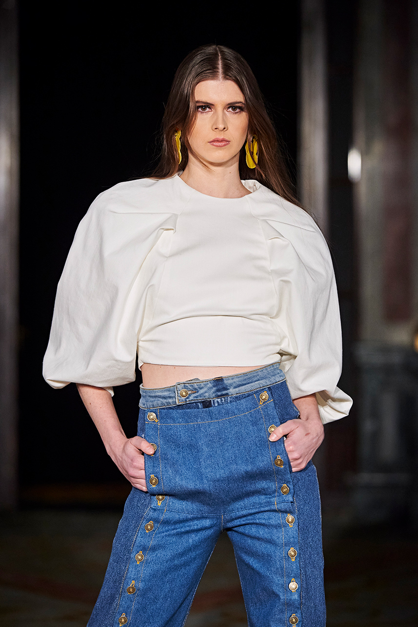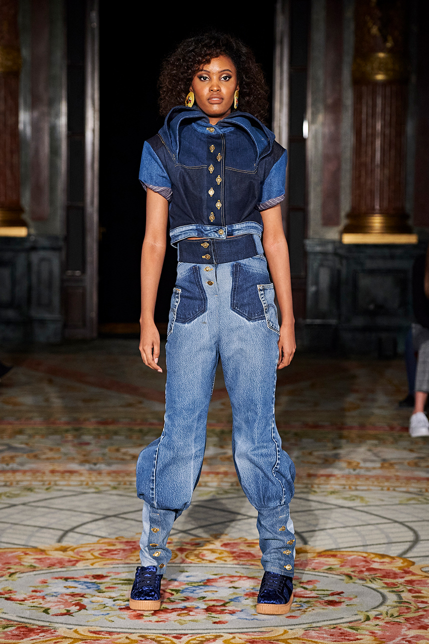 Puerto Rican designer Nashili of Netflix’s “Next In Fashion” presented her collection “Appropriation,” inspired by politics, social and religious issues. The collection featured upcycled, organic and recycled fabrics with an emphasis on denim constructed in the most interesting and architecturally structured way. Denim in various hues of blues were paired with cream, and white separates.
