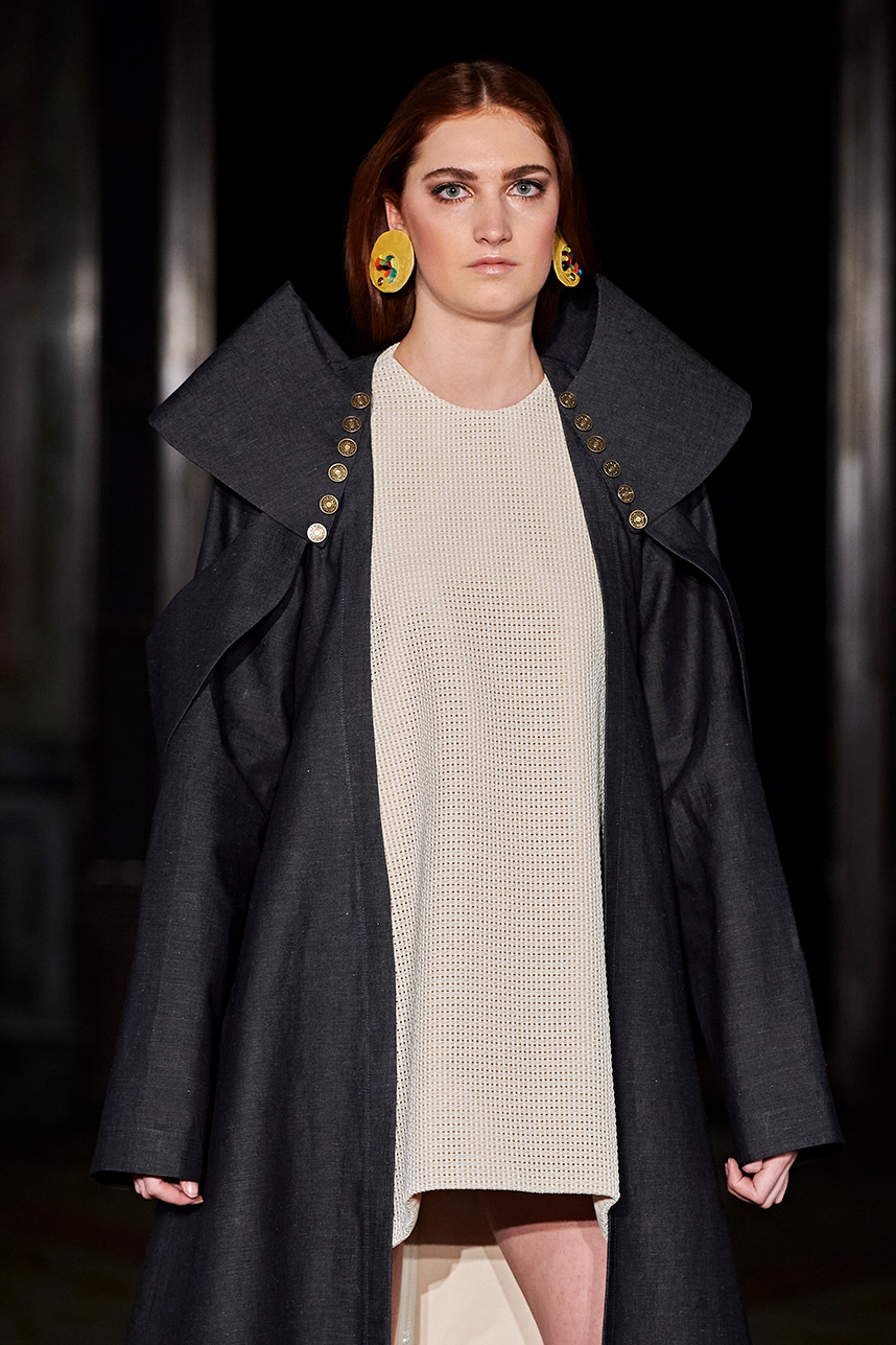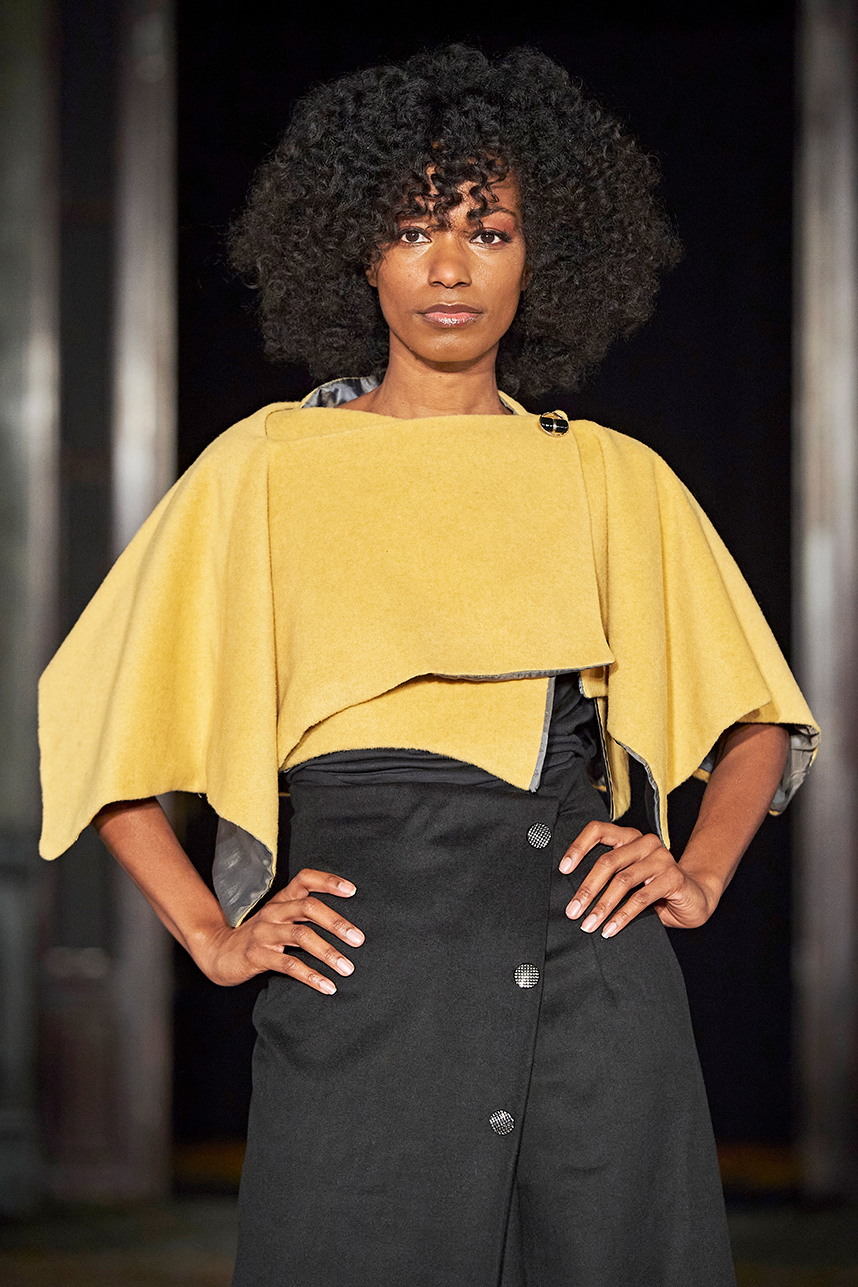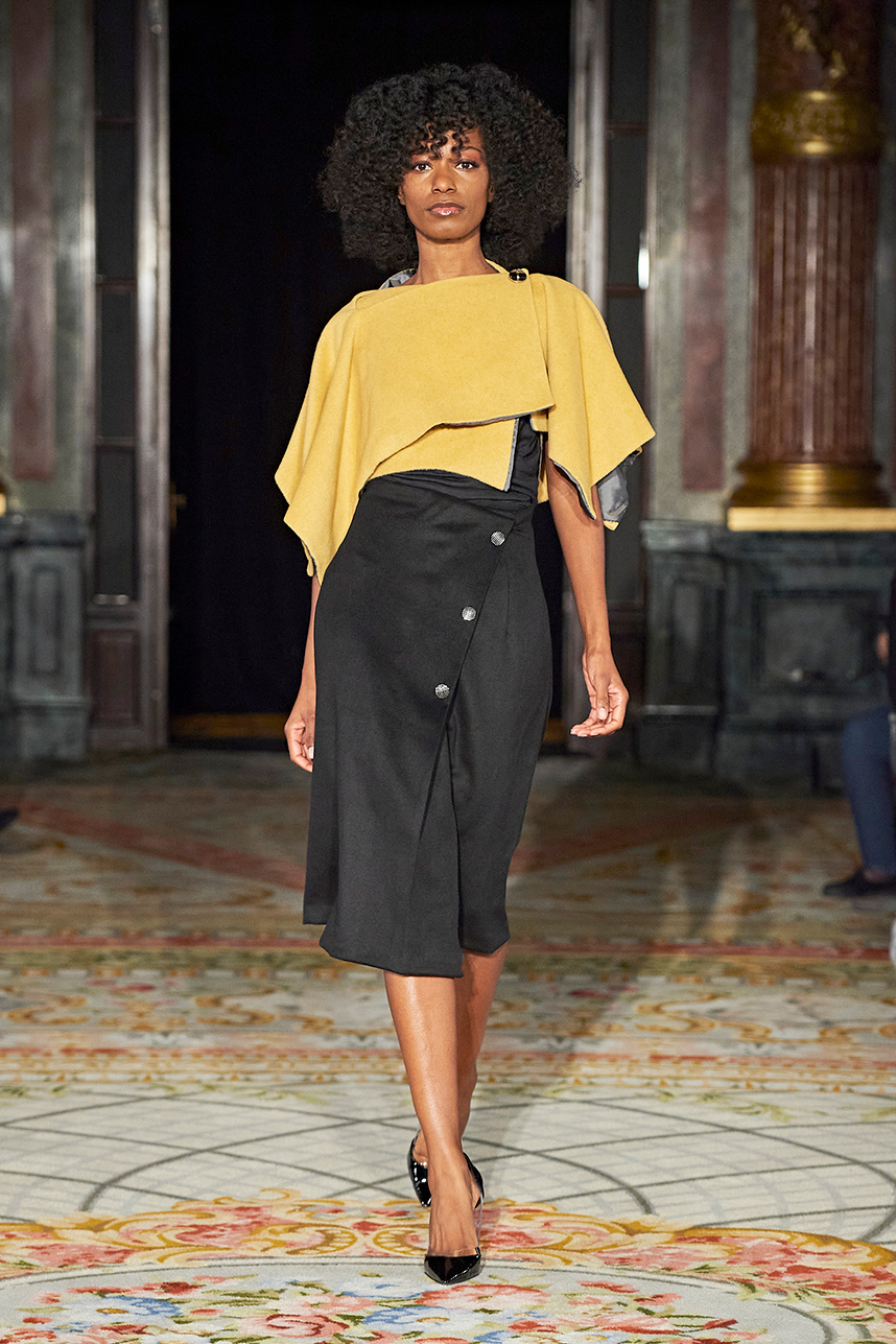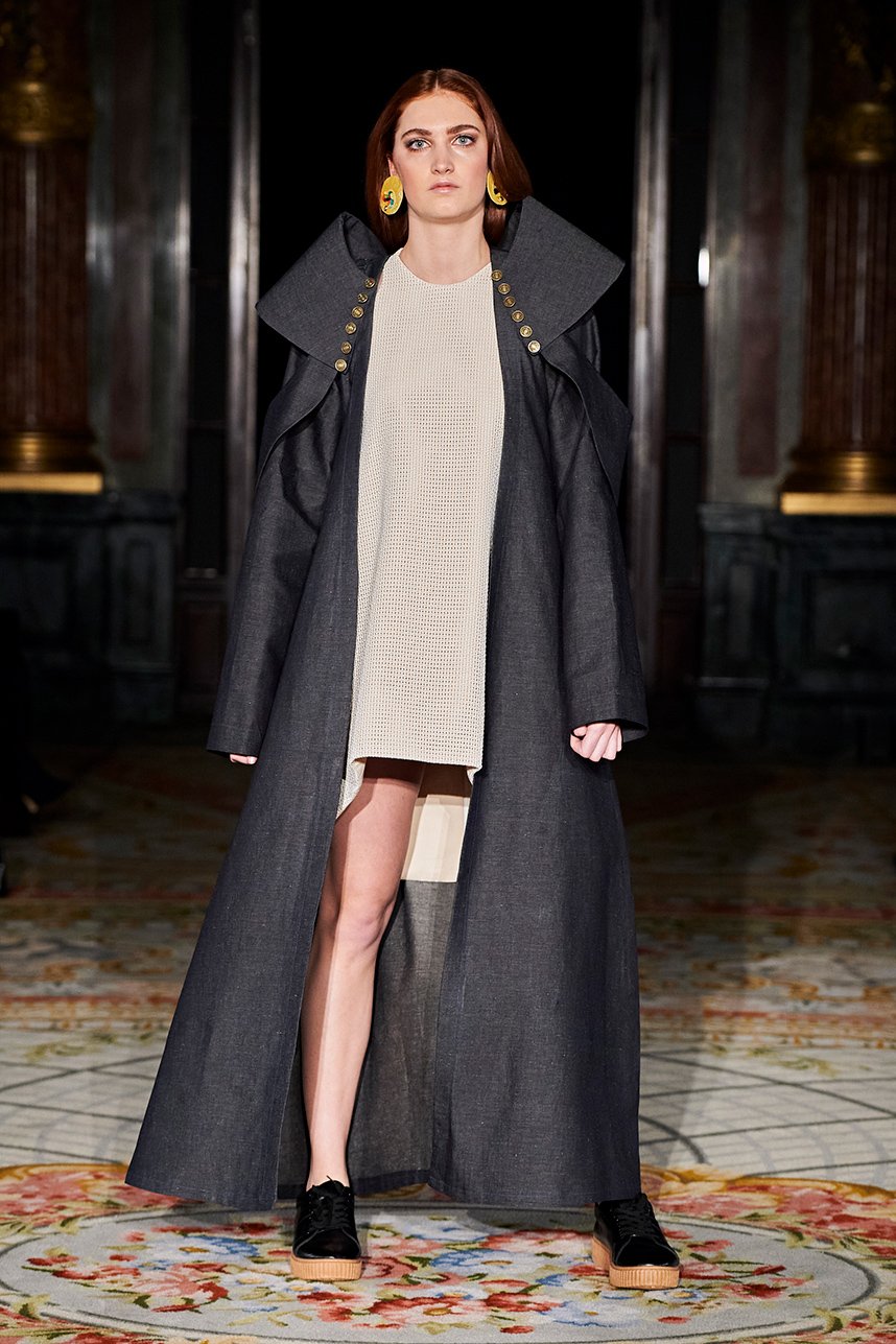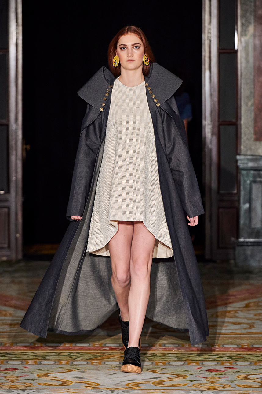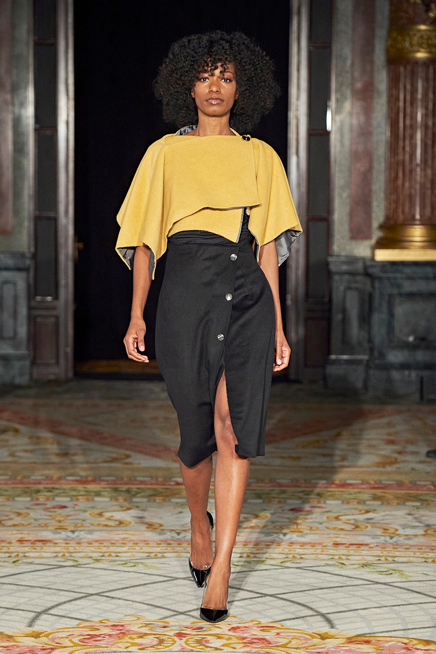 The Bulgarian designer was inspired by the traditions, mythology and history of the various cultures on this planet when creating the collection. The designer’s Hamburg, Germany studio birthed a collection of interesting dresses, separates and jackets with interesting details and the perfect blend of structure and unique draping. The collection “Antitheses” consisted of sustainable handcrafted fashion in fabrics of leather and knitted wool in a earth tone color palette of black, white, mustard, and blue.
