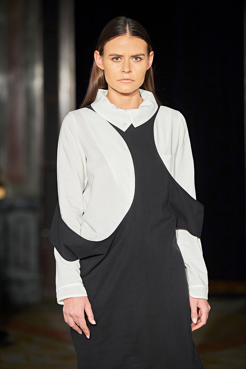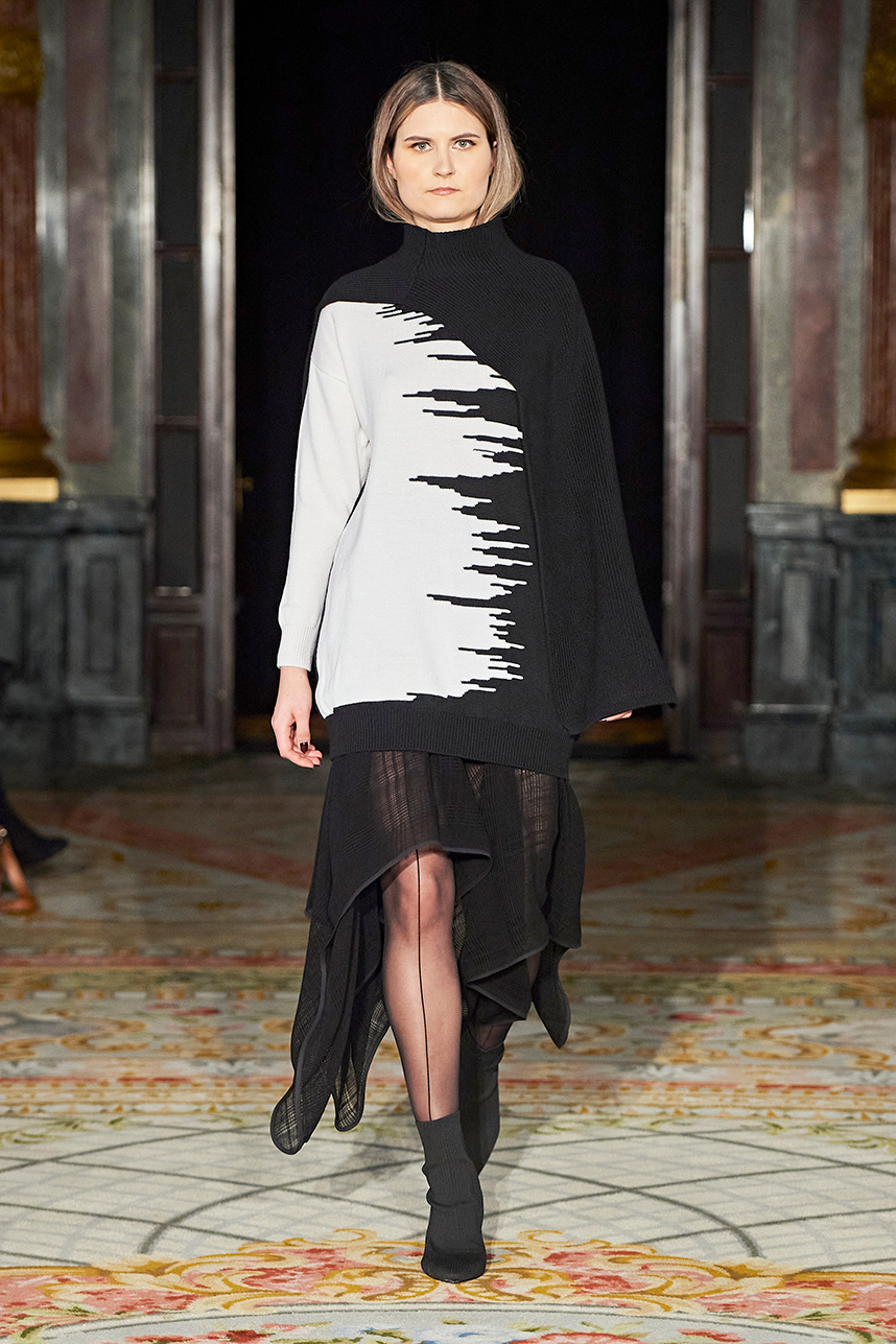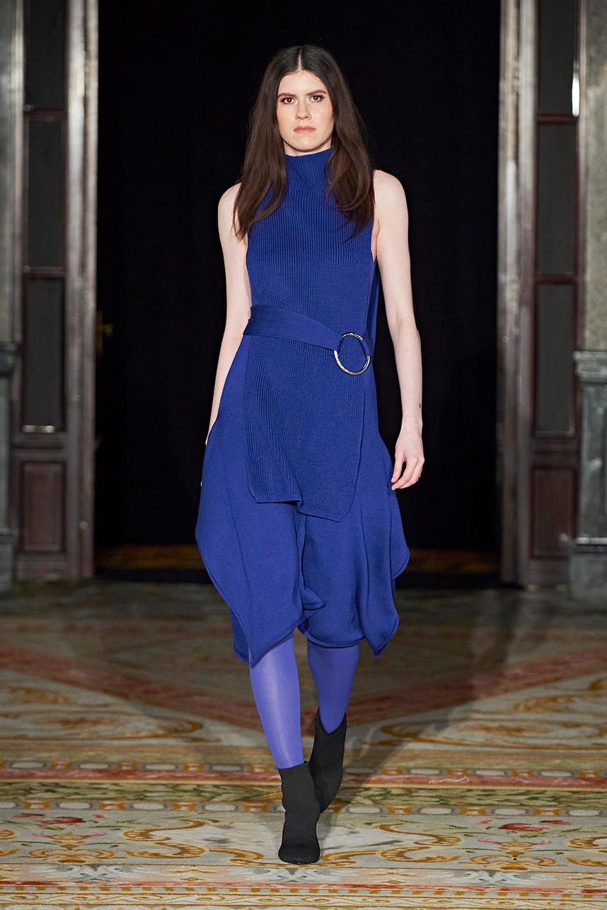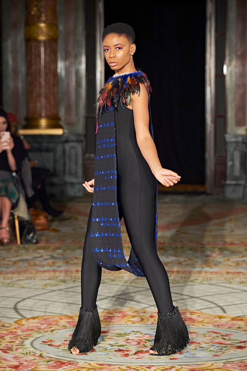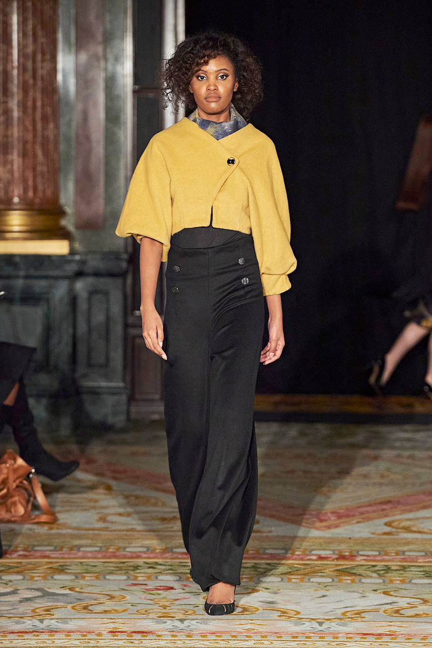 The Bulgarian designer was inspired by the traditions, mythology and history of the various cultures on this planet when creating the collection. The designer’s Hamburg, Germany studio birthed a collection of interesting dresses, separates and jackets with interesting details and the perfect blend of structure and unique draping. The collection “Antitheses” consisted of sustainable handcrafted fashion in fabrics of leather and knitted wool in a earth tone color palette of black, white, mustard, and blue.