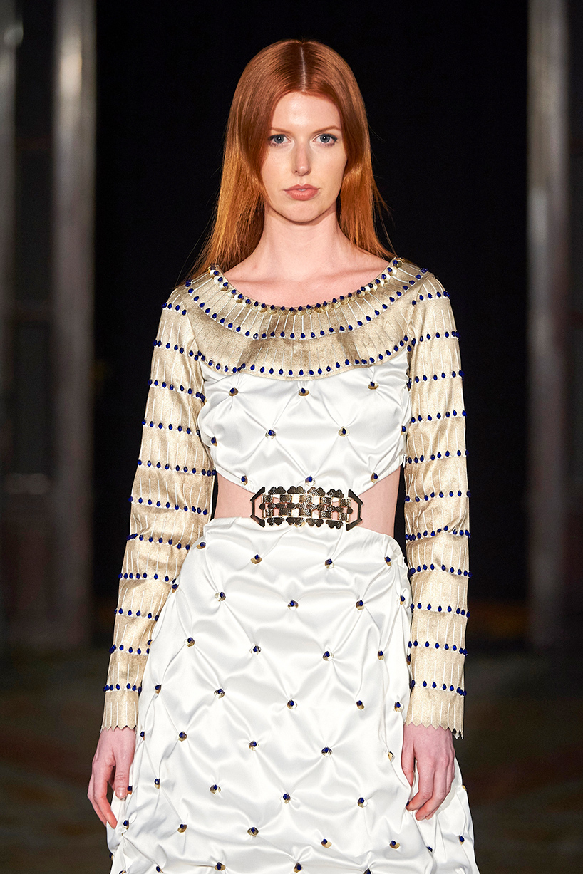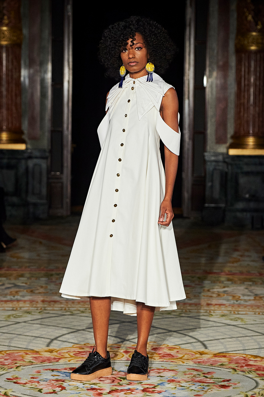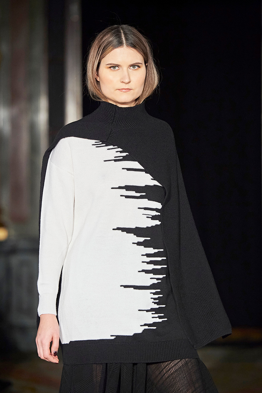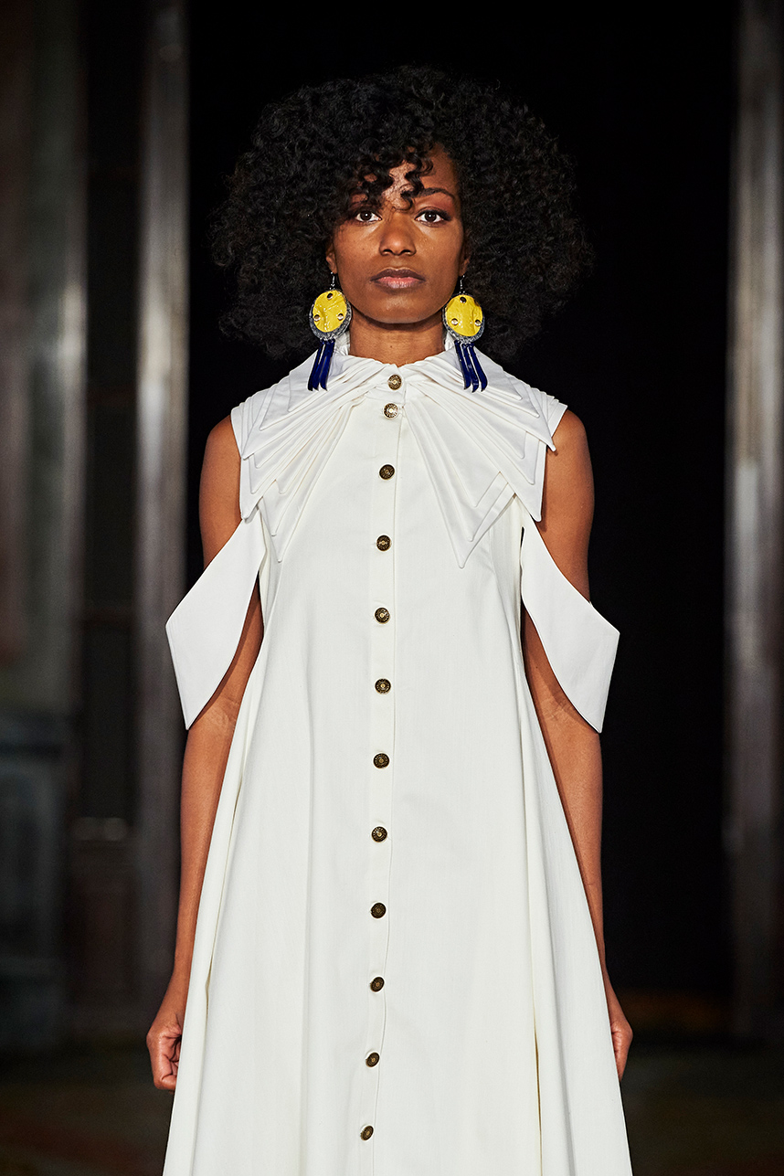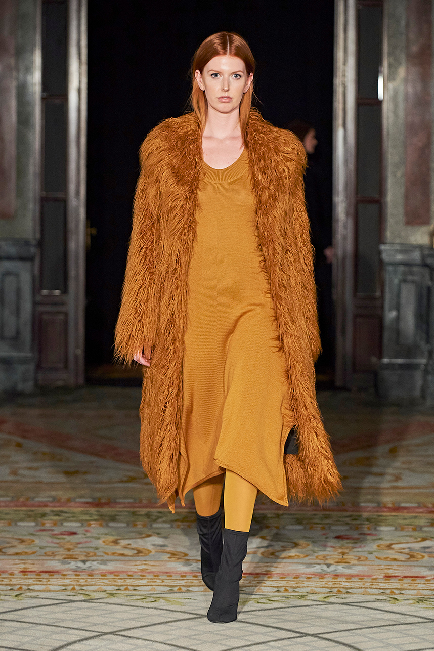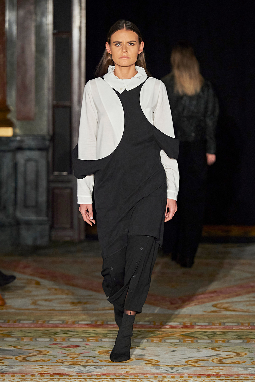 The Bulgarian designer was inspired by the traditions, mythology and history of the various cultures on this planet when creating the collection. The designer’s Hamburg, Germany studio birthed a collection of interesting dresses, separates and jackets with interesting details and the perfect blend of structure and unique draping. The collection “Antitheses” consisted of sustainable handcrafted fashion in fabrics of leather and knitted wool in a earth tone color palette of black, white, mustard, and blue.