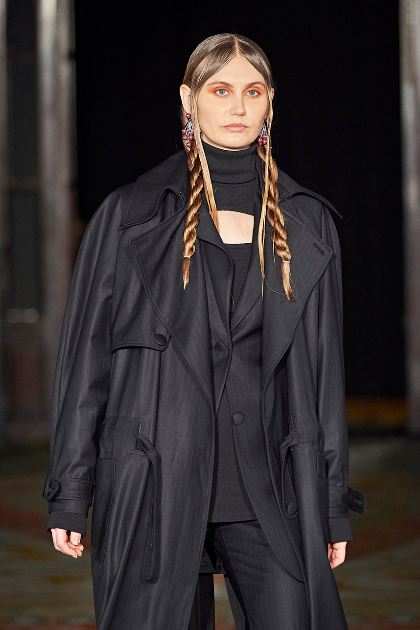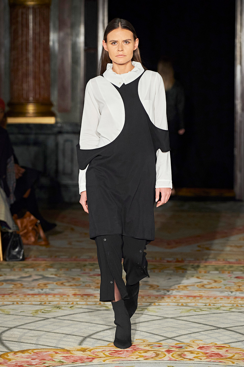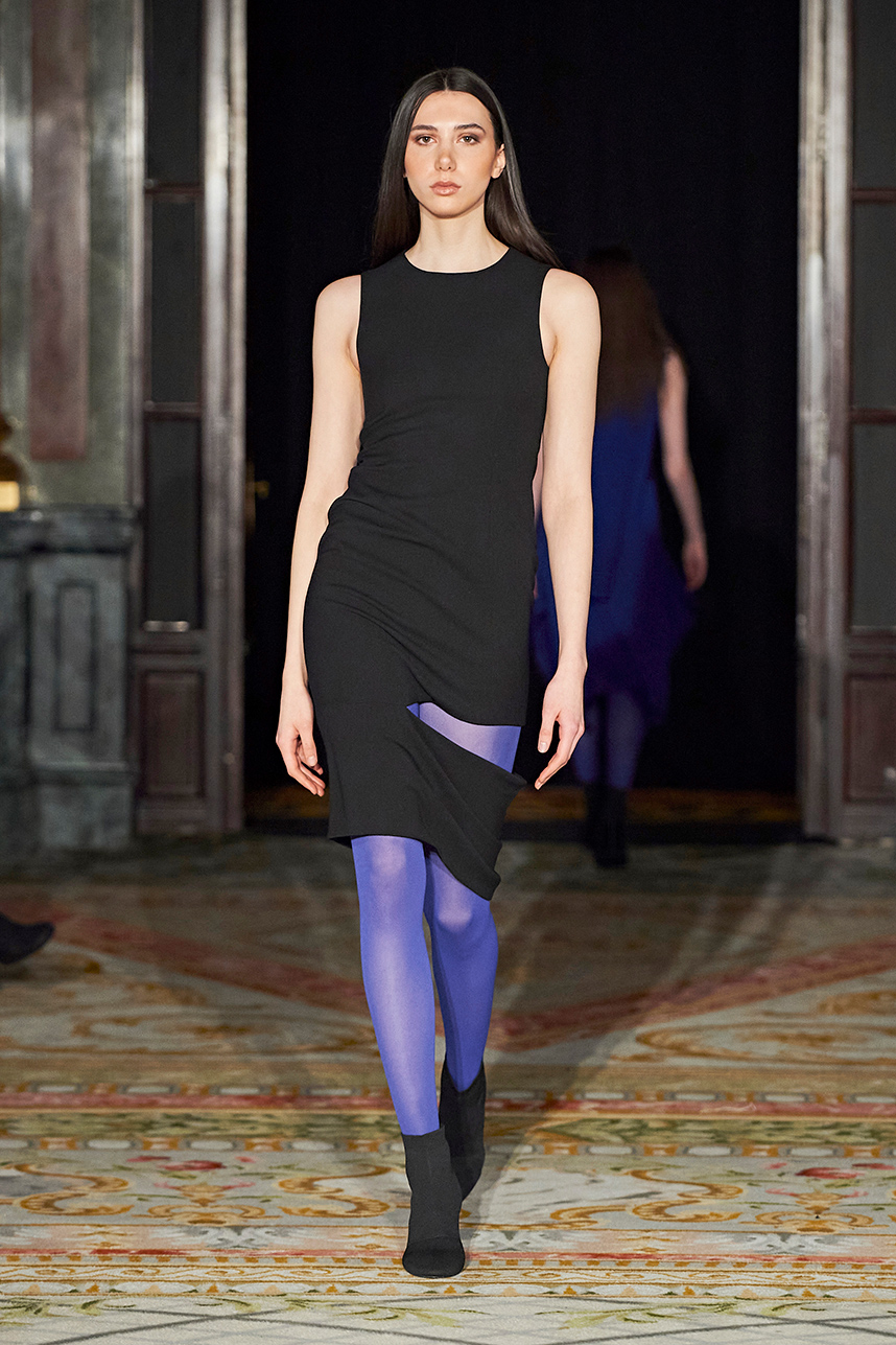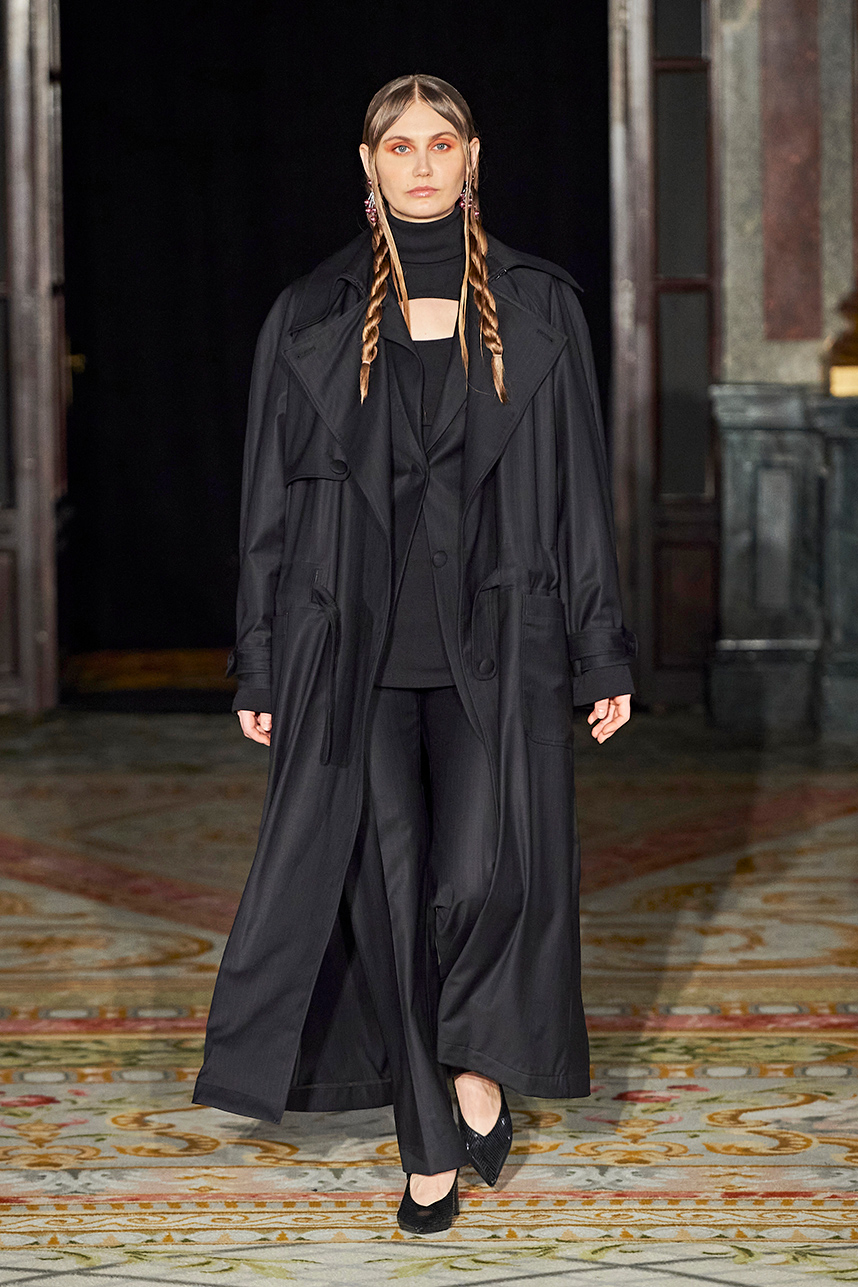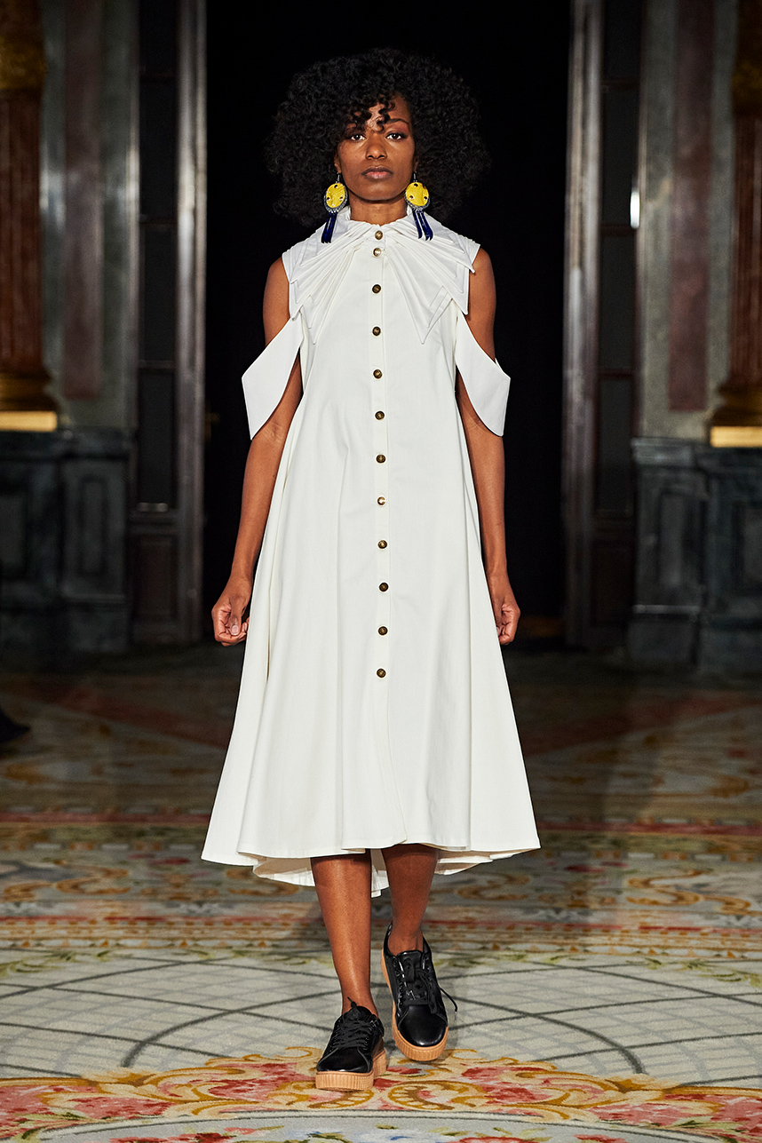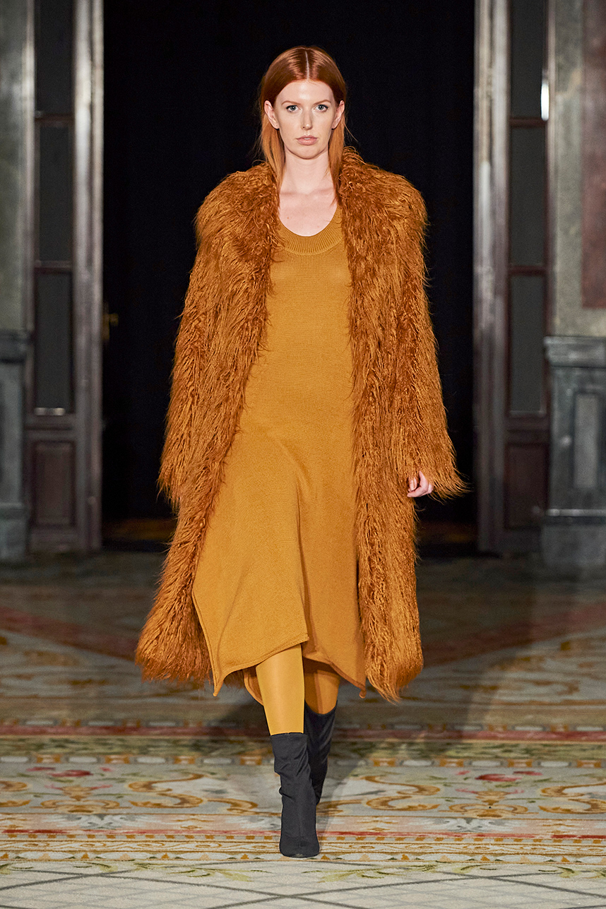 The Bulgarian designer was inspired by the traditions, mythology and history of the various cultures on this planet when creating the collection. The designer’s Hamburg, Germany studio birthed a collection of interesting dresses, separates and jackets with interesting details and the perfect blend of structure and unique draping. The collection “Antitheses” consisted of sustainable handcrafted fashion in fabrics of leather and knitted wool in a earth tone color palette of black, white, mustard, and blue.