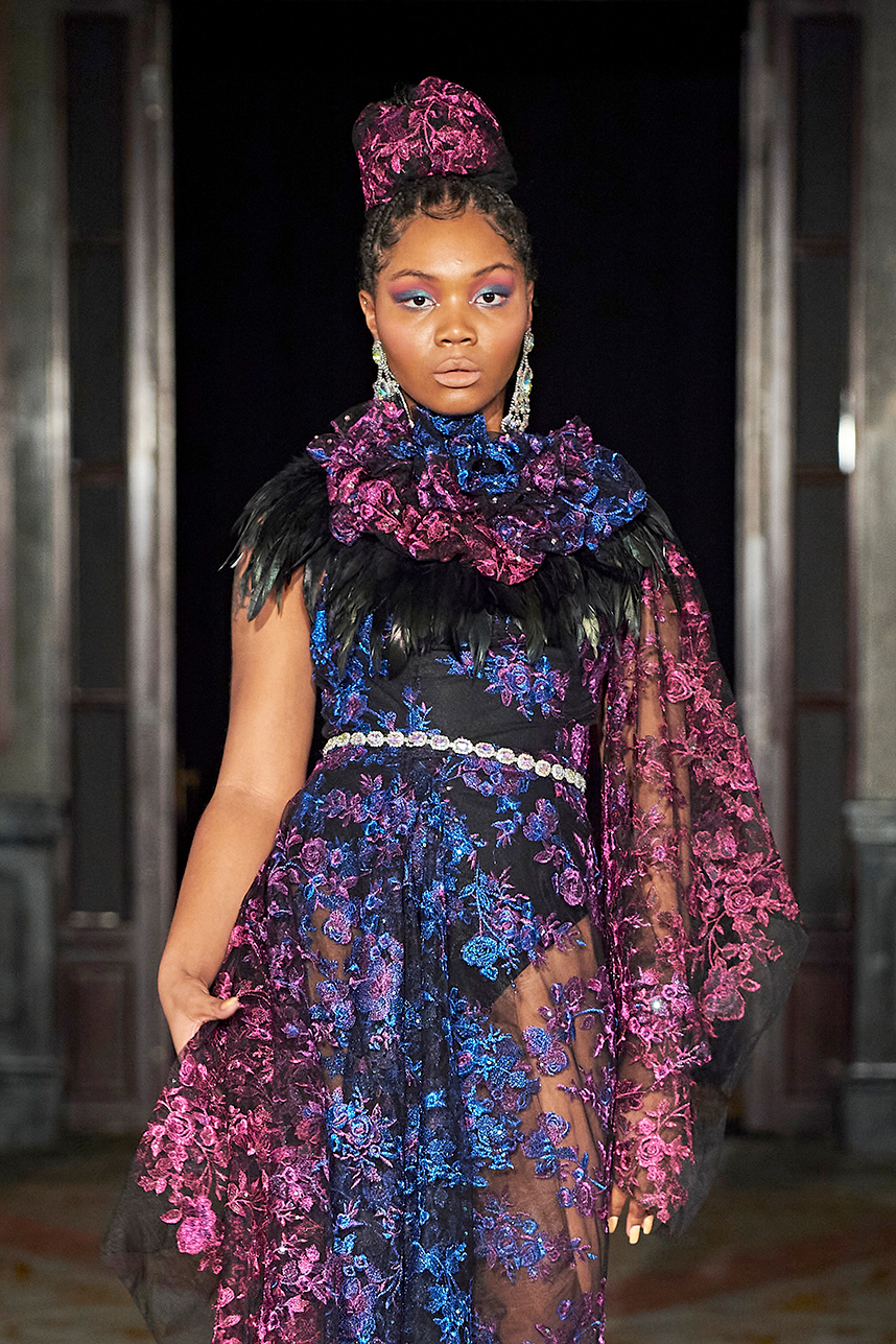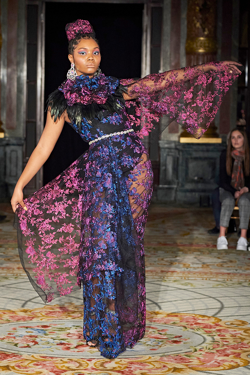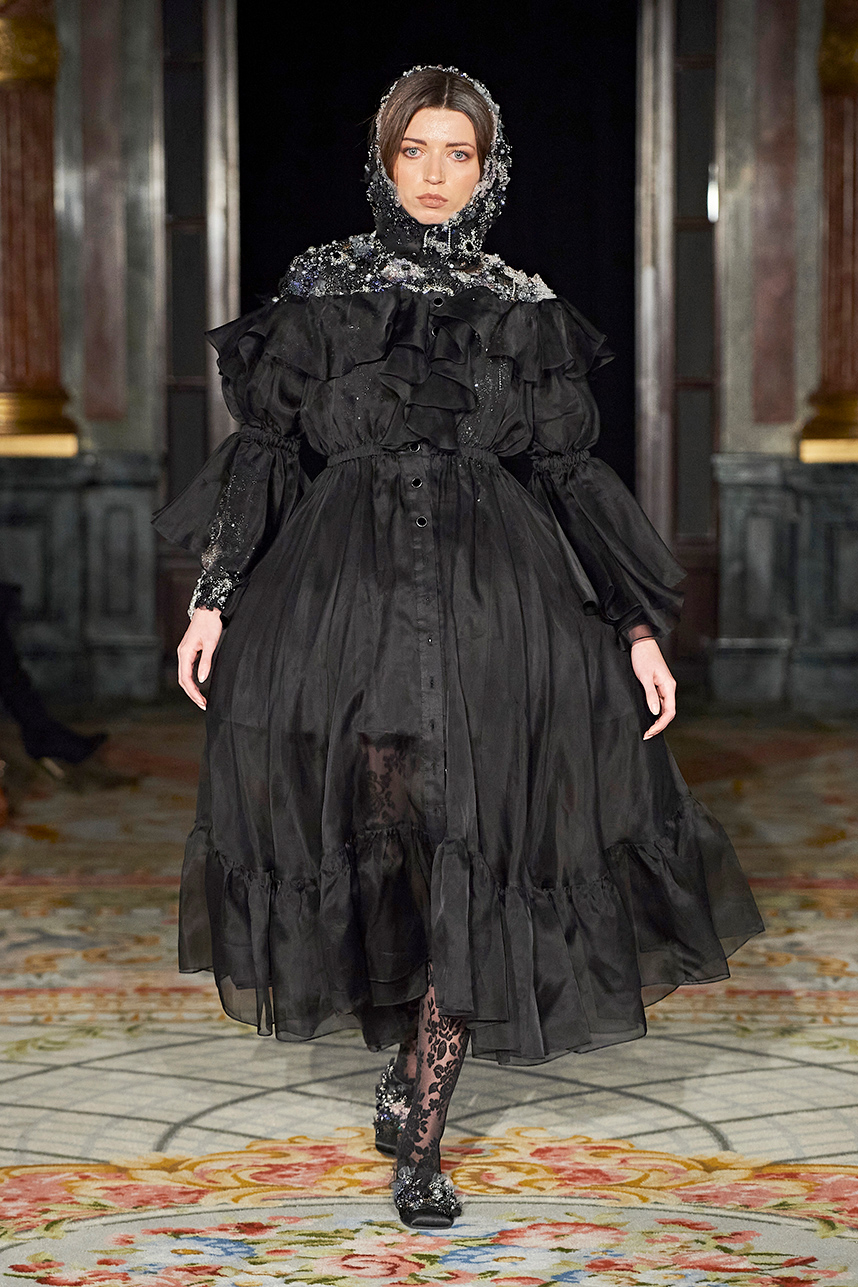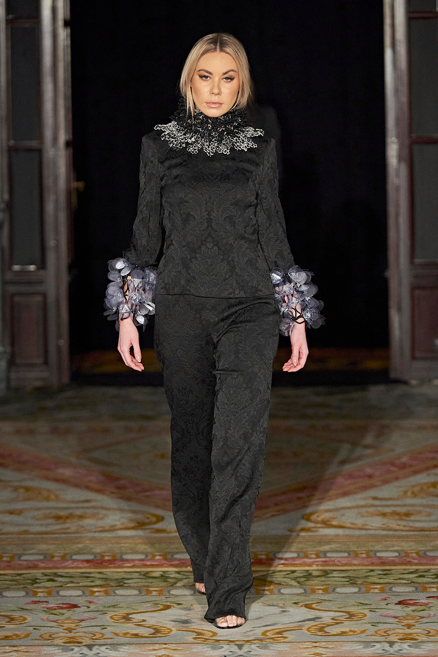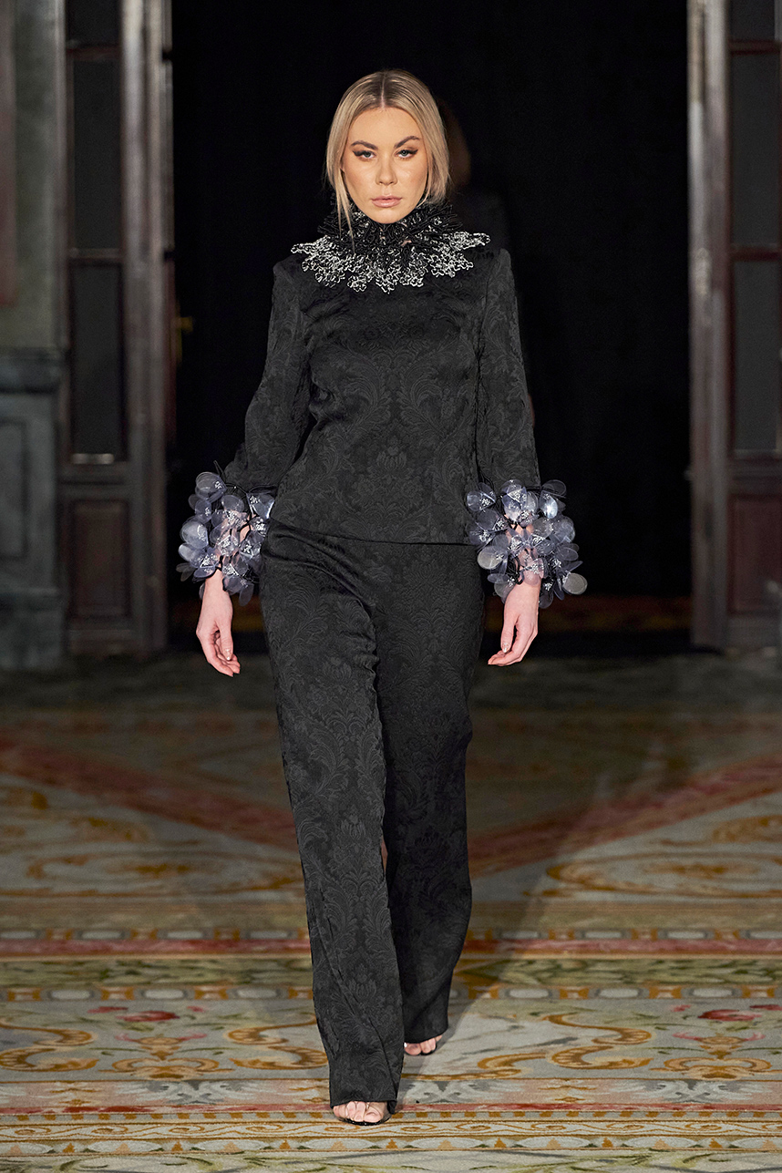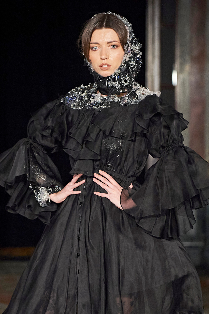 Ukrainian designer Olga Ochkas’s fashion label “Moral Standards” took guests on a journey through historic volumes, bizarre shapes, Victorian motifs with refreshing twists that felt like neveau fashion for the avant garde chic. High quality couture craftsmanship, careful selection of fabrics and attention to finishing details are hallmarks of the brand. Detailed embroidery, expertly executed ruffles, leather corsets and crystal headpieces were intertwined perfectly. The designer sought to demonstrate a contrast of looks with bright line of violet floral embroidery, flowing flower white dresses with frills and puff sleeves contrasting black pieces in the collection consisting of of sinister, heavy full-skirted gowns with stone cross embroideries, black lace and laconic cuts. At the same time, this collection is a continuation of the brand’s style – Victorian silhouettes in silks, organza, lace, volume taffeta gowns and a lot of hand work.
