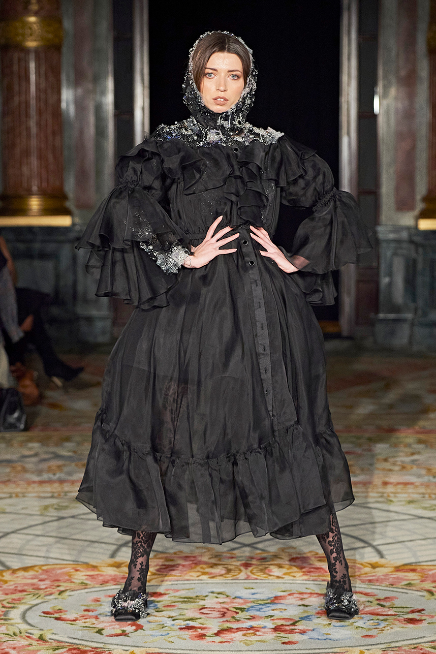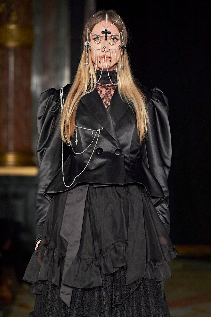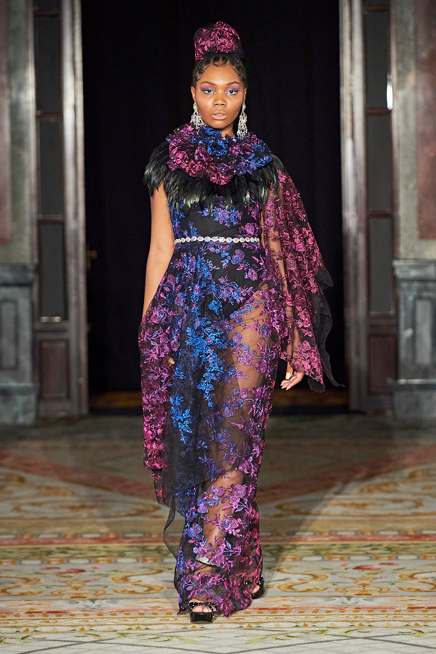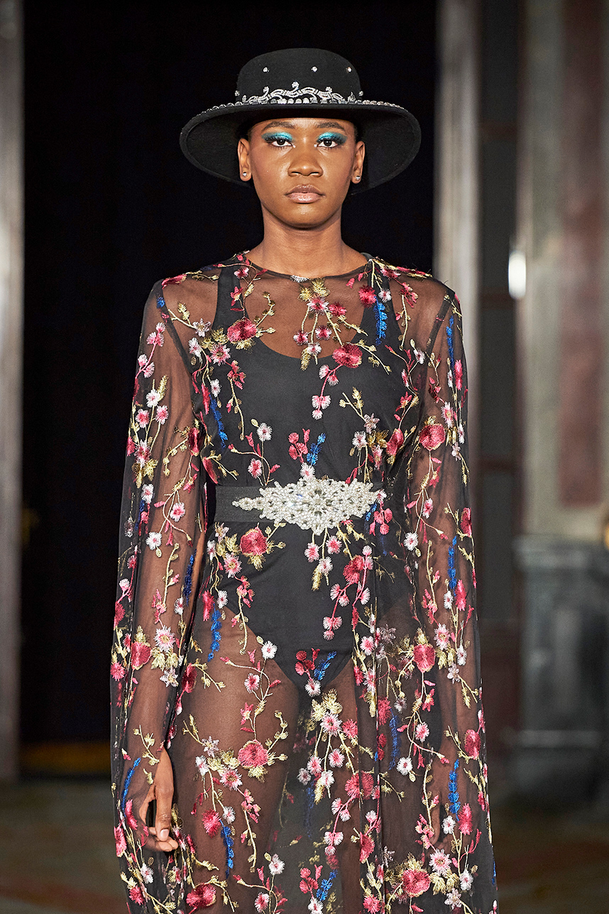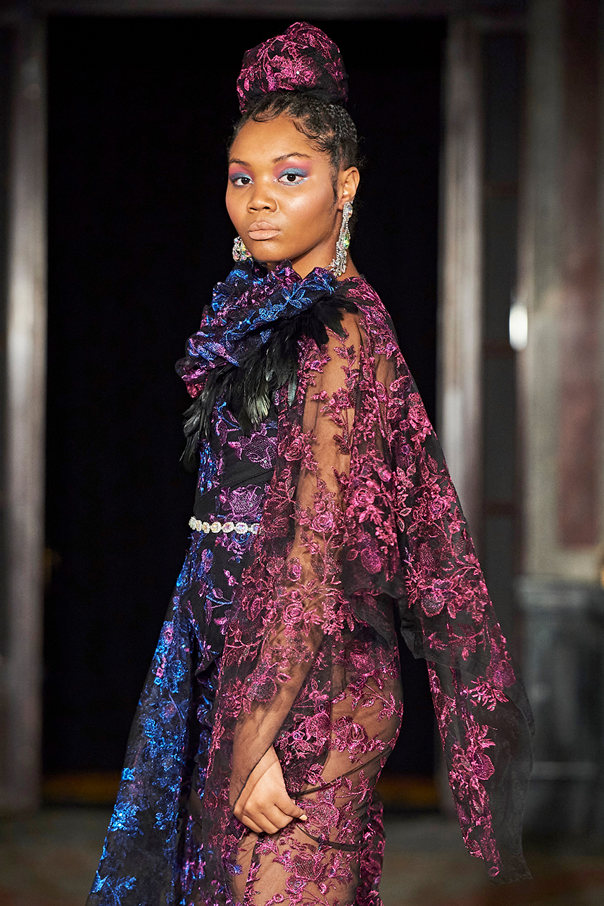 Ukrainian designer Olga Ochkas’s fashion label “Moral Standards” took guests on a journey through historic volumes, bizarre shapes, Victorian motifs with refreshing twists that felt like neveau fashion for the avant garde chic. High quality couture craftsmanship, careful selection of fabrics and attention to finishing details are hallmarks of the brand. Detailed embroidery, expertly executed ruffles, leather corsets and crystal headpieces were intertwined perfectly. The designer sought to demonstrate a contrast of looks with bright line of violet floral embroidery, flowing flower white dresses with frills and puff sleeves contrasting black pieces in the collection consisting of of sinister, heavy full-skirted gowns with stone cross embroideries, black lace and laconic cuts. At the same time, this collection is a continuation of the brand’s style – Victorian silhouettes in silks, organza, lace, volume taffeta gowns and a lot of hand work.
