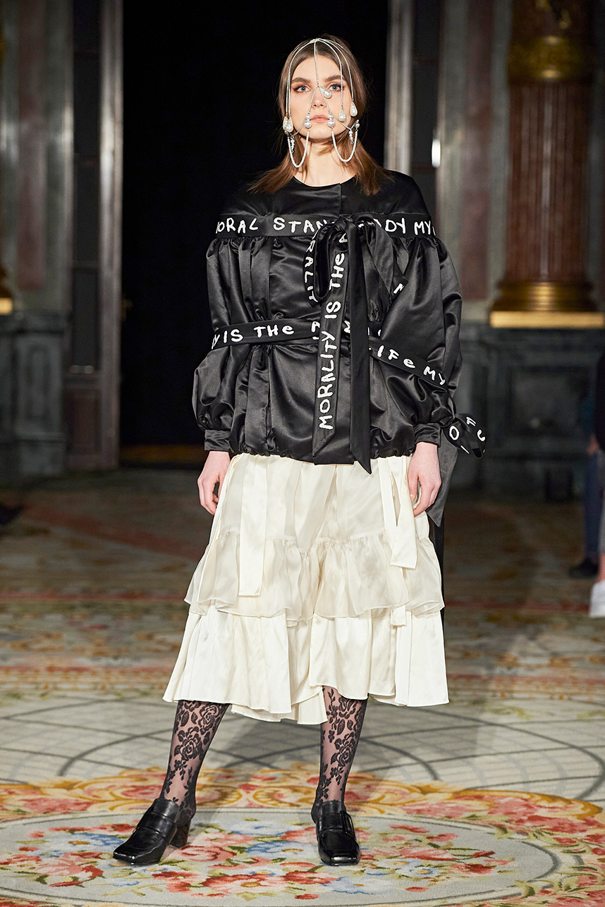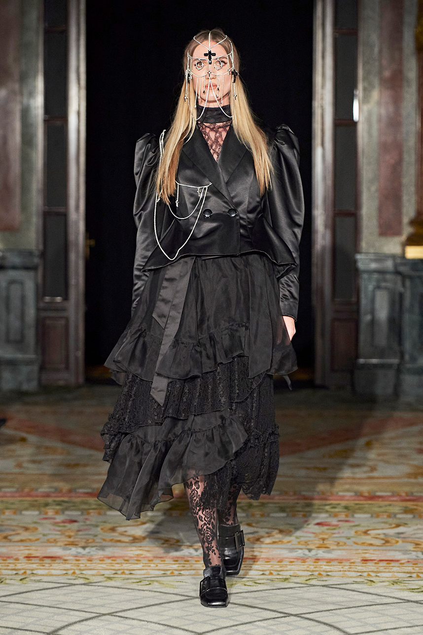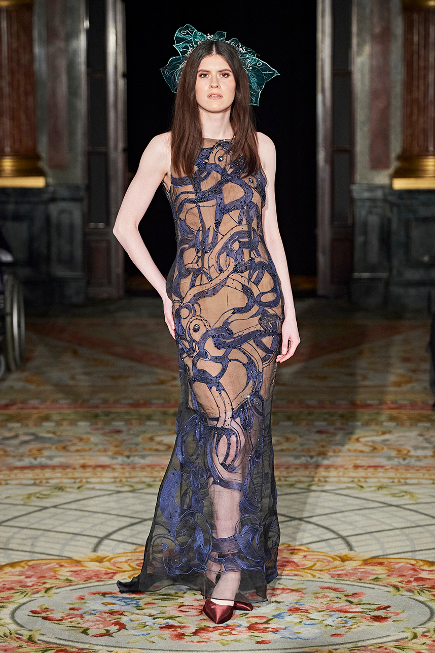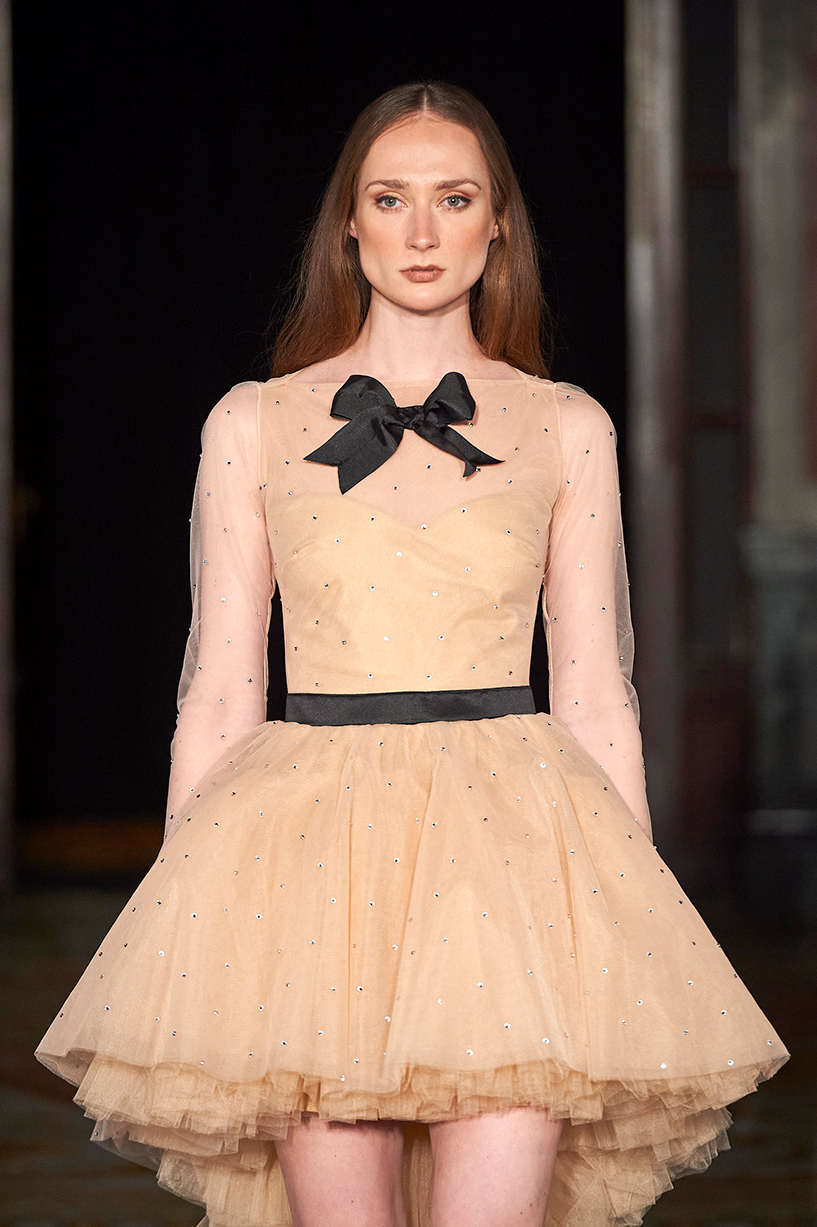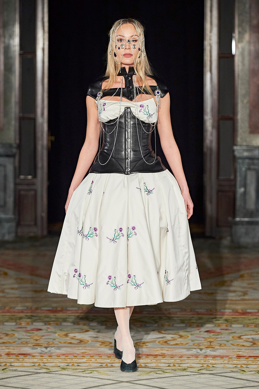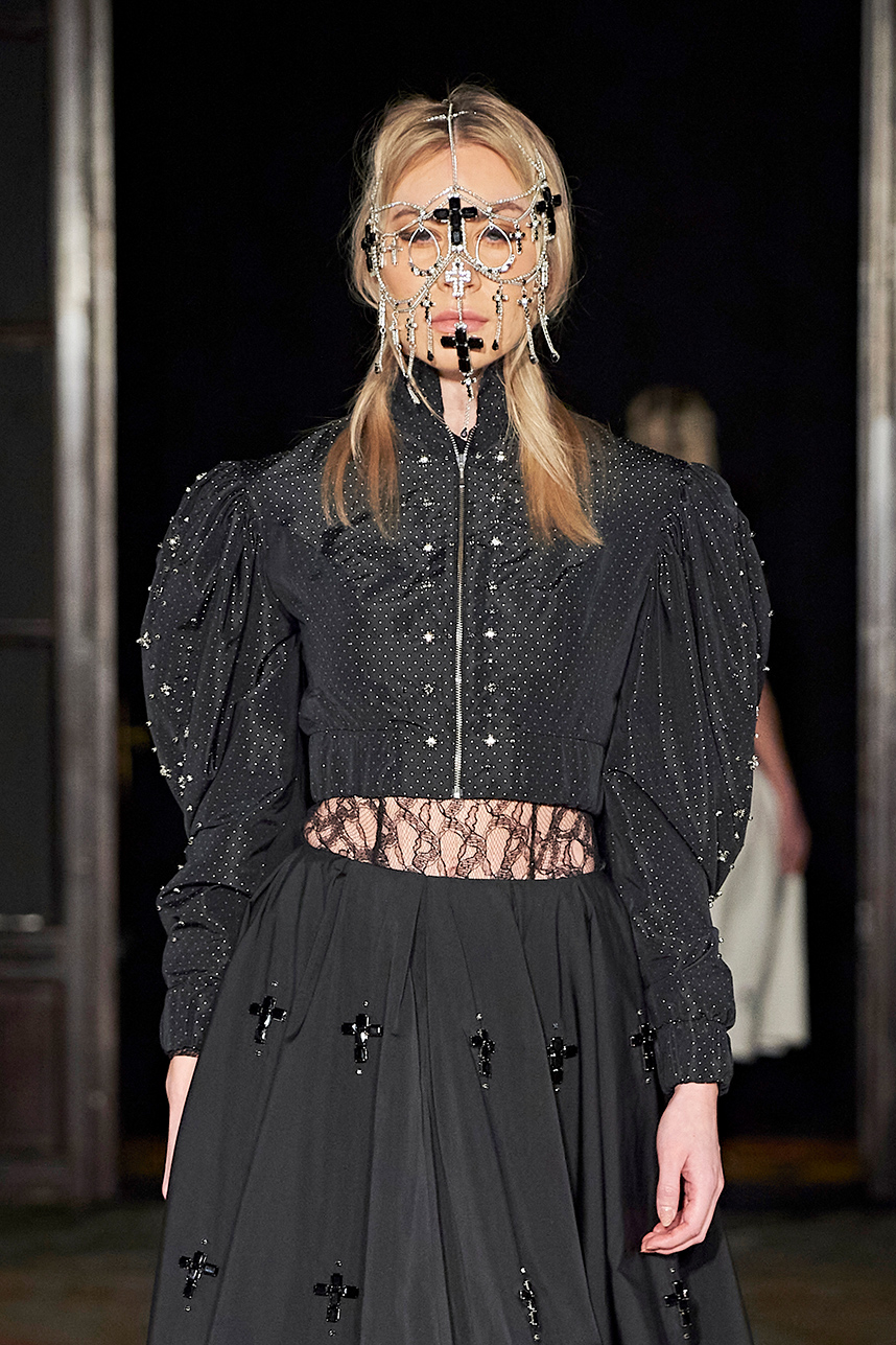 Ukrainian designer Olga Ochkas’s fashion label “Moral Standards” took guests on a journey through historic volumes, bizarre shapes, Victorian motifs with refreshing twists that felt like neveau fashion for the avant garde chic. High quality couture craftsmanship, careful selection of fabrics and attention to finishing details are hallmarks of the brand. Detailed embroidery, expertly executed ruffles, leather corsets and crystal headpieces were intertwined perfectly. The designer sought to demonstrate a contrast of looks with bright line of violet floral embroidery, flowing flower white dresses with frills and puff sleeves contrasting black pieces in the collection consisting of of sinister, heavy full-skirted gowns with stone cross embroideries, black lace and laconic cuts. At the same time, this collection is a continuation of the brand’s style – Victorian silhouettes in silks, organza, lace, volume taffeta gowns and a lot of hand work.