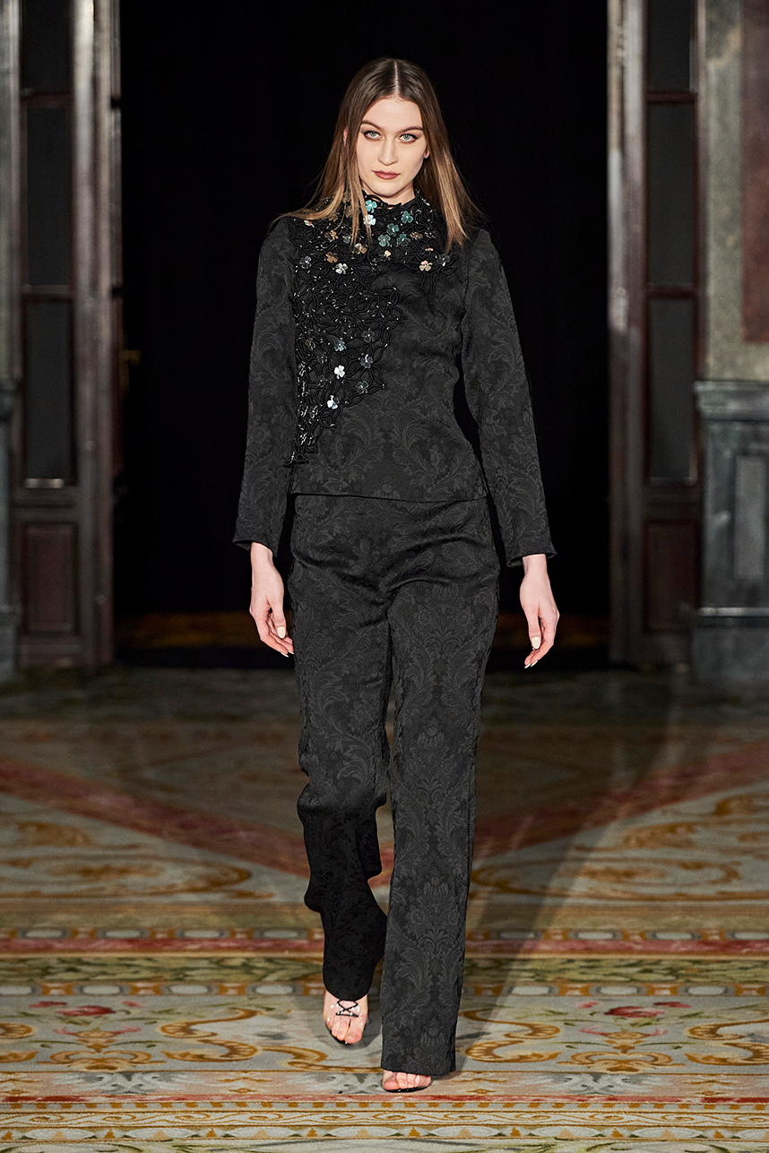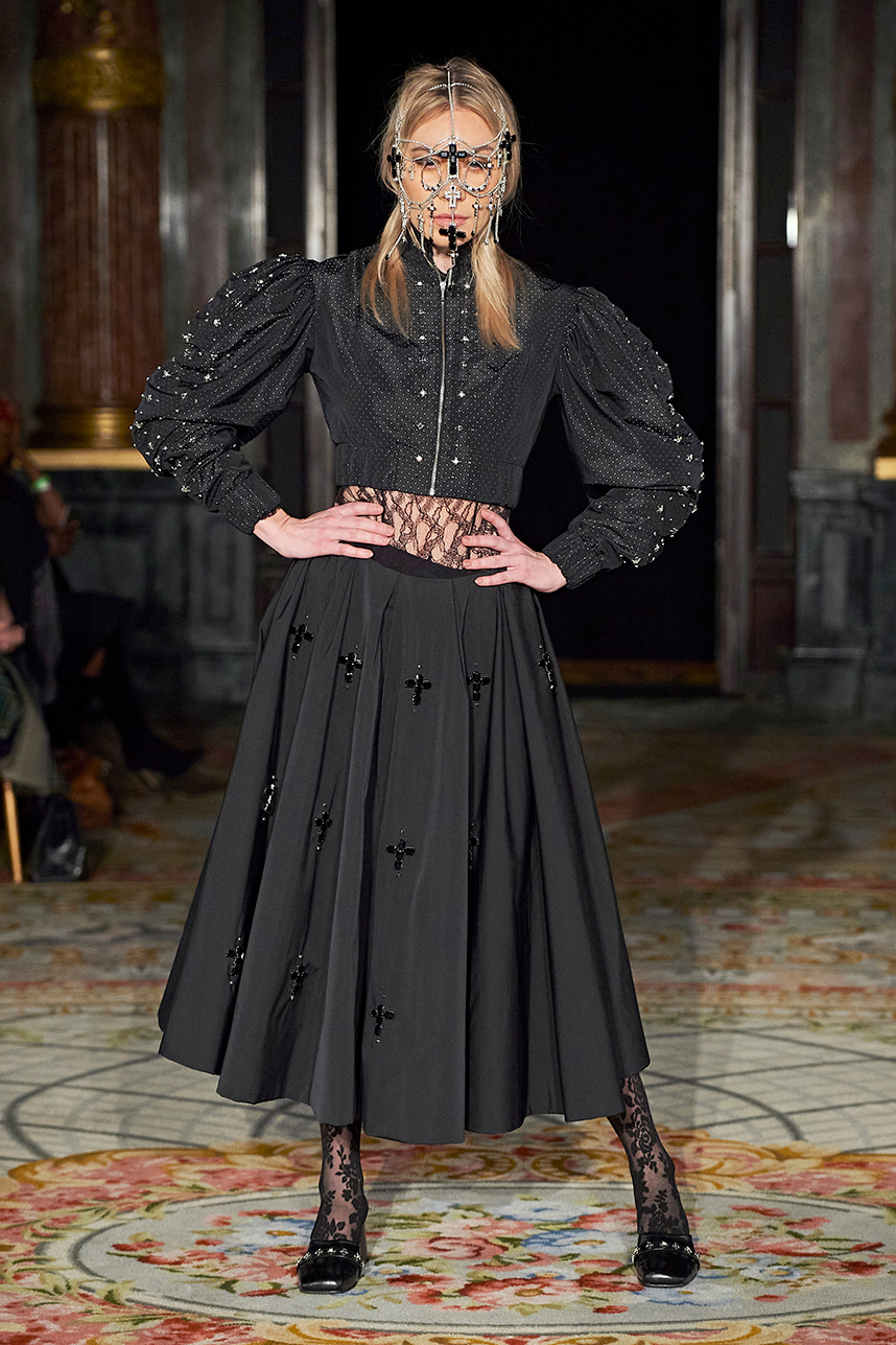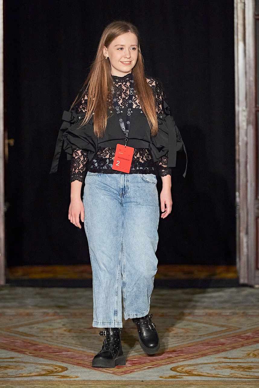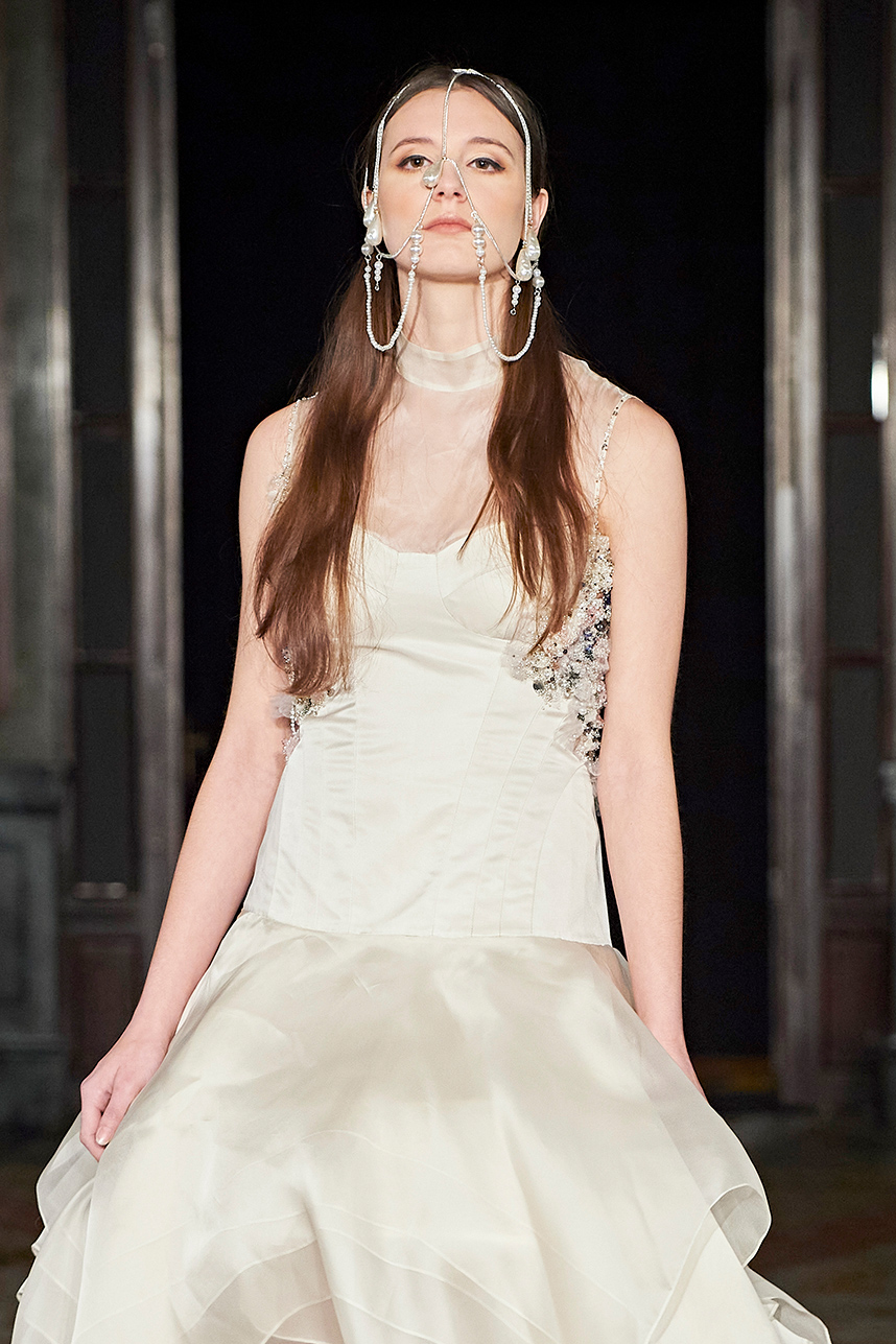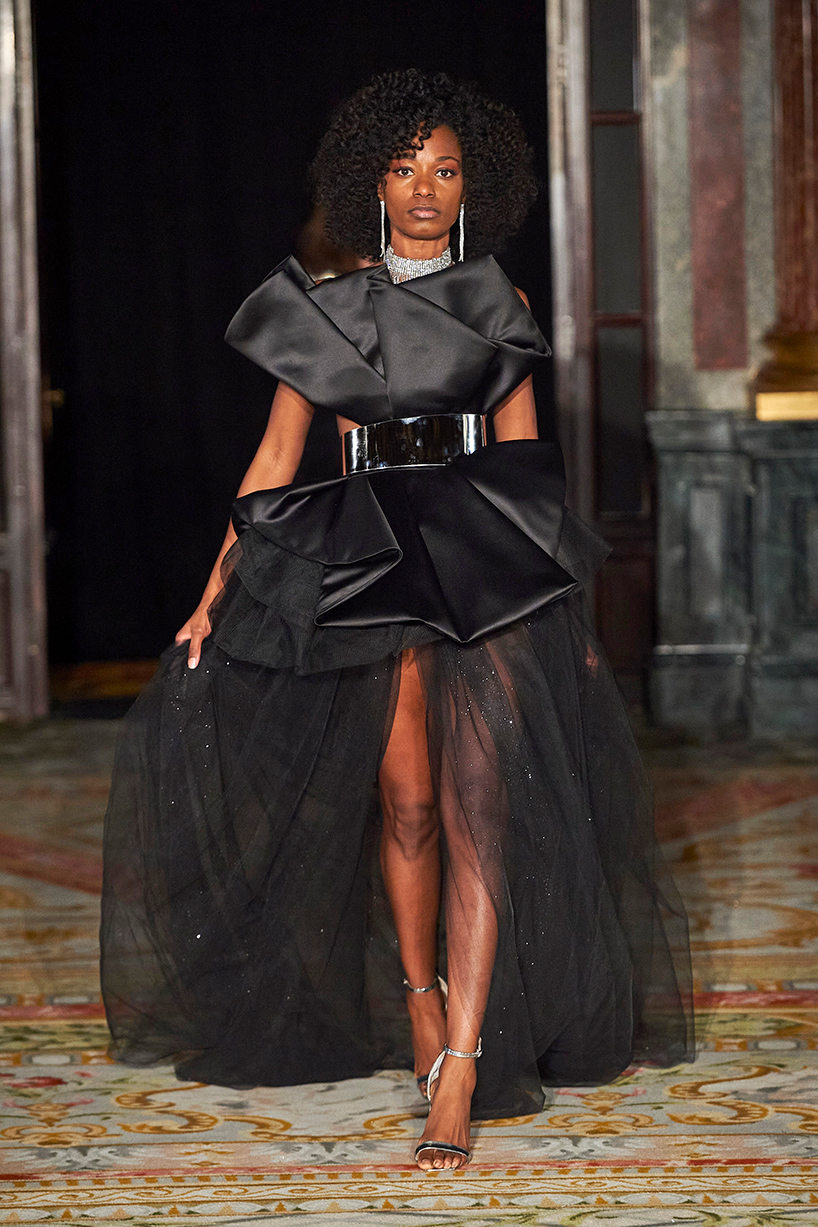 Ukrainian designer Olga Ochkas’s fashion label “Moral Standards” took guests on a journey through historic volumes, bizarre shapes, Victorian motifs with refreshing twists that felt like neveau fashion for the avant garde chic. High quality couture craftsmanship, careful selection of fabrics and attention to finishing details are hallmarks of the brand. Detailed embroidery, expertly executed ruffles, leather corsets and crystal headpieces were intertwined perfectly. The designer sought to demonstrate a contrast of looks with bright line of violet floral embroidery, flowing flower white dresses with frills and puff sleeves contrasting black pieces in the collection consisting of of sinister, heavy full-skirted gowns with stone cross embroideries, black lace and laconic cuts. At the same time, this collection is a continuation of the brand’s style – Victorian silhouettes in silks, organza, lace, volume taffeta gowns and a lot of hand work.