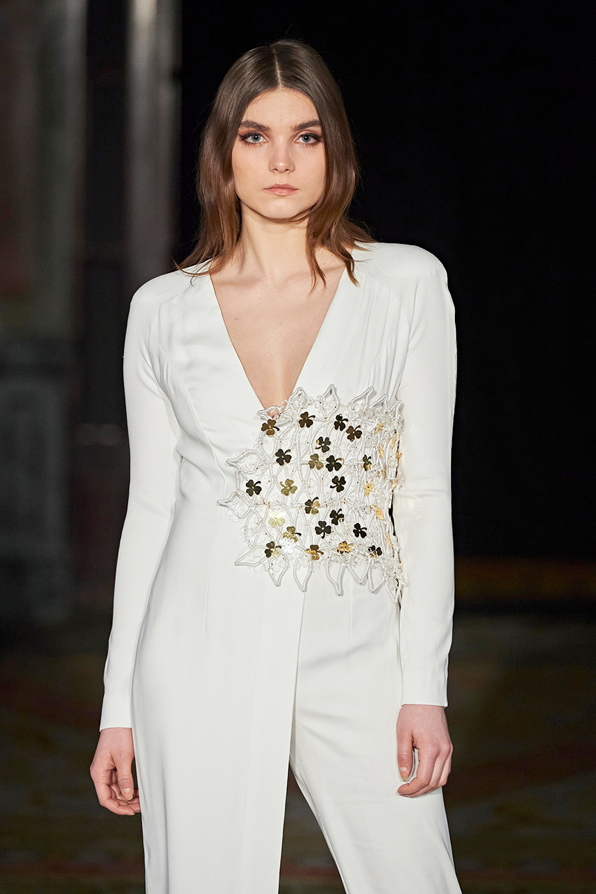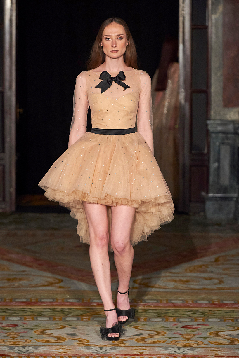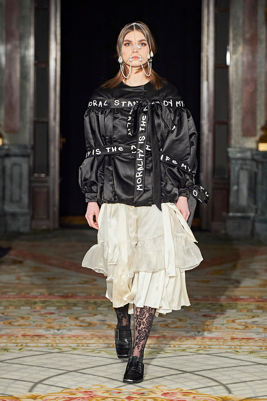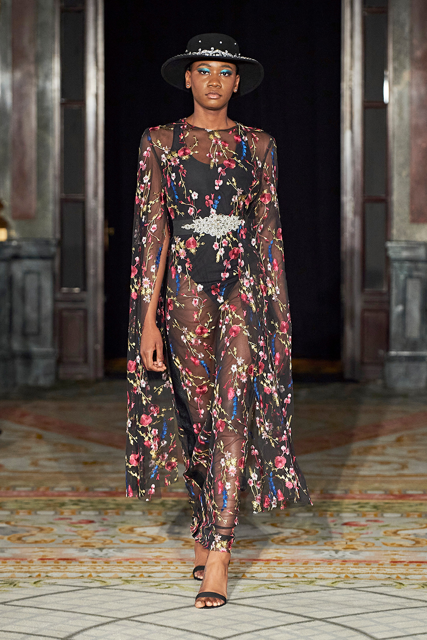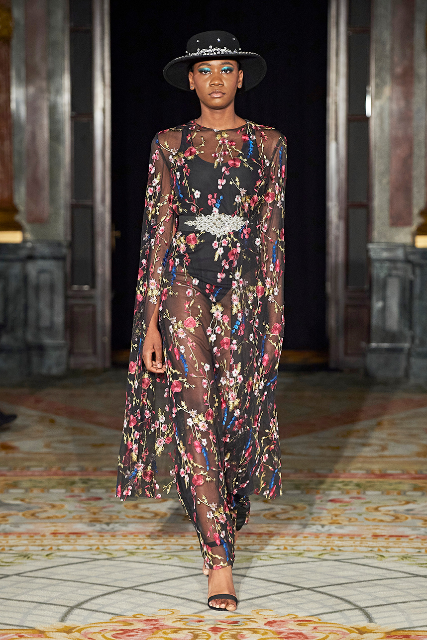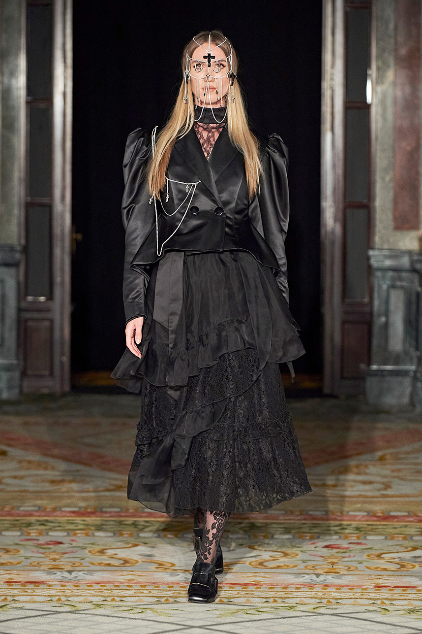 Ukrainian designer Olga Ochkas’s fashion label “Moral Standards” took guests on a journey through historic volumes, bizarre shapes, Victorian motifs with refreshing twists that felt like neveau fashion for the avant garde chic. High quality couture craftsmanship, careful selection of fabrics and attention to finishing details are hallmarks of the brand. Detailed embroidery, expertly executed ruffles, leather corsets and crystal headpieces were intertwined perfectly. The designer sought to demonstrate a contrast of looks with bright line of violet floral embroidery, flowing flower white dresses with frills and puff sleeves contrasting black pieces in the collection consisting of of sinister, heavy full-skirted gowns with stone cross embroideries, black lace and laconic cuts. At the same time, this collection is a continuation of the brand’s style – Victorian silhouettes in silks, organza, lace, volume taffeta gowns and a lot of hand work.