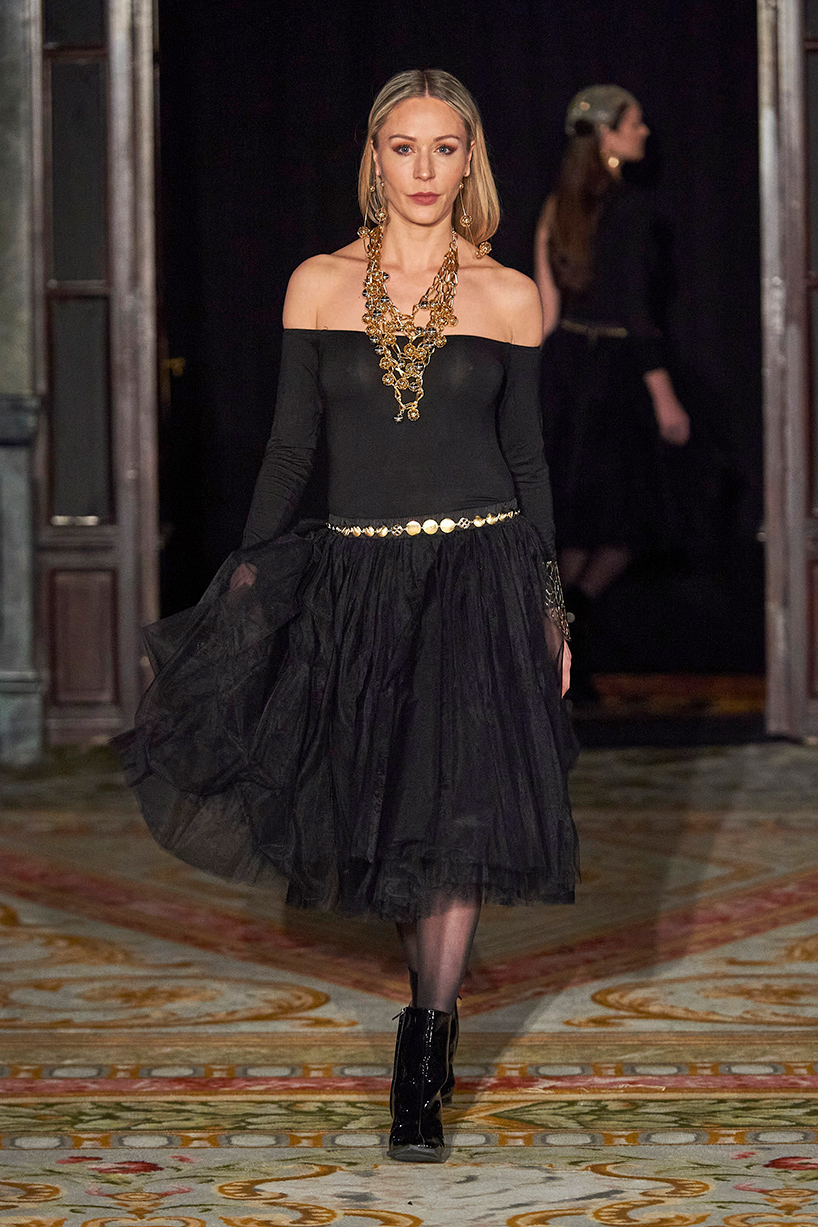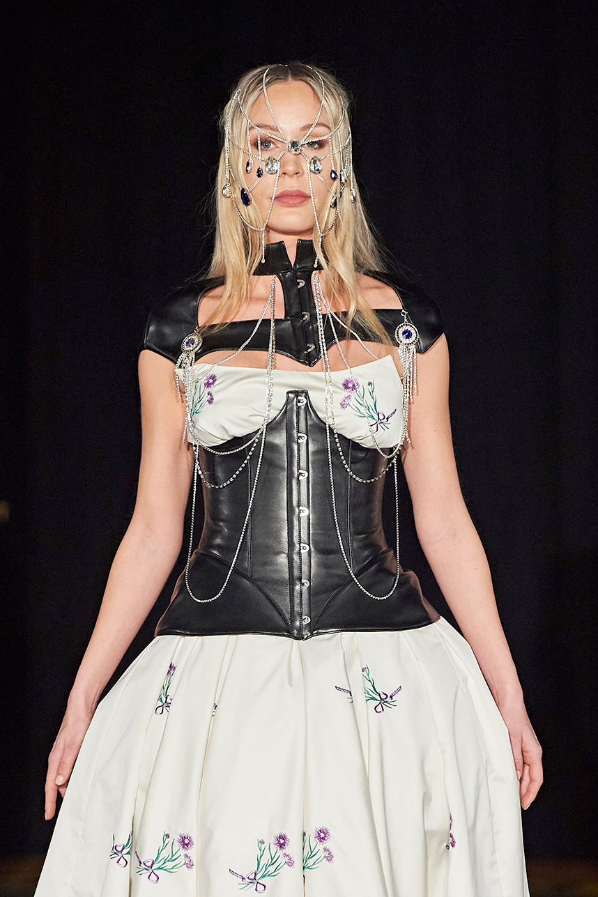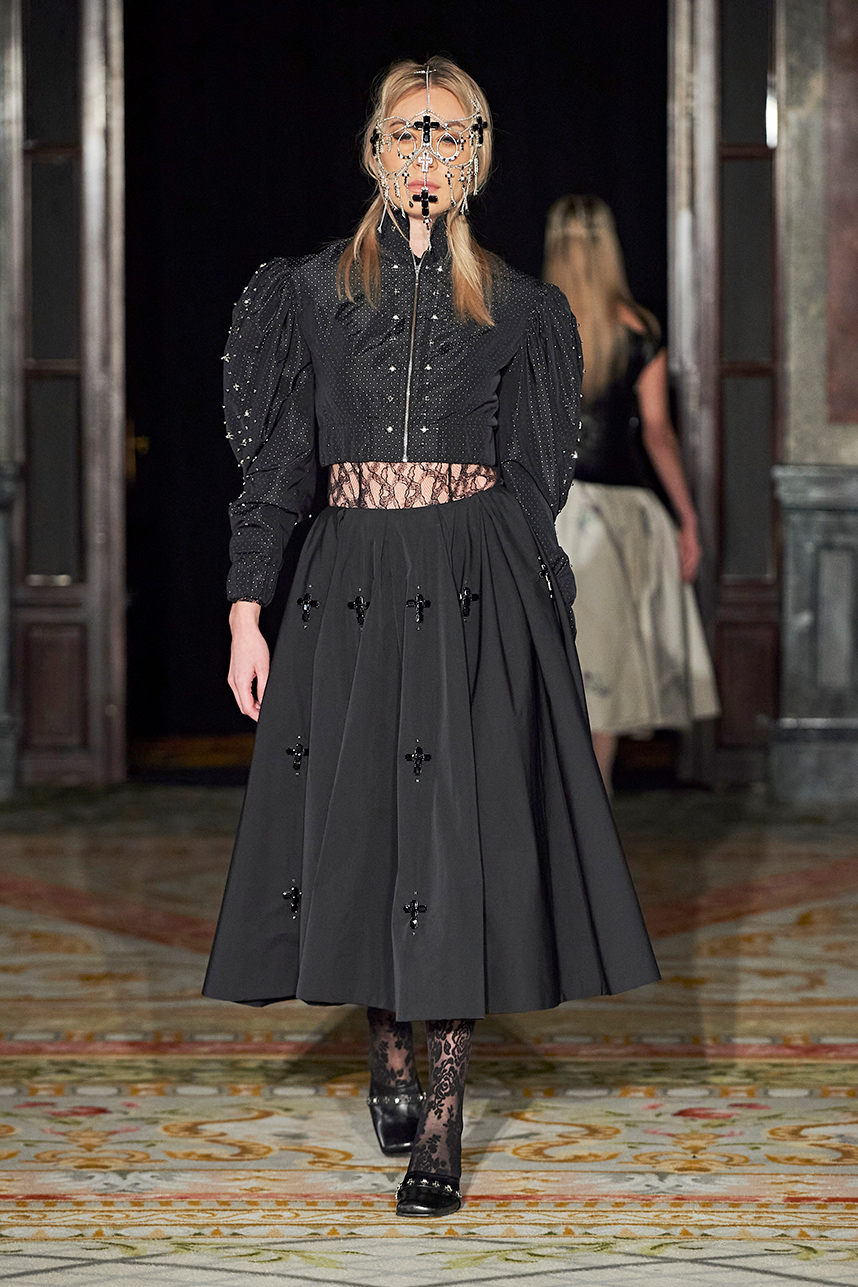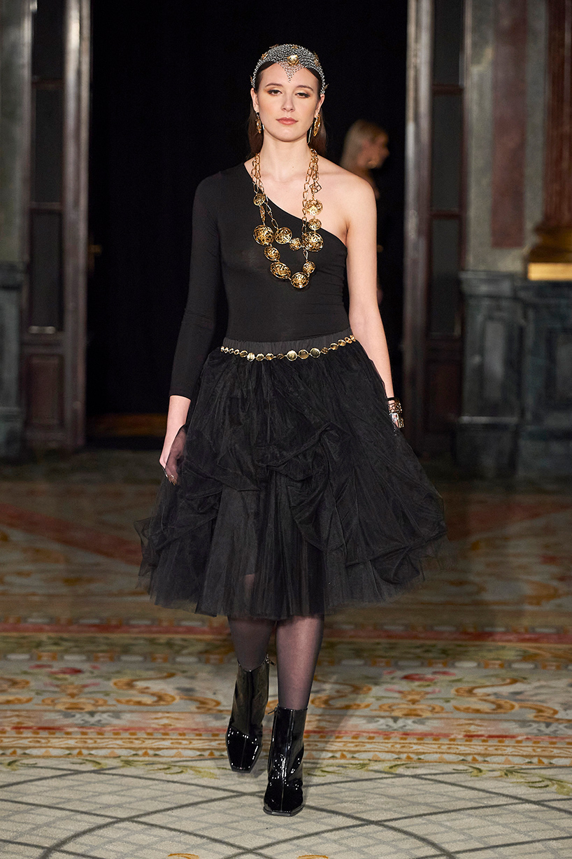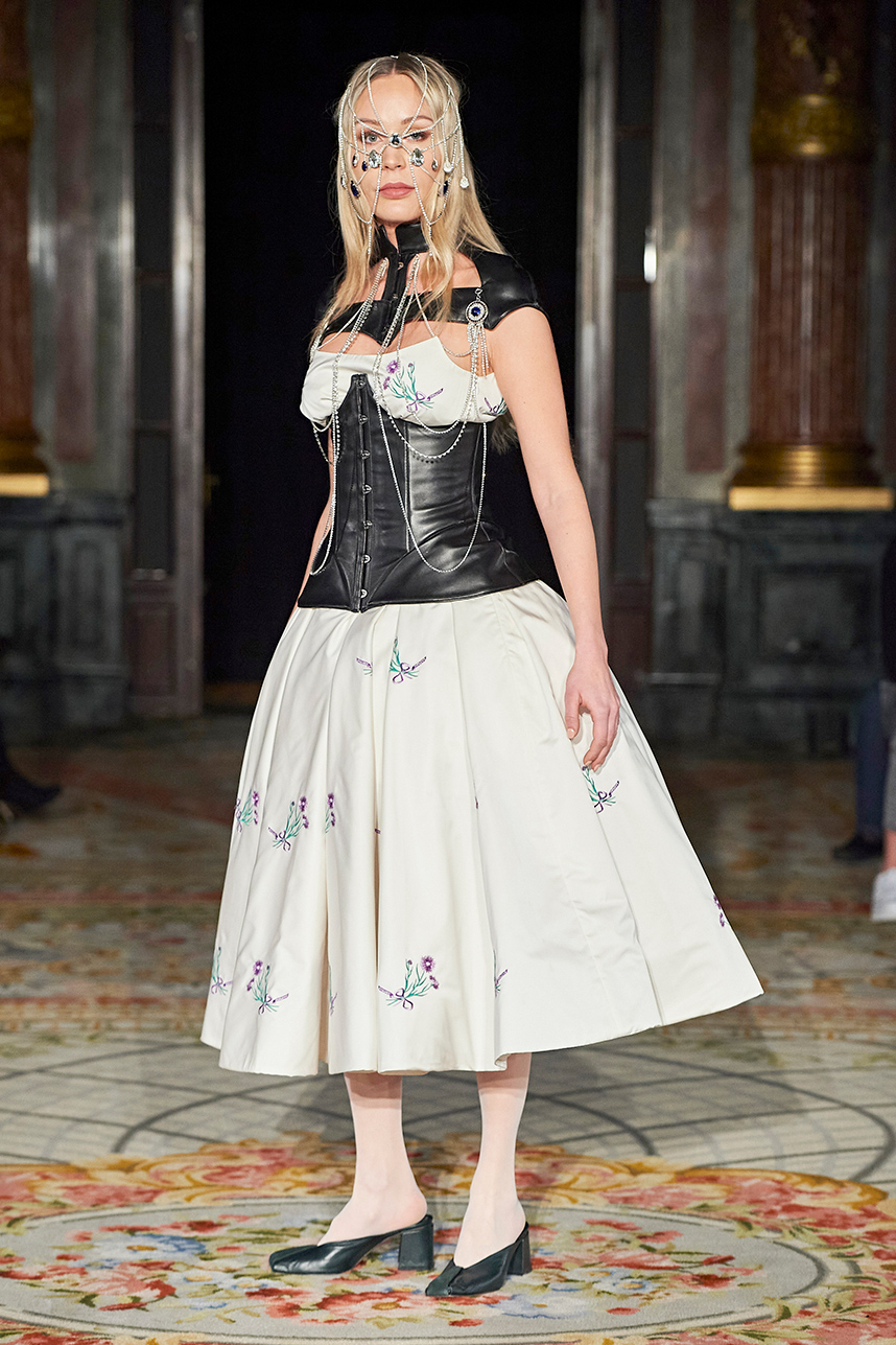 Ukrainian designer Olga Ochkas’s fashion label “Moral Standards” took guests on a journey through historic volumes, bizarre shapes, Victorian motifs with refreshing twists that felt like neveau fashion for the avant garde chic. High quality couture craftsmanship, careful selection of fabrics and attention to finishing details are hallmarks of the brand. Detailed embroidery, expertly executed ruffles, leather corsets and crystal headpieces were intertwined perfectly. The designer sought to demonstrate a contrast of looks with bright line of violet floral embroidery, flowing flower white dresses with frills and puff sleeves contrasting black pieces in the collection consisting of of sinister, heavy full-skirted gowns with stone cross embroideries, black lace and laconic cuts. At the same time, this collection is a continuation of the brand’s style – Victorian silhouettes in silks, organza, lace, volume taffeta gowns and a lot of hand work.