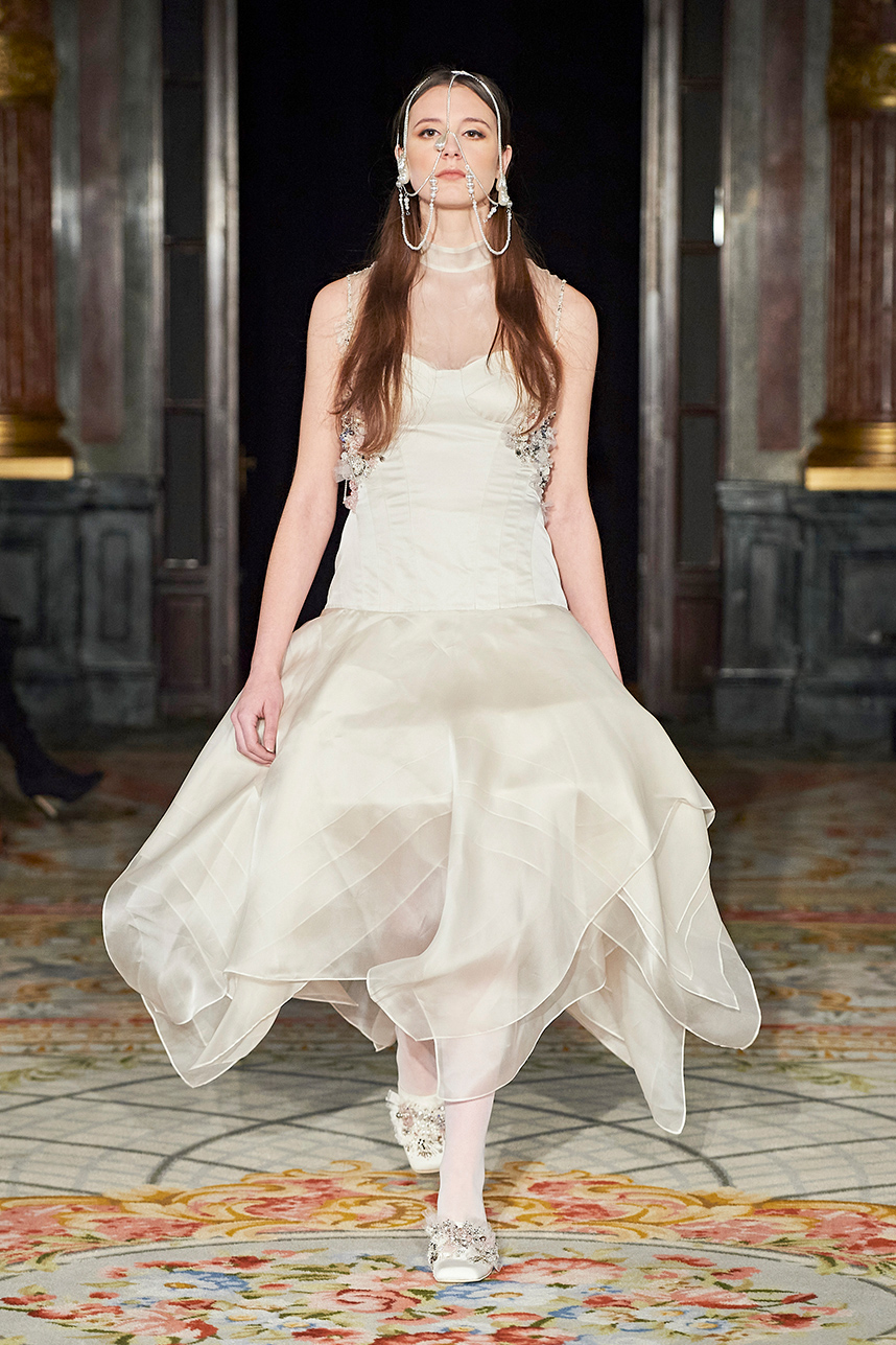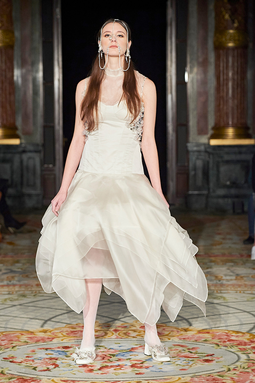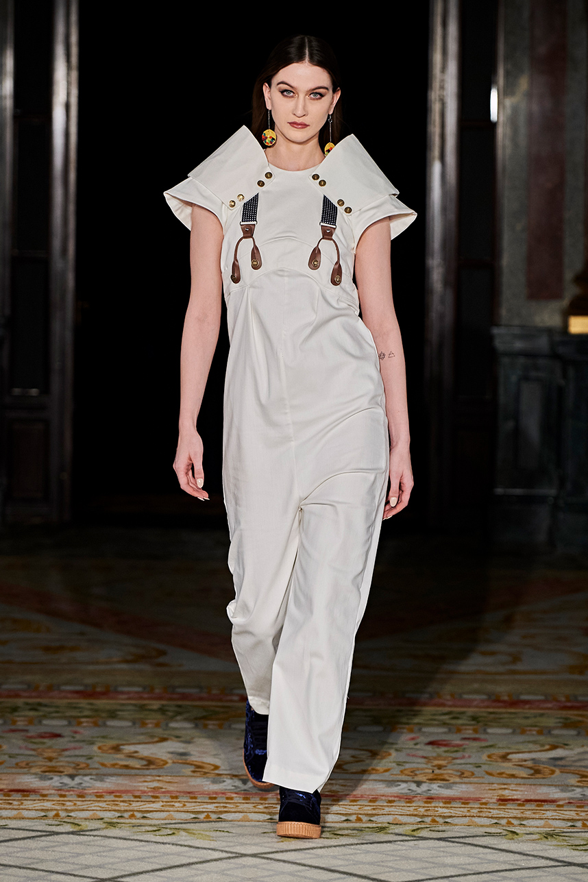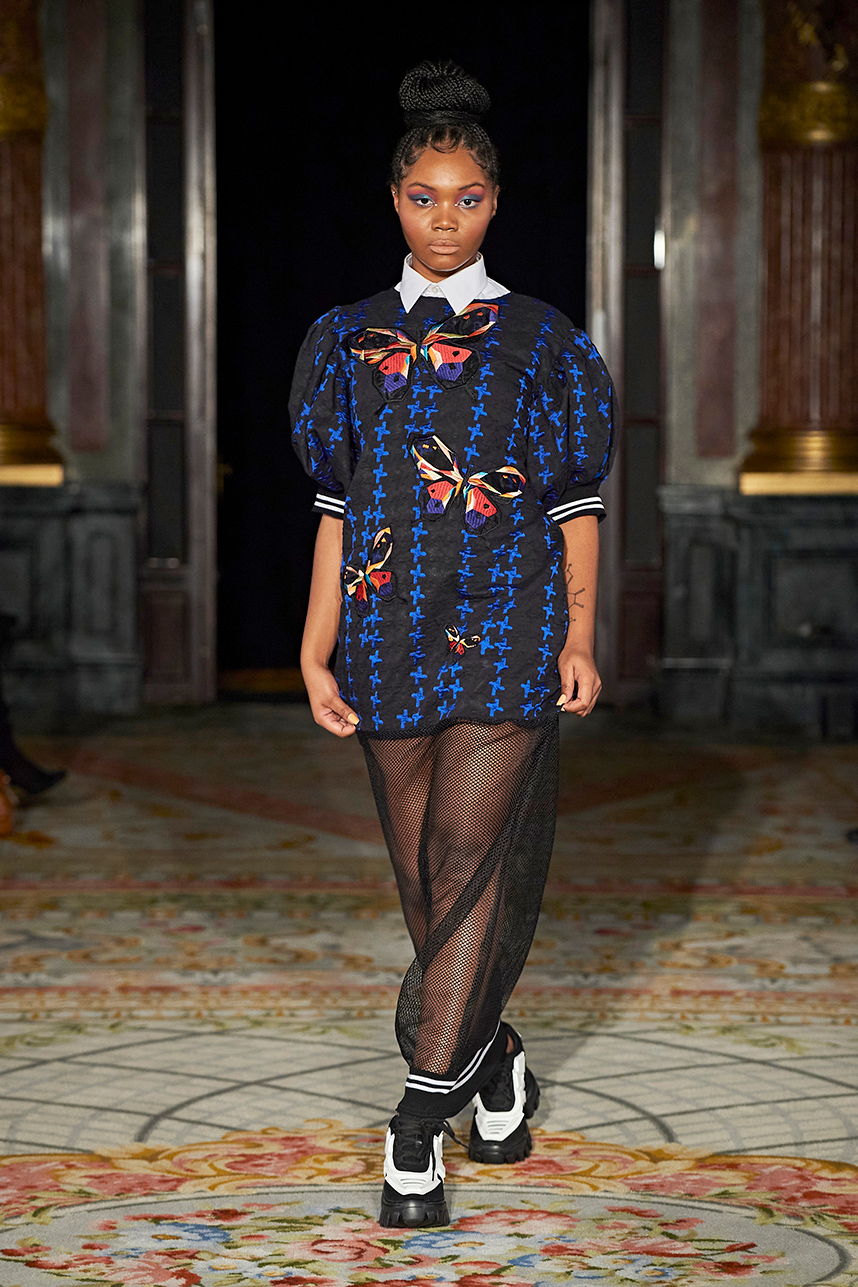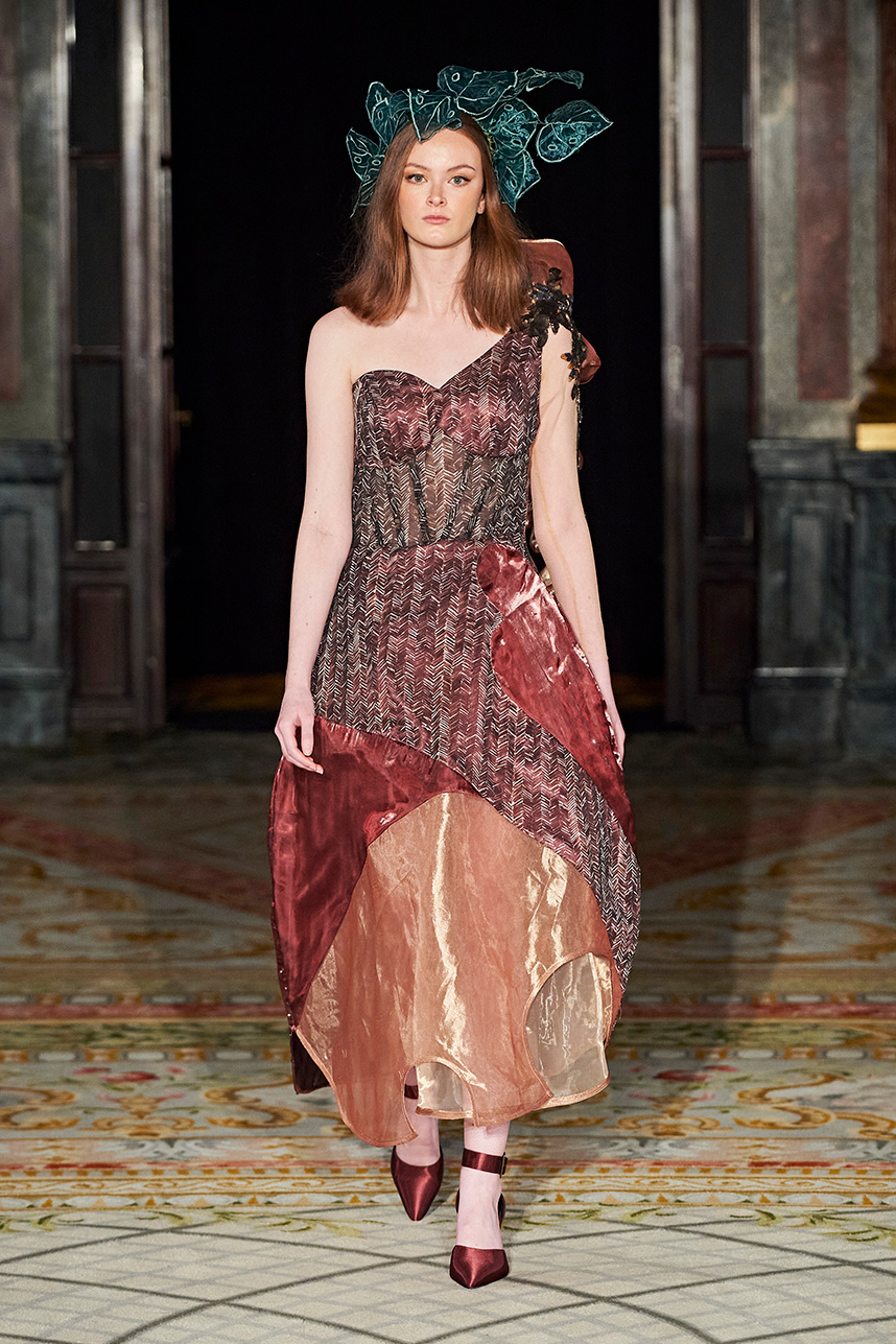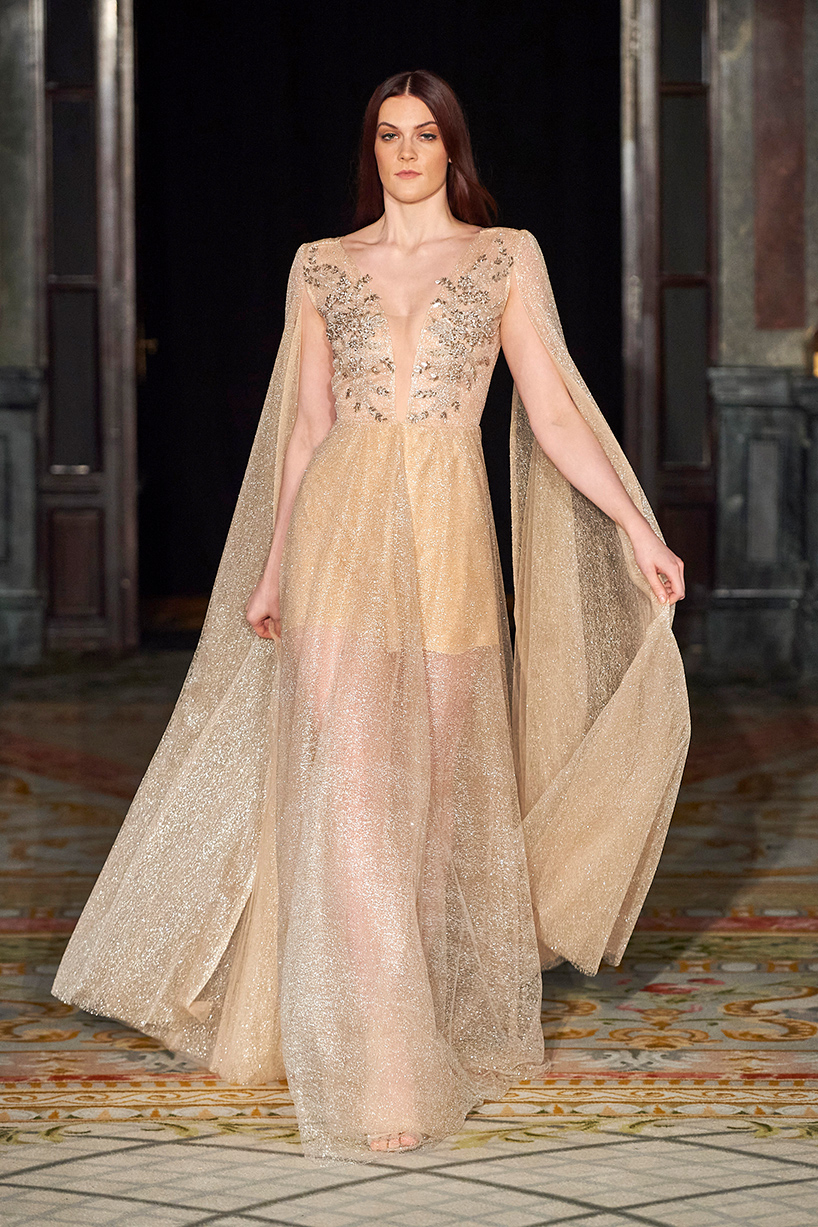 Ukrainian designer Olga Ochkas’s fashion label “Moral Standards” took guests on a journey through historic volumes, bizarre shapes, Victorian motifs with refreshing twists that felt like neveau fashion for the avant garde chic. High quality couture craftsmanship, careful selection of fabrics and attention to finishing details are hallmarks of the brand. Detailed embroidery, expertly executed ruffles, leather corsets and crystal headpieces were intertwined perfectly. The designer sought to demonstrate a contrast of looks with bright line of violet floral embroidery, flowing flower white dresses with frills and puff sleeves contrasting black pieces in the collection consisting of of sinister, heavy full-skirted gowns with stone cross embroideries, black lace and laconic cuts. At the same time, this collection is a continuation of the brand’s style – Victorian silhouettes in silks, organza, lace, volume taffeta gowns and a lot of hand work.