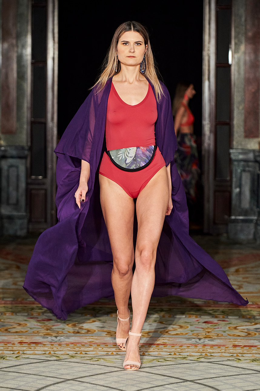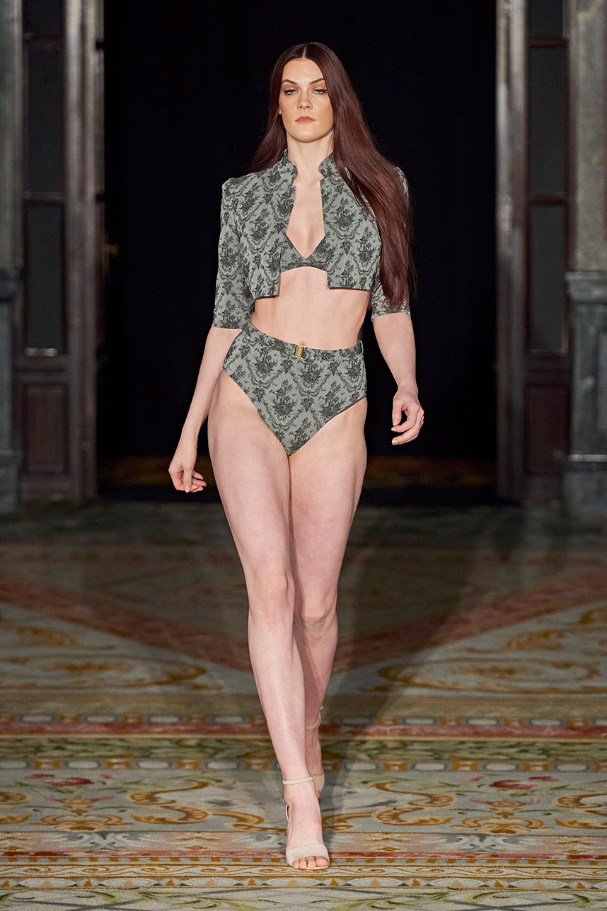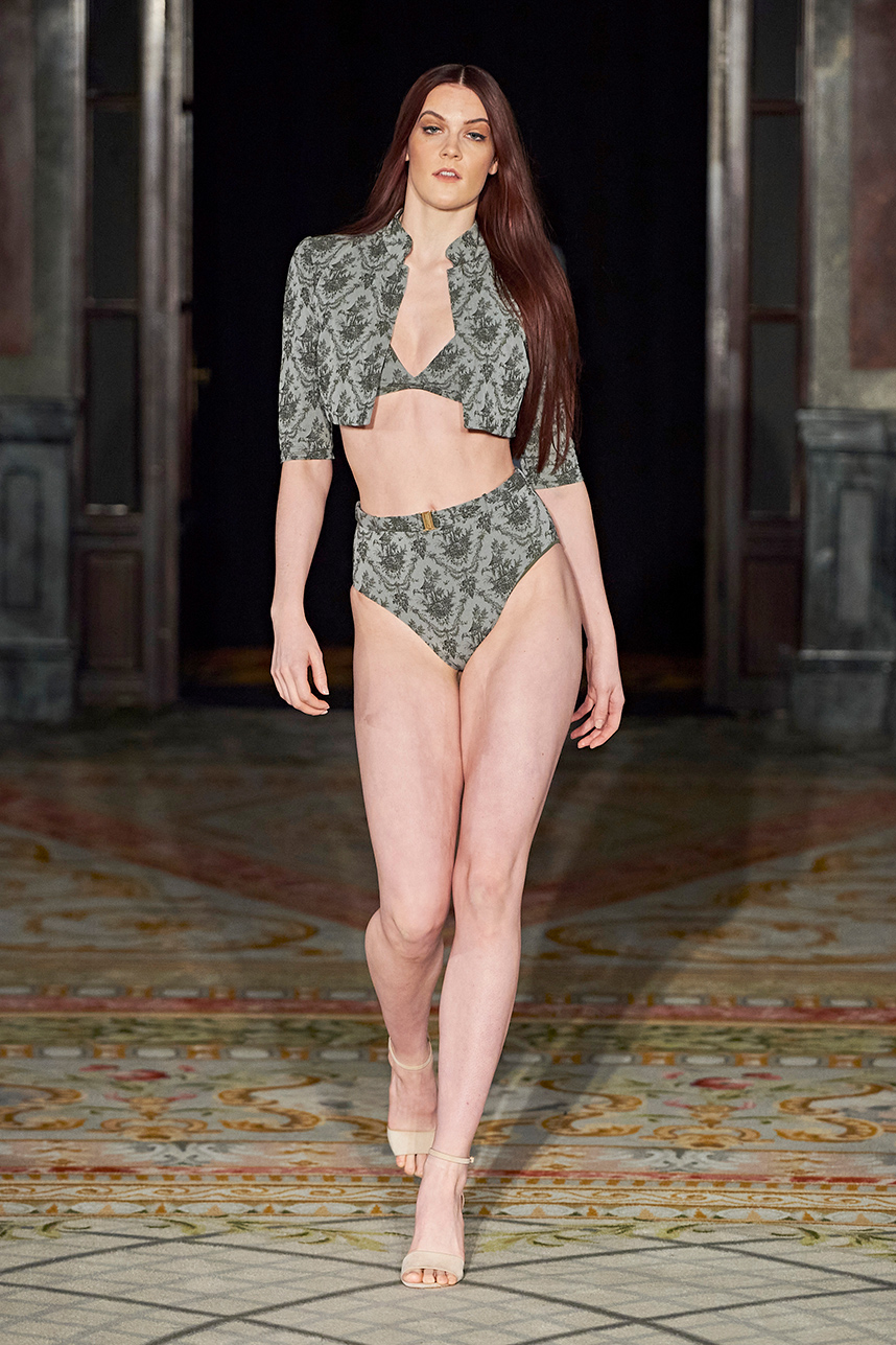 AMAIÒ is a women’s luxury swim & resort wear label founded by Samantha Khoury in 2016. The Los Angeles-based label focuses on craft and fit. The collection “La Rose Nocturne” embodied the essence of European romanticism with a mix of swim and resort wear pieces that can be incorporated as ready to wear pieces for a sophisticated woman’s wardrobe. Inspired by the lustrous textiles and opulence of the 1700s, the collection transported the wearer to the magnificent chateaus of France’s Loire Valley. Intricate bustier-like forms, embroidered popcorn tulle, extravagant reinterpretations of our high-neck maillots, Italian eurojersey, French swim jacquard and embroidered French tulle in rich plums, nudes, metallics, and dark florals sauntered down the runway. Amaiò’s color palette and textures evoked a dream-like experience and romantic nostalgia where California Coast and Old European Romanticism. The crowd was truly transported to a romantic 18th century French chateau.
