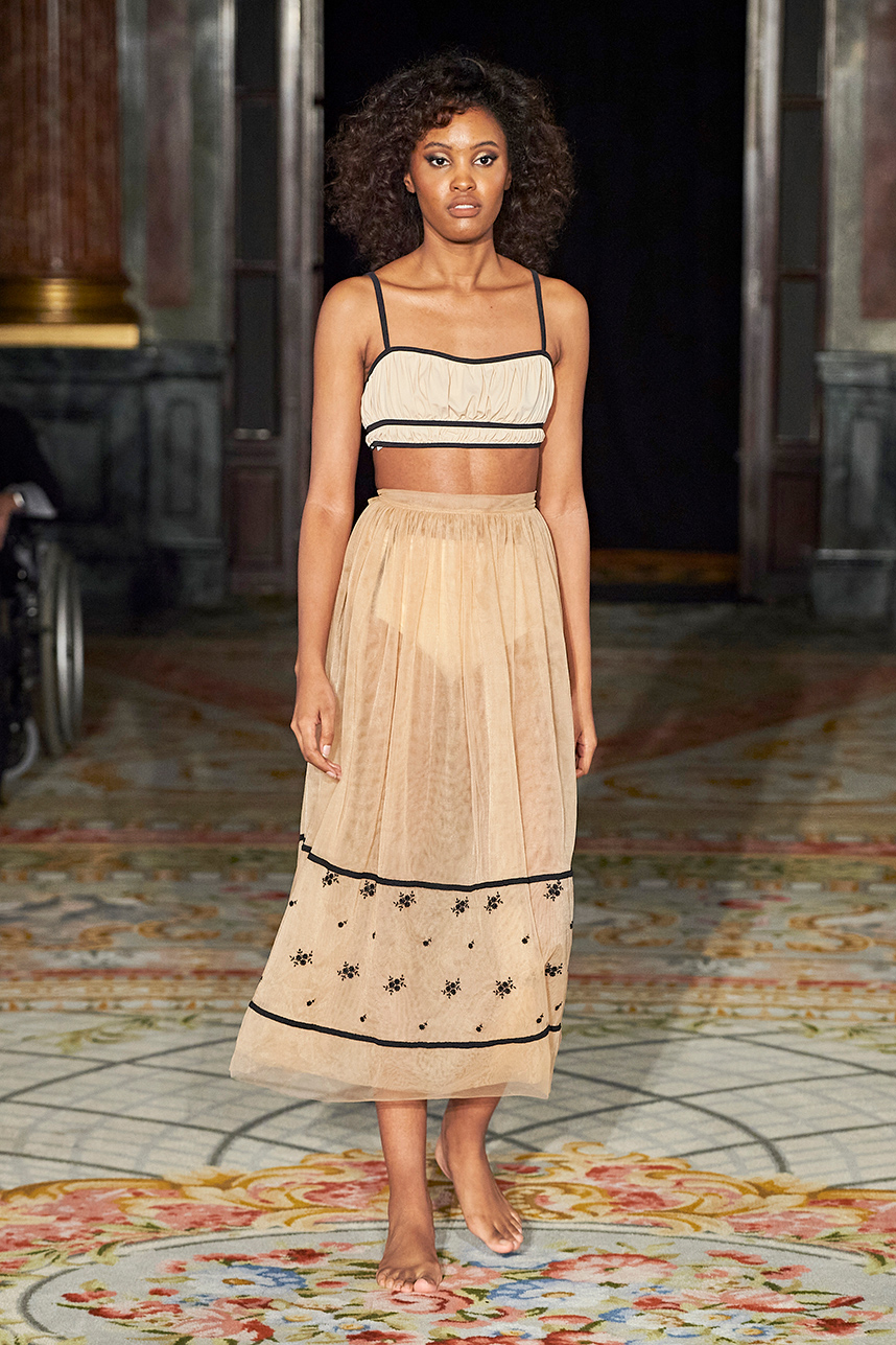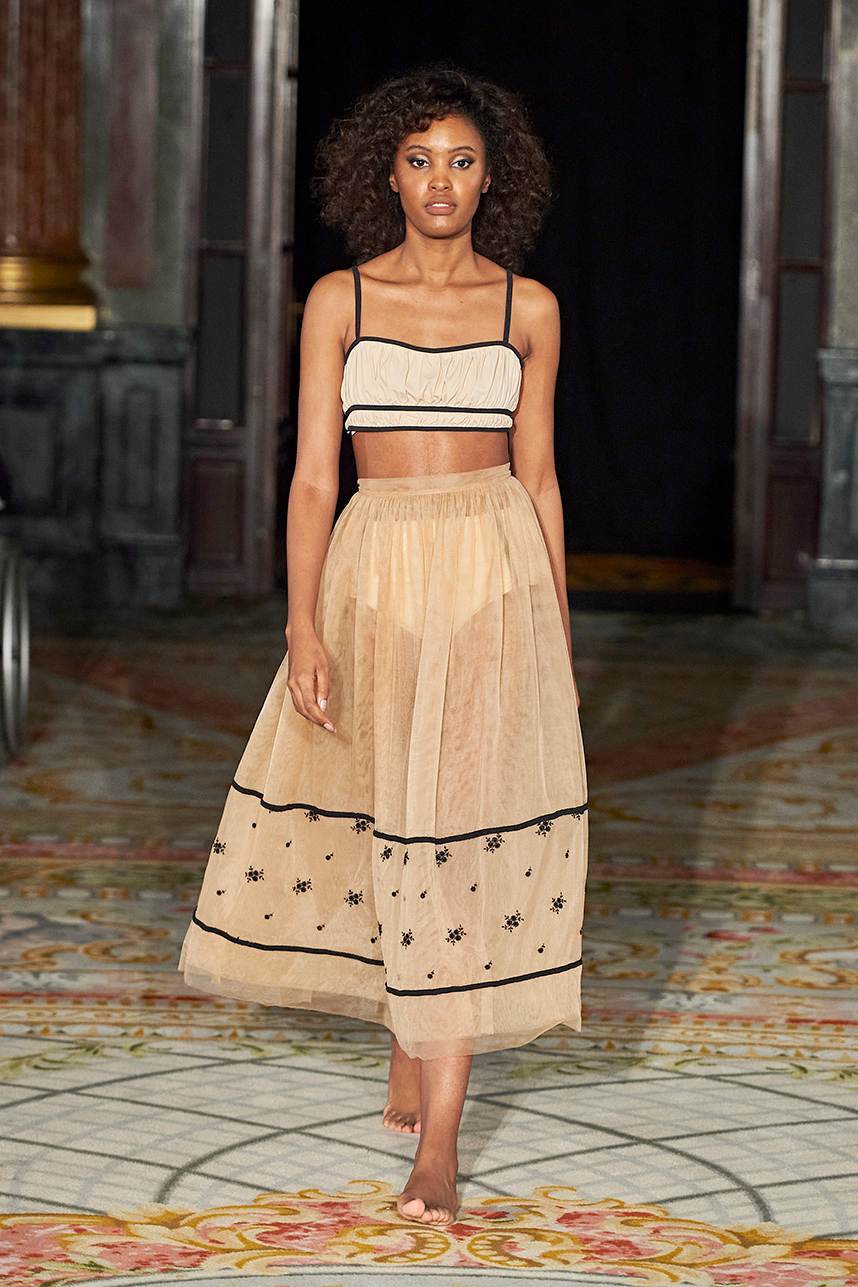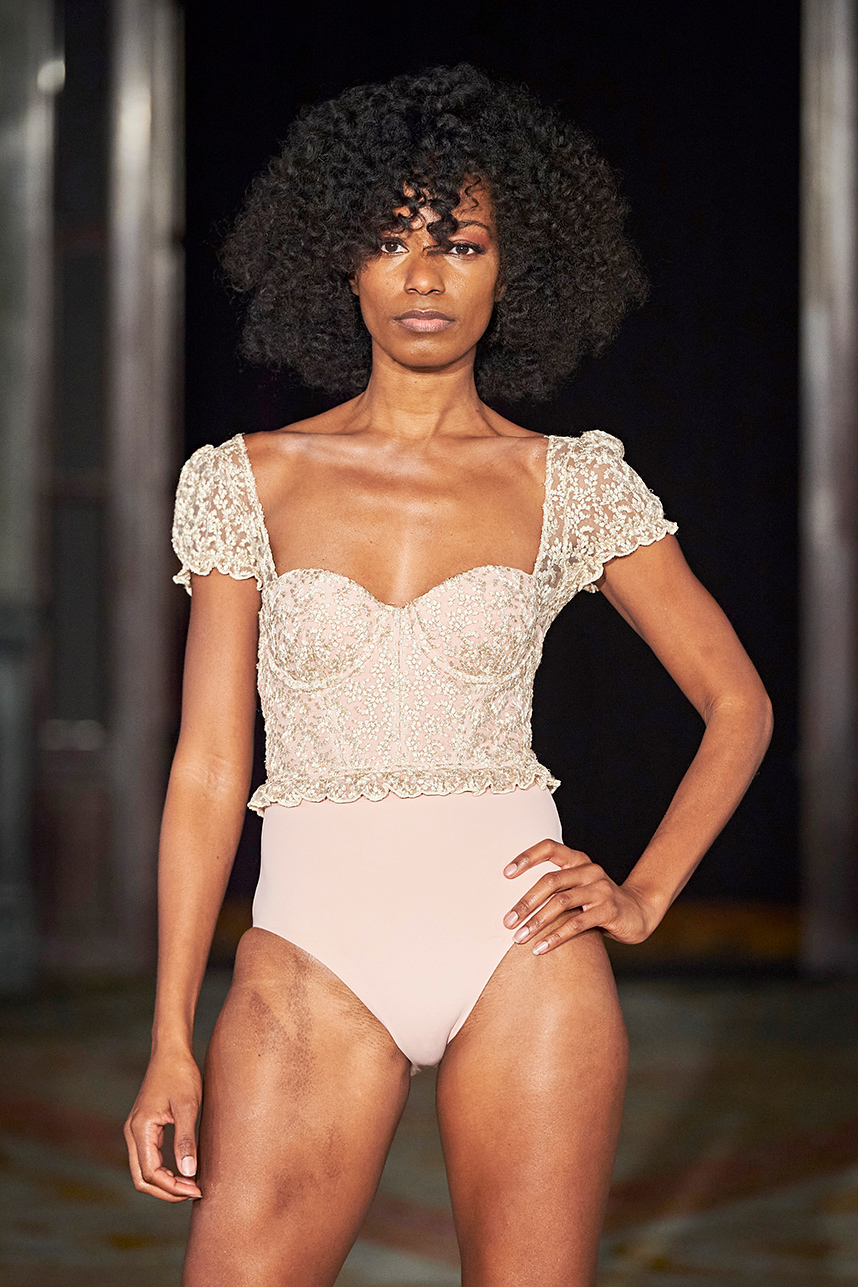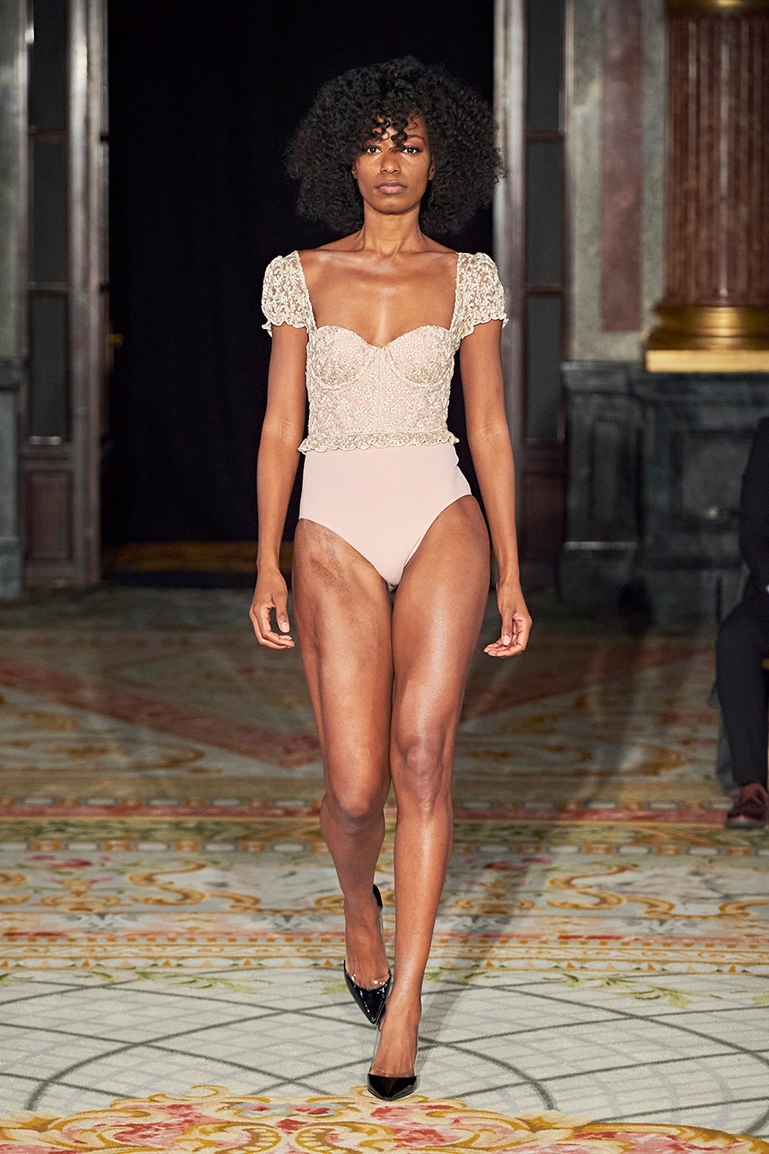 AMAIÒ is a women’s luxury swim & resort wear label founded by Samantha Khoury in 2016. The Los Angeles-based label focuses on craft and fit. The collection “La Rose Nocturne” embodied the essence of European romanticism with a mix of swim and resort wear pieces that can be incorporated as ready to wear pieces for a sophisticated woman’s wardrobe. Inspired by the lustrous textiles and opulence of the 1700s, the collection transported the wearer to the magnificent chateaus of France’s Loire Valley. Intricate bustier-like forms, embroidered popcorn tulle, extravagant reinterpretations of our high-neck maillots, Italian eurojersey, French swim jacquard and embroidered French tulle in rich plums, nudes, metallics, and dark florals sauntered down the runway. Amaiò’s color palette and textures evoked a dream-like experience and romantic nostalgia where California Coast and Old European Romanticism. The crowd was truly transported to a romantic 18th century French chateau.