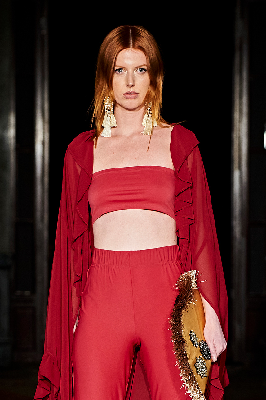 The I AM SO KATE collection “Island Resort” captured the essence of the brands commitment catering to the spirit of the adventurous traveling women looking for a vacation wardrobe. Lightweight fabrics of silky chiffon prints, vegan silk, and denim were used to create perfectly tailored cigarette pants, bandeau tops, jumpers, shorts and ethereal kimonos that could be worn on the beach or a red carpet. The jewel tones of the collection had the audience swooning with deep raspberry reds, island blues, carribean yellow and purple passion, harmoniously intertwined creating the perfect oasis look for any traveler.
