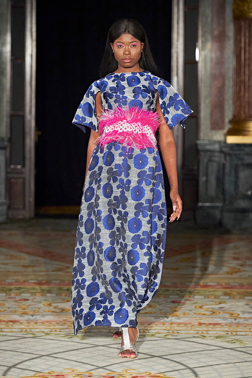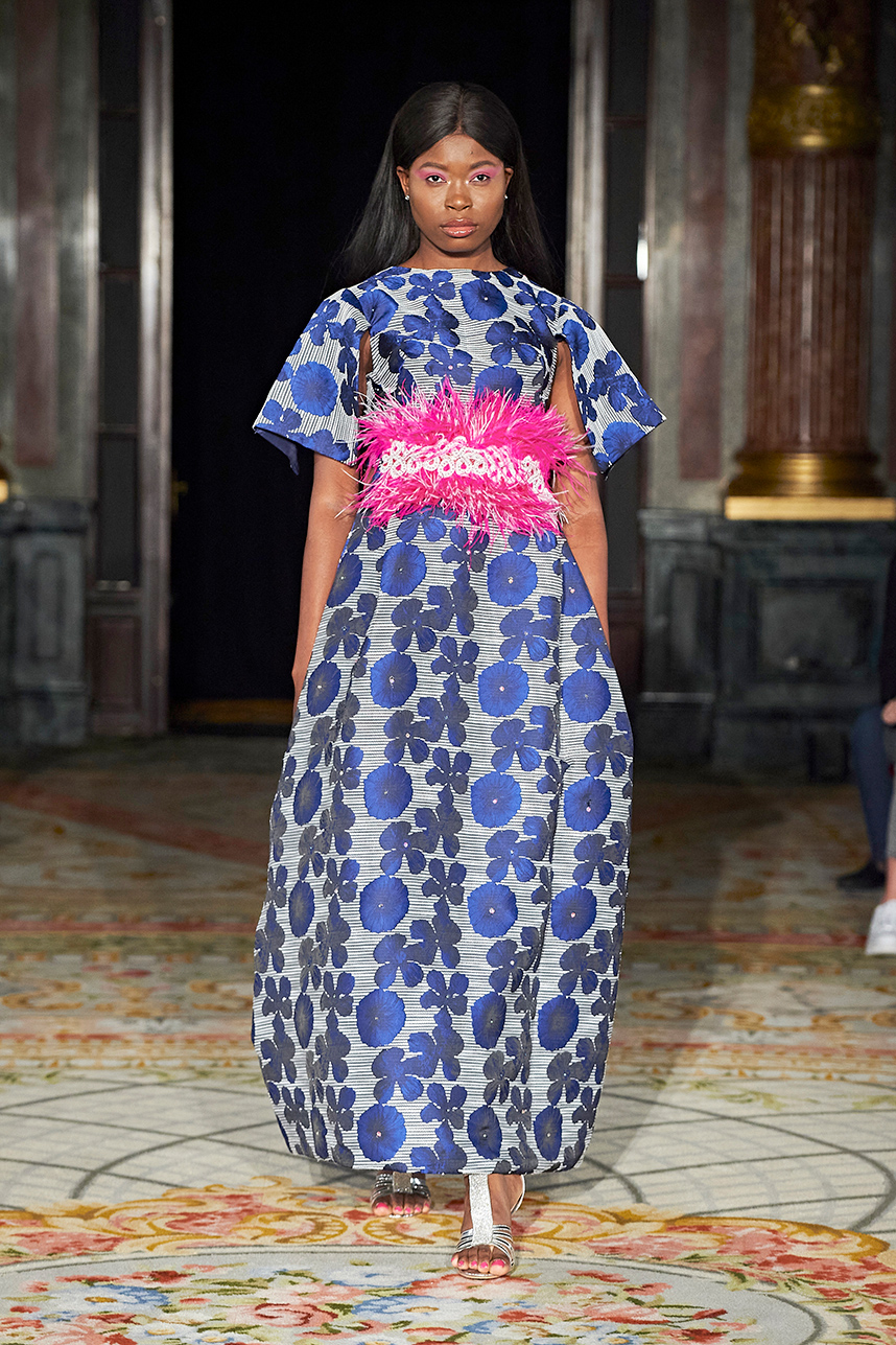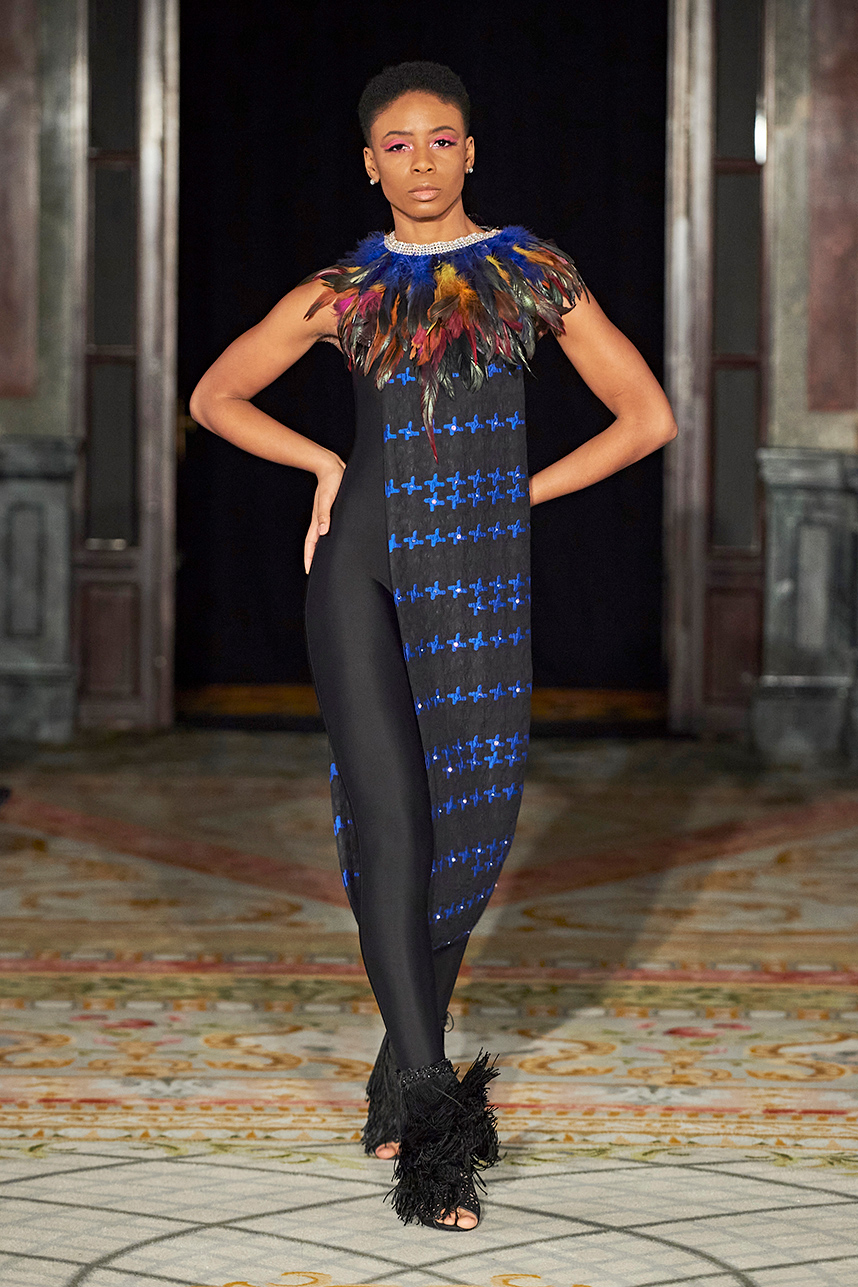 This Sister Duo Duana and Toni Hyde from Atlanta showcased their custom womenswear couture collection during their Paris debut. The collection “Nouvelle Collection Royale » consisted of cotton, beading, chiffon, and multi-colored feathers. Bold patterns dominated the collection from a deep royal blue plaid to flirty florals and feathered collars that commanded the runway.