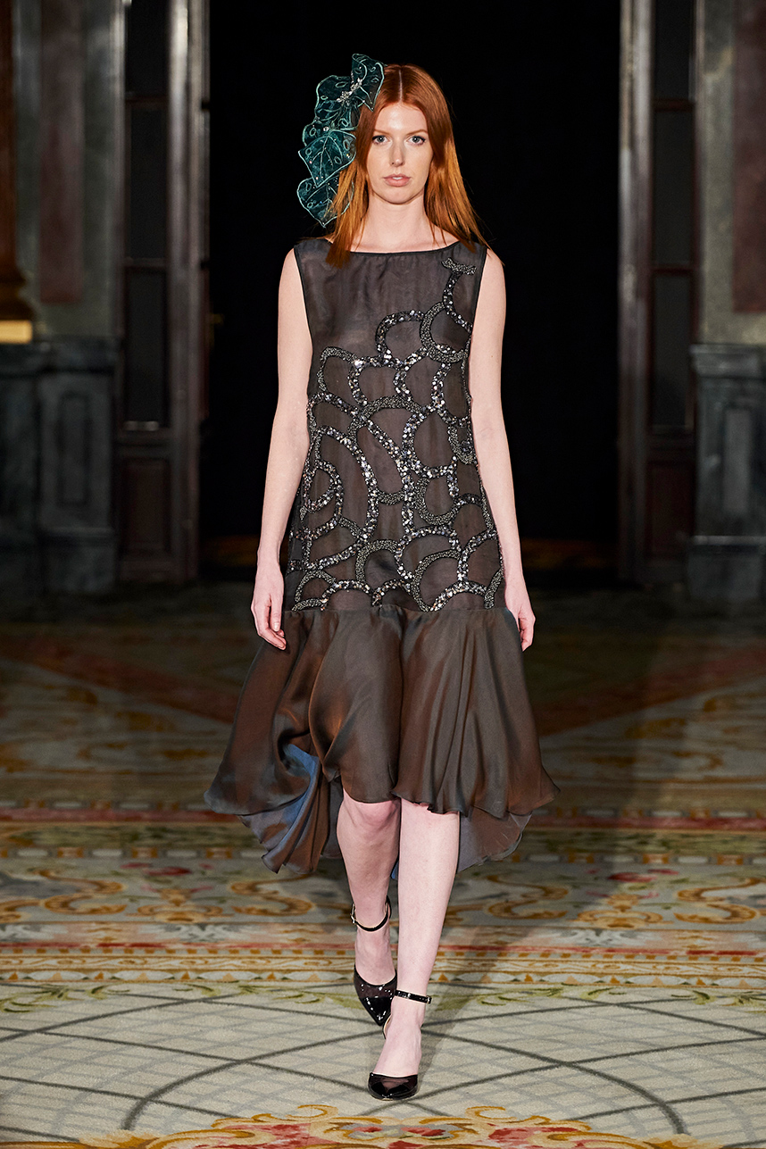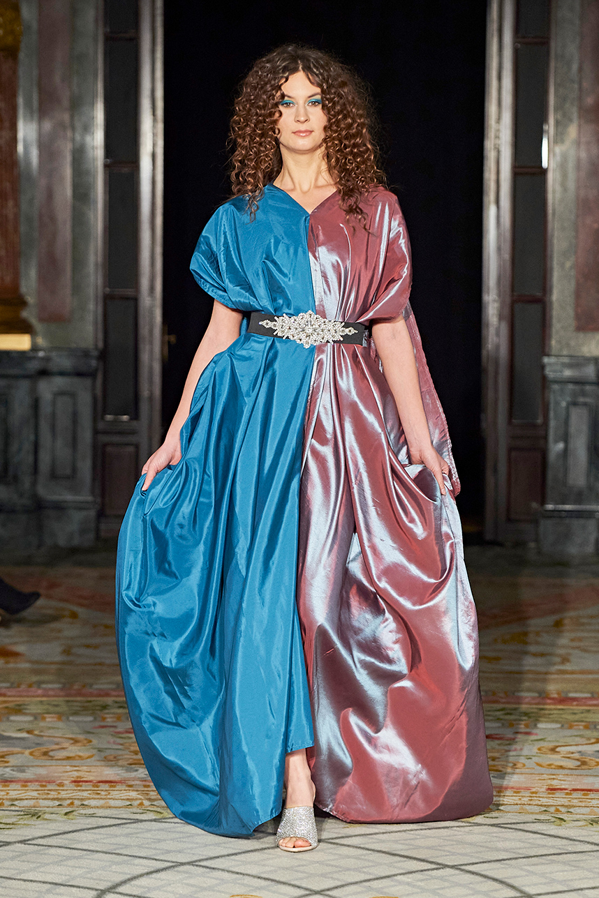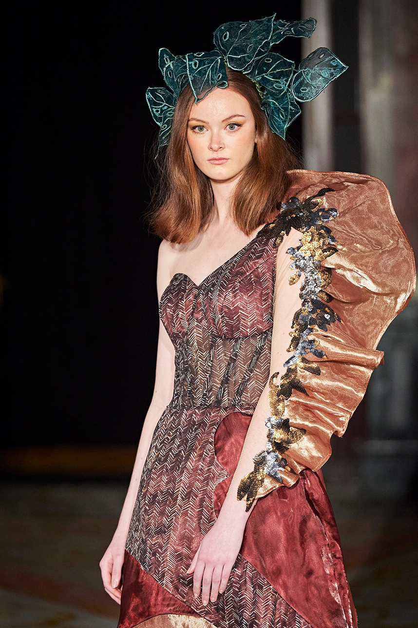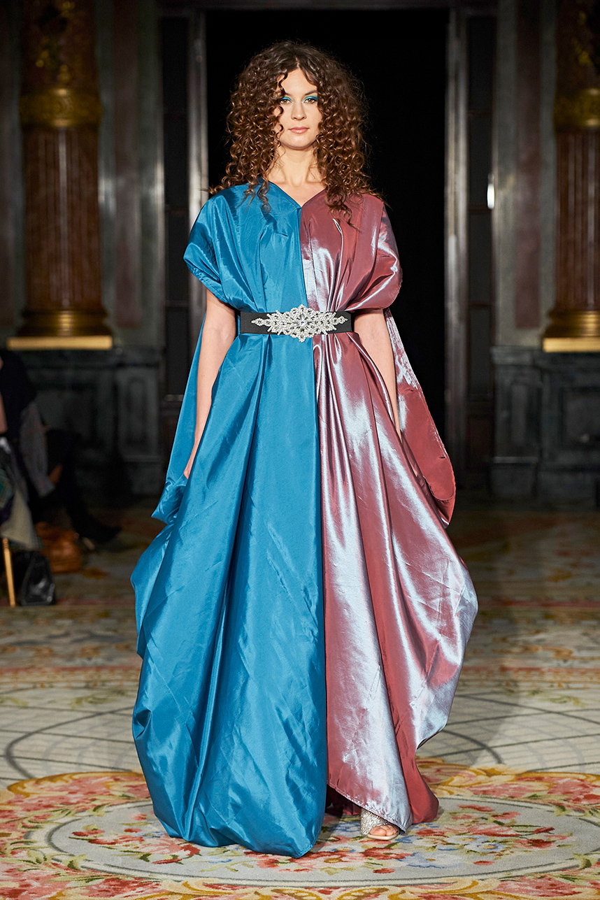 Singapore-based designer Tessa Lont launched Lontessa in 2014. The AW20 collection was true to her signature style of thoughtful engagement with sustainability in materials and the elevated life cycles of her garments. Passionate about honouring materials and practice, Lont introduced possum fur outerwear to the globe and into the luxury sphere. SIlks and sequins dominated the couture collection “Buried Treasures” in plums, seaweed greens, sunset blues, rusty golds with shimmery and feather details that dazzled.