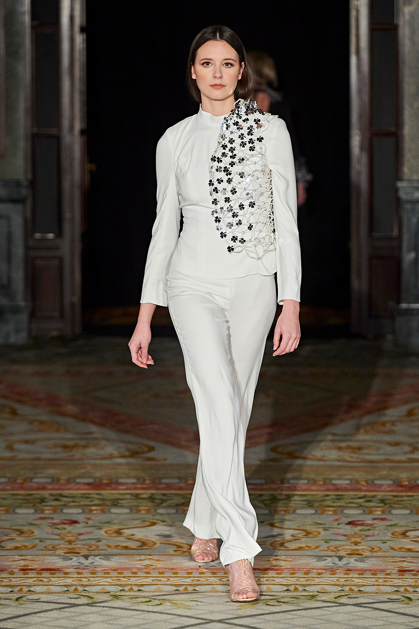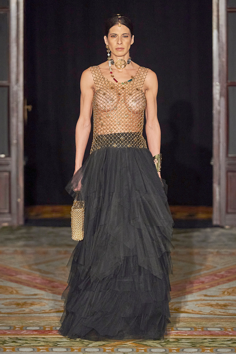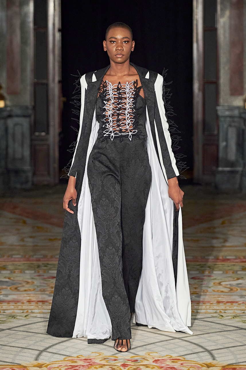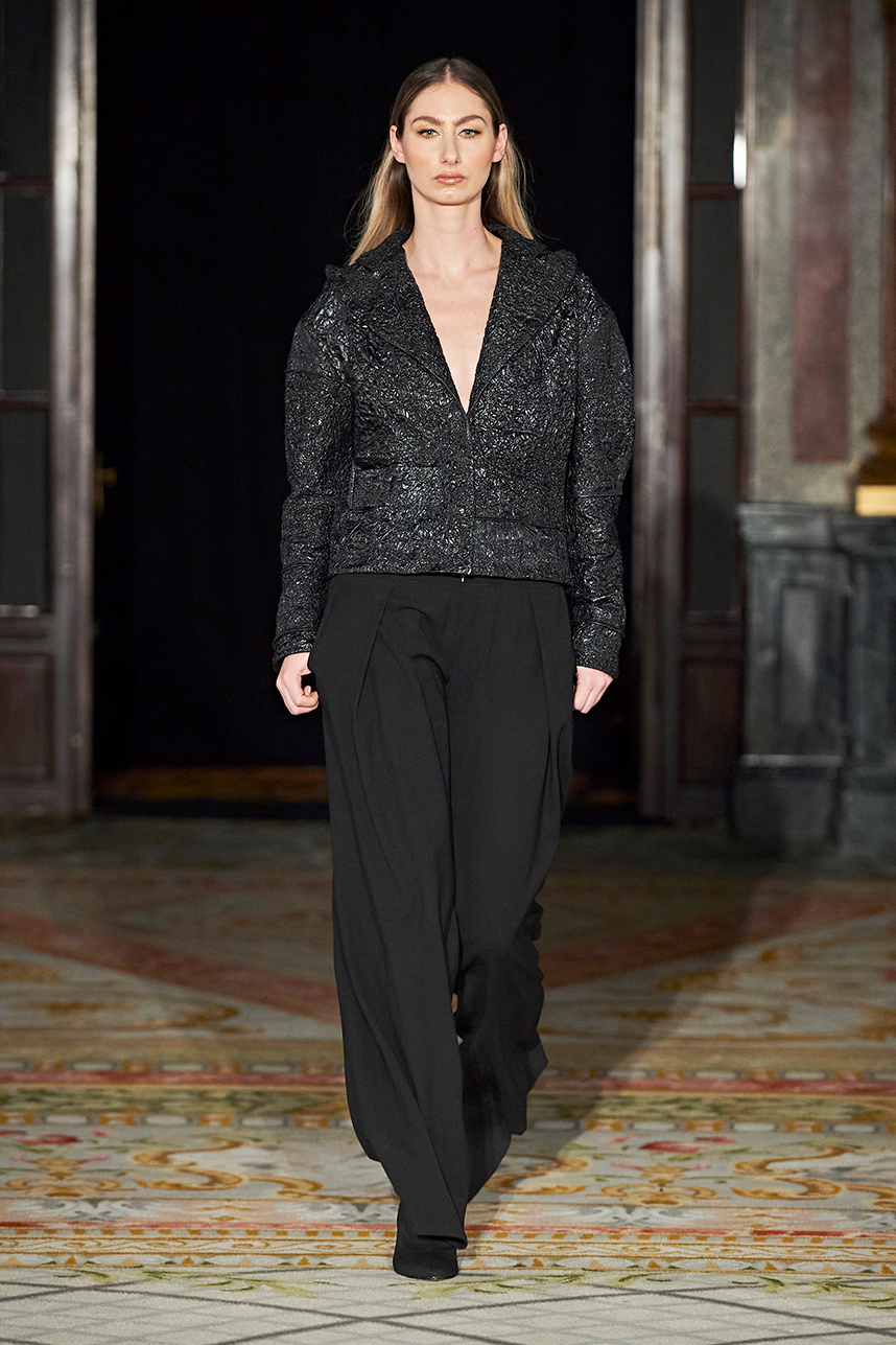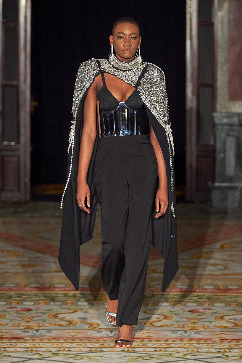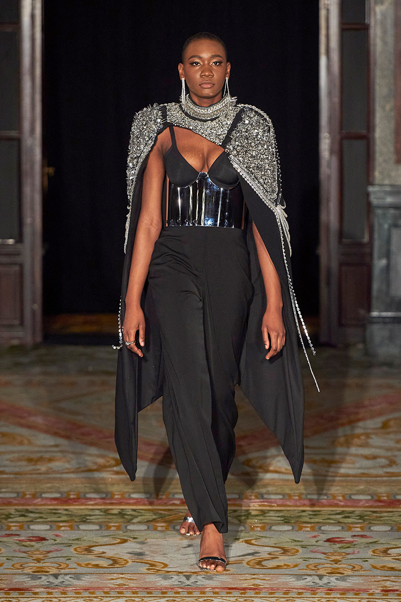 Spanish based designers Carmen Ramil and Gemma Pujalte, the phenoms behind the label Ramil & Pujalte presented a stunning collection entitled “Klimt” featuring tailormade pieces with intricate detailing that felt fresh and couture. The fabrics, made in-house, such as silk and plexiglass resulted in a sculptural and artistic collection that felt wearable and elevated. Inspired by Gustav Klimt, the designers used rigid materials such as metal and methacrylate, along with cotton and acetate to create ornamental garments. The concept of opposites dominated the color palette showcasing black versus white, gold versus silver and translucent versus opaque.
