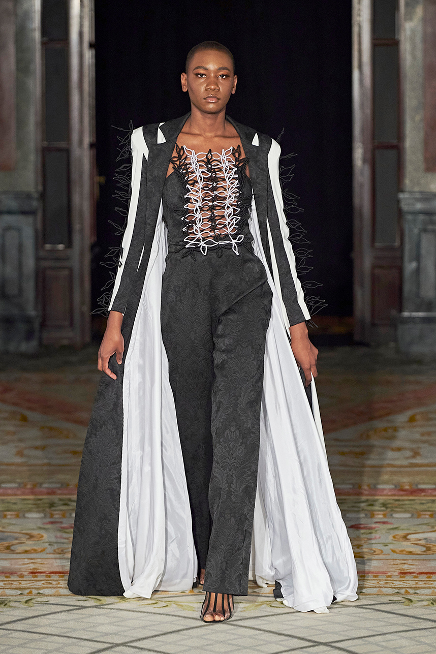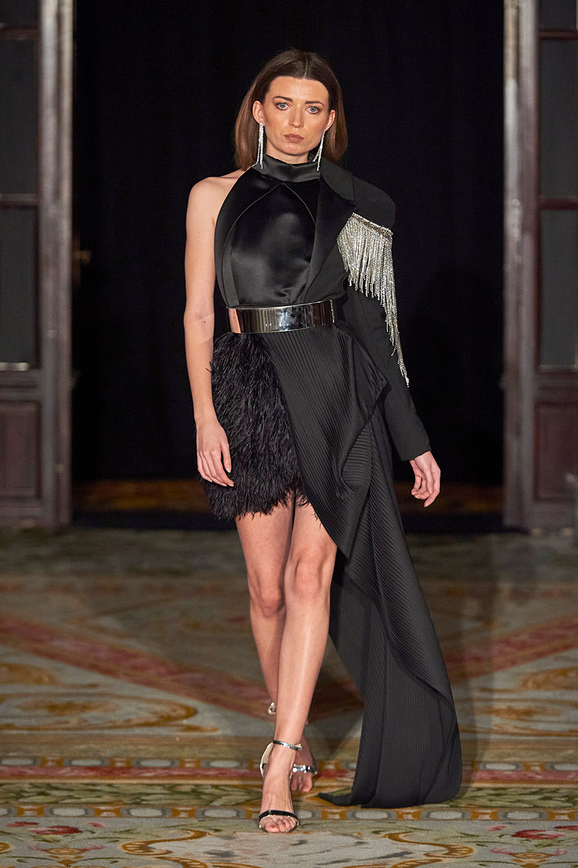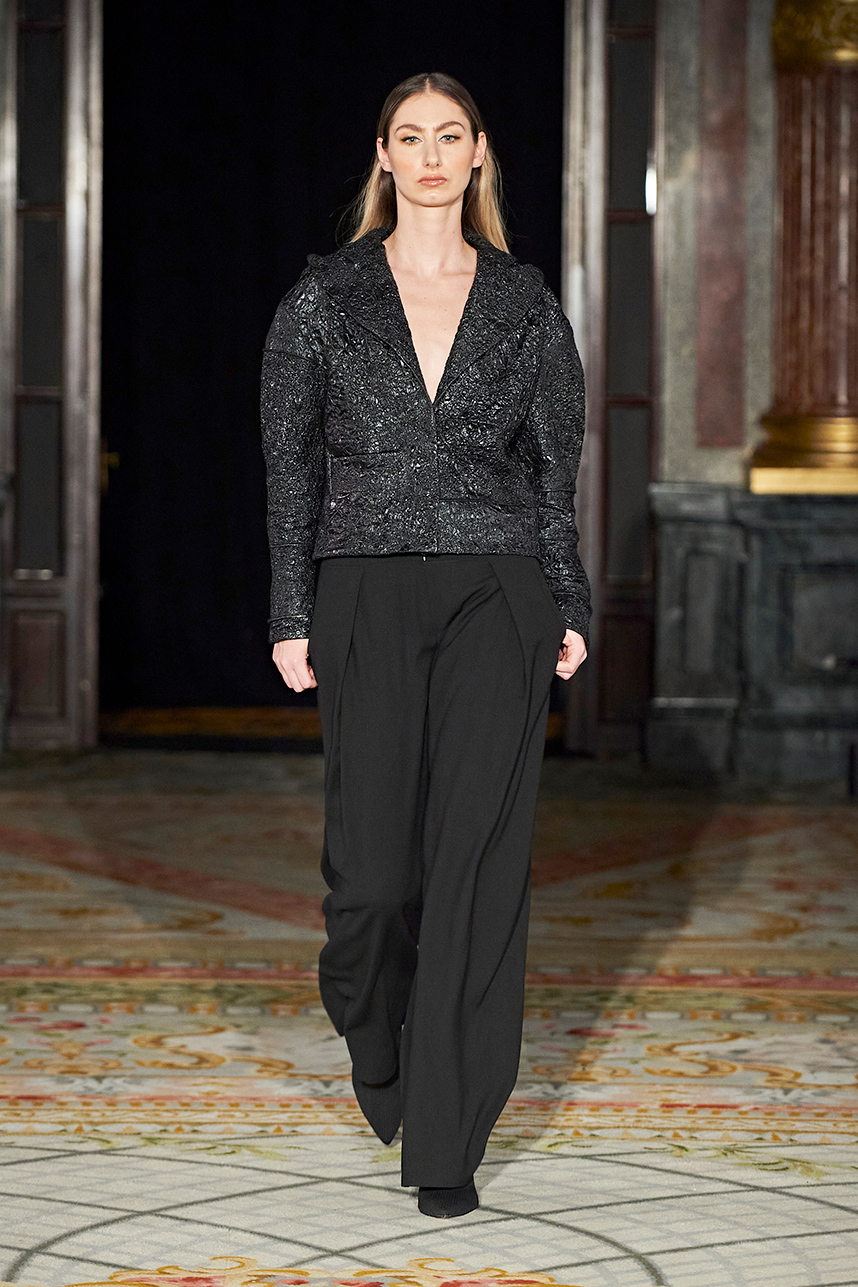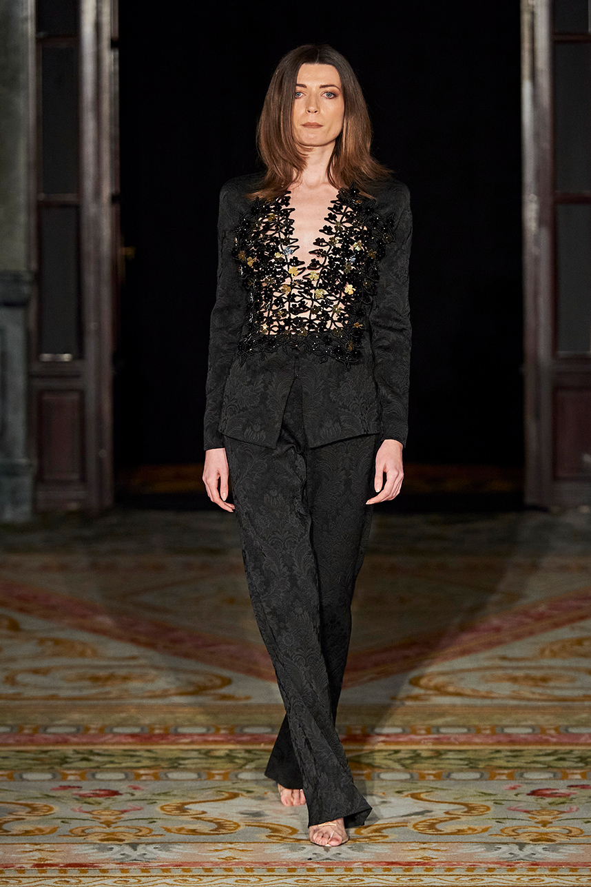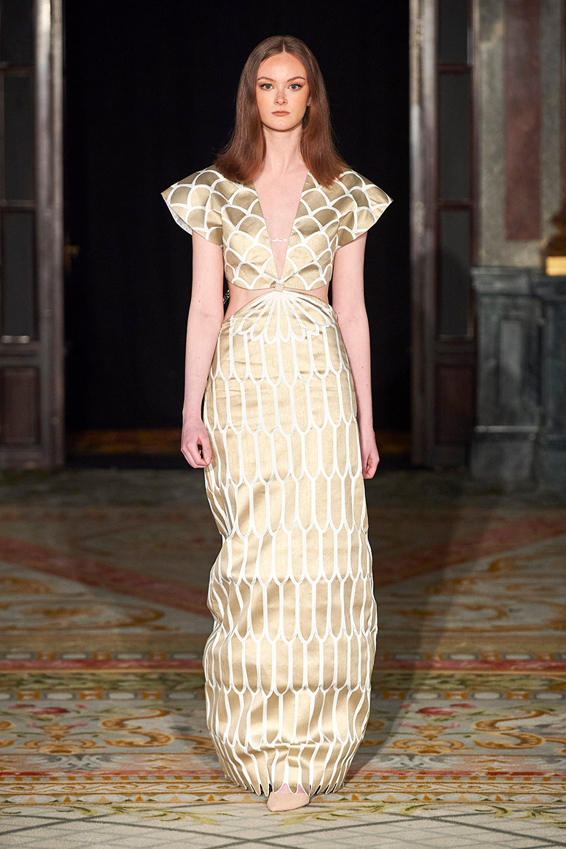 Spanish based designers Carmen Ramil and Gemma Pujalte, the phenoms behind the label Ramil & Pujalte presented a stunning collection entitled “Klimt” featuring tailormade pieces with intricate detailing that felt fresh and couture. The fabrics, made in-house, such as silk and plexiglass resulted in a sculptural and artistic collection that felt wearable and elevated. Inspired by Gustav Klimt, the designers used rigid materials such as metal and methacrylate, along with cotton and acetate to create ornamental garments. The concept of opposites dominated the color palette showcasing black versus white, gold versus silver and translucent versus opaque.