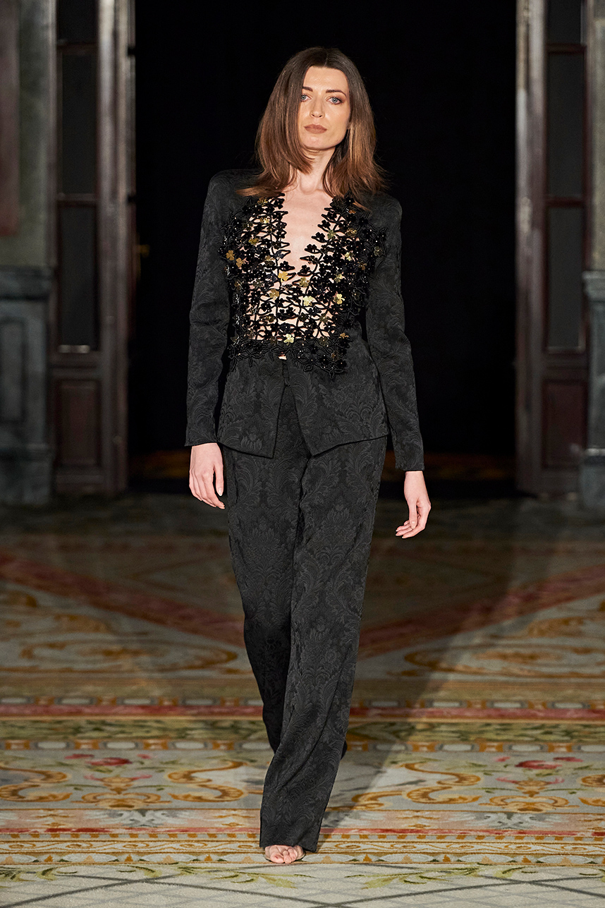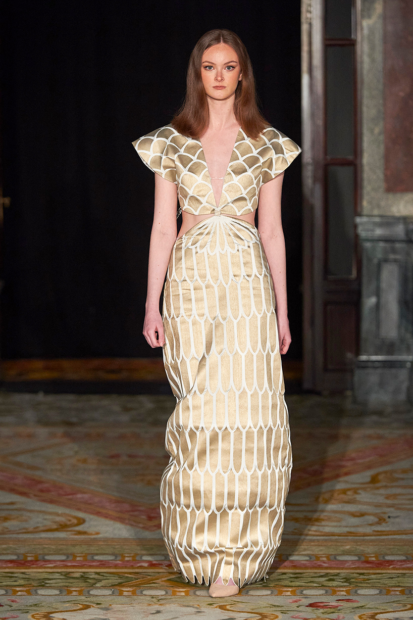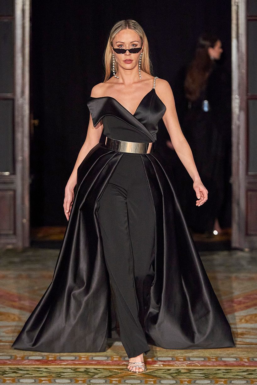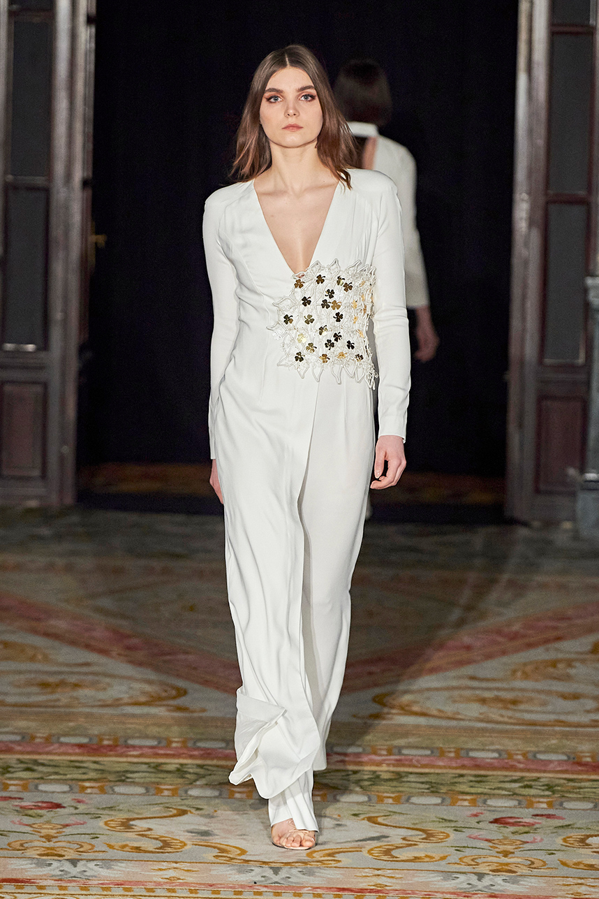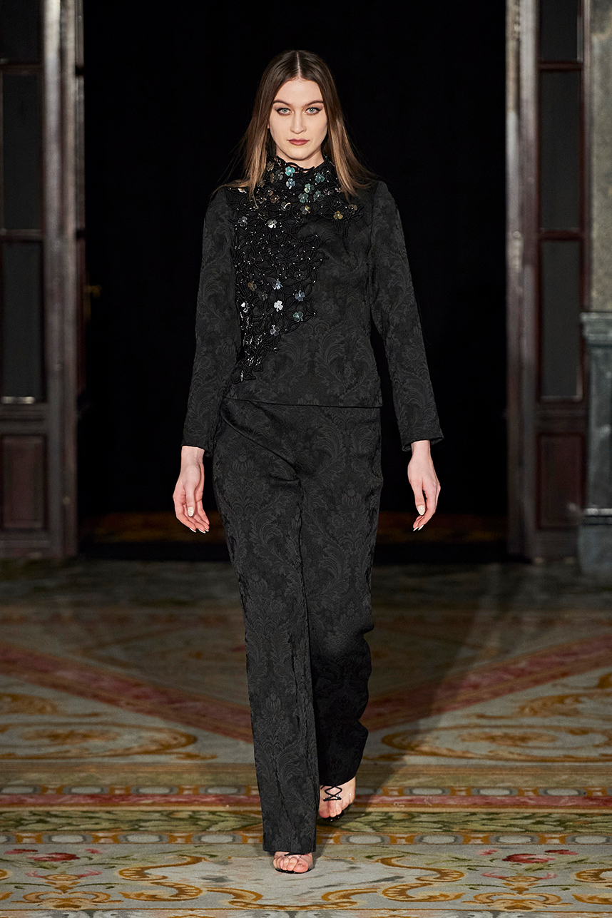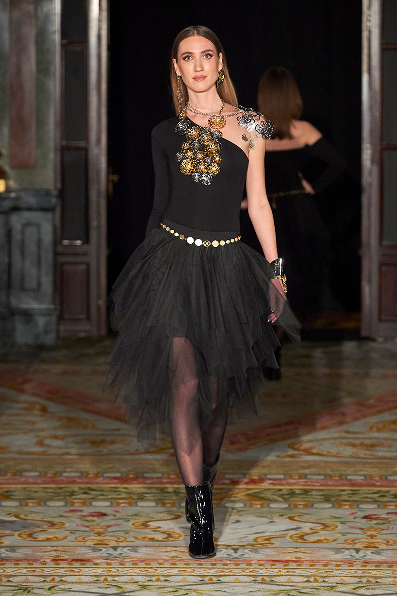 Spanish based designers Carmen Ramil and Gemma Pujalte, the phenoms behind the label Ramil & Pujalte presented a stunning collection entitled “Klimt” featuring tailormade pieces with intricate detailing that felt fresh and couture. The fabrics, made in-house, such as silk and plexiglass resulted in a sculptural and artistic collection that felt wearable and elevated. Inspired by Gustav Klimt, the designers used rigid materials such as metal and methacrylate, along with cotton and acetate to create ornamental garments. The concept of opposites dominated the color palette showcasing black versus white, gold versus silver and translucent versus opaque.