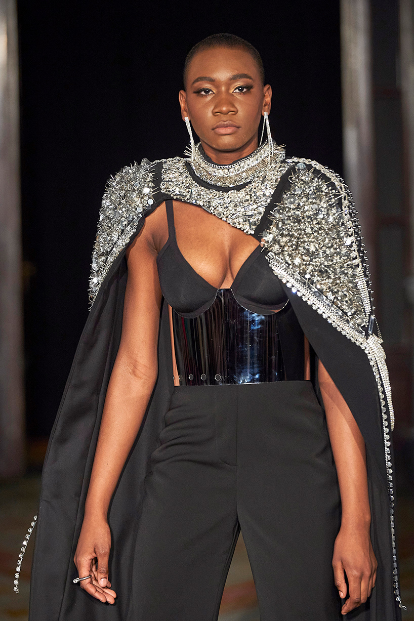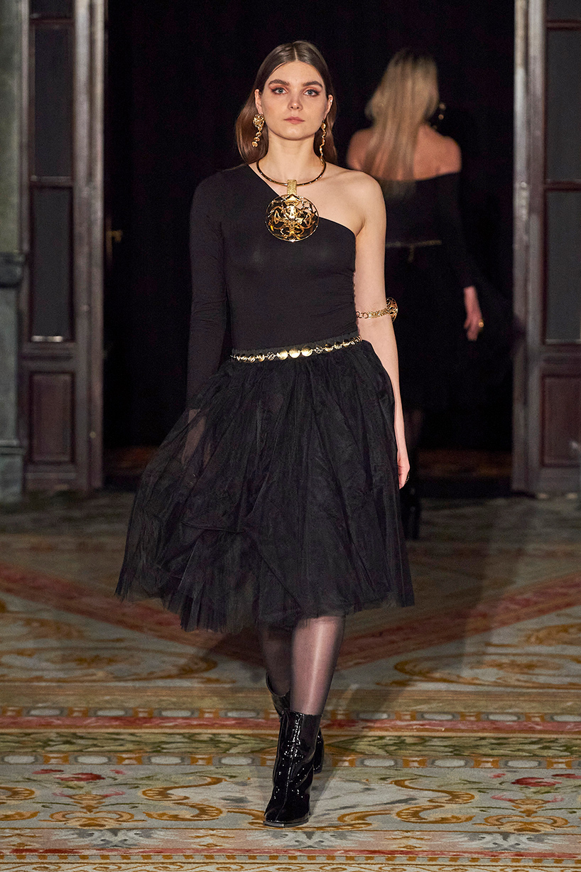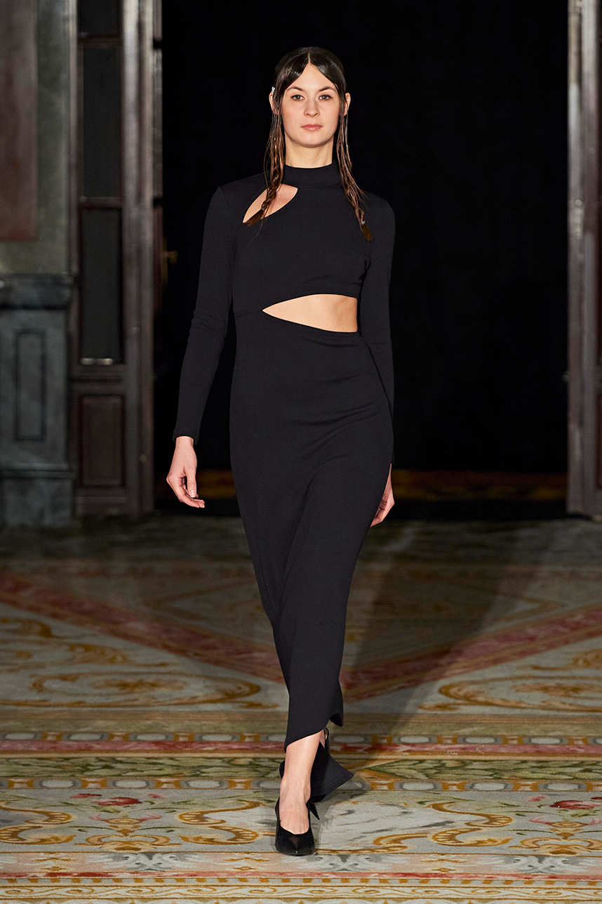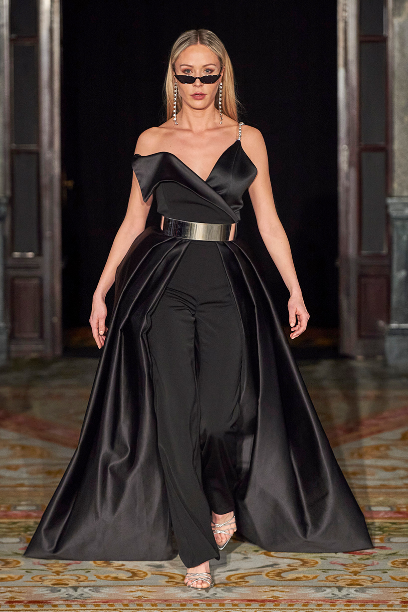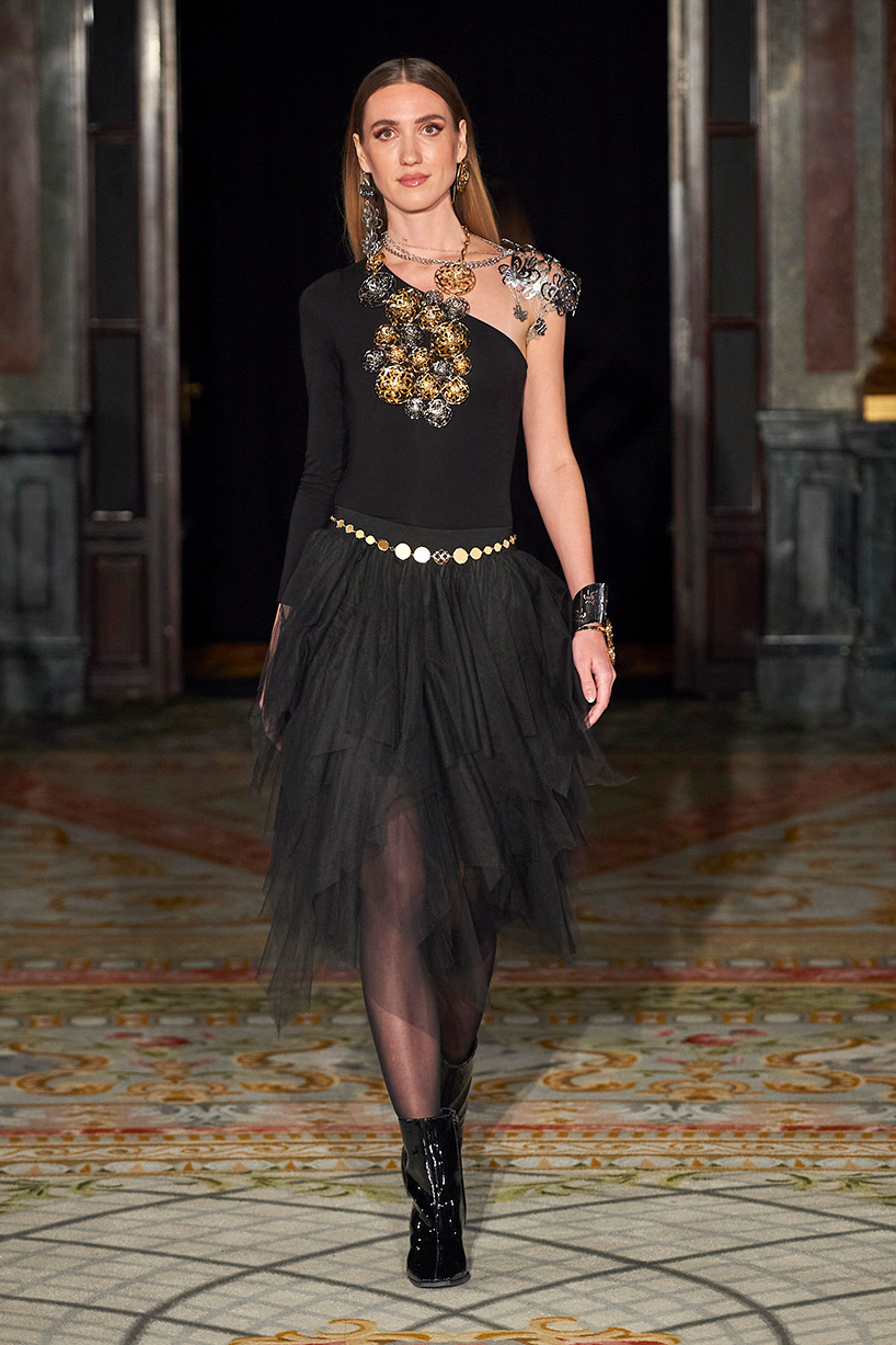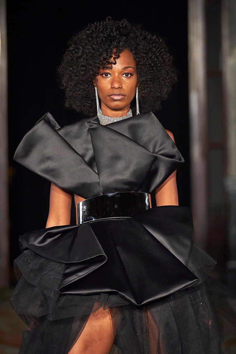 Spanish based designers Carmen Ramil and Gemma Pujalte, the phenoms behind the label Ramil & Pujalte presented a stunning collection entitled “Klimt” featuring tailormade pieces with intricate detailing that felt fresh and couture. The fabrics, made in-house, such as silk and plexiglass resulted in a sculptural and artistic collection that felt wearable and elevated. Inspired by Gustav Klimt, the designers used rigid materials such as metal and methacrylate, along with cotton and acetate to create ornamental garments. The concept of opposites dominated the color palette showcasing black versus white, gold versus silver and translucent versus opaque.