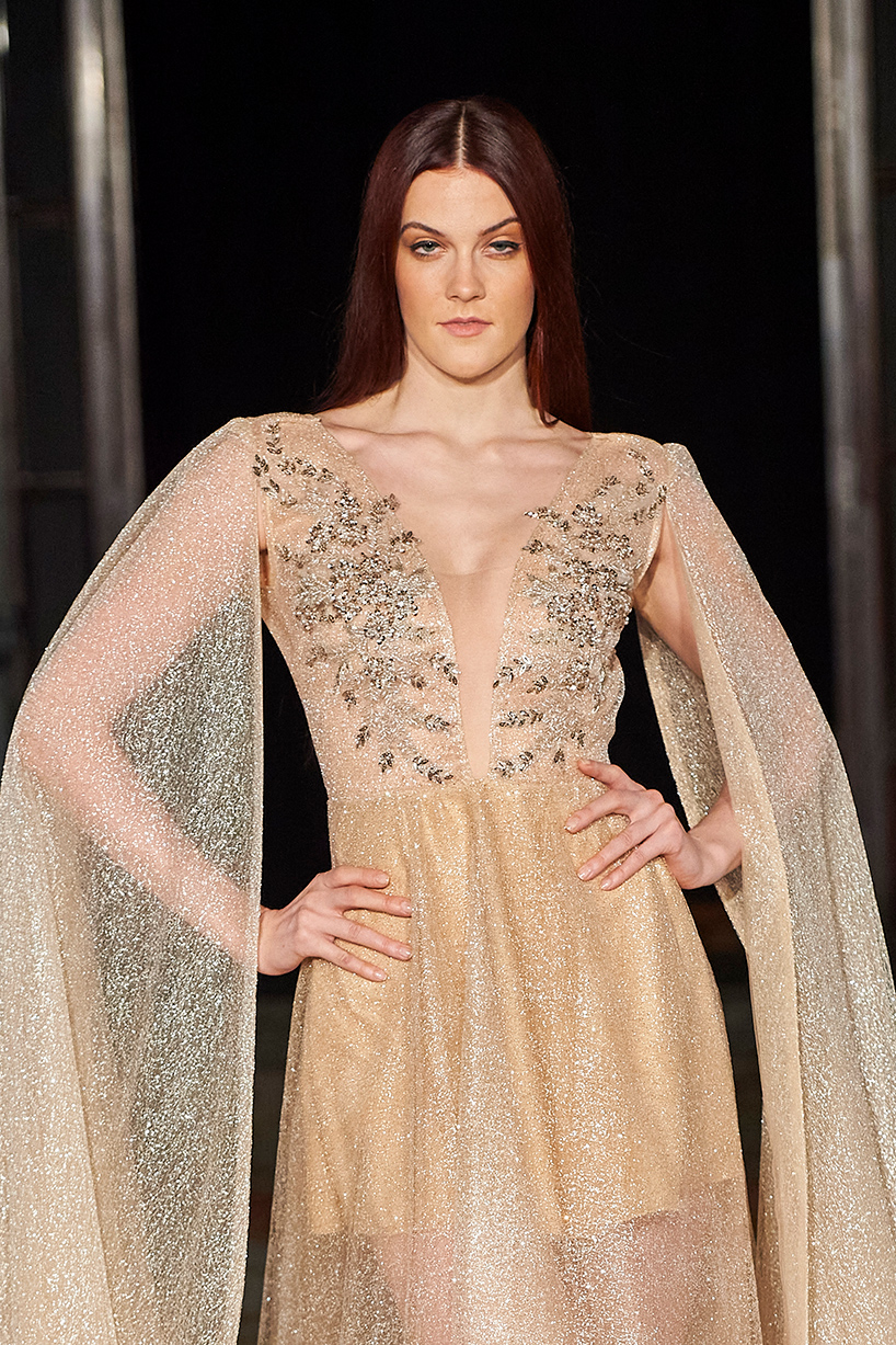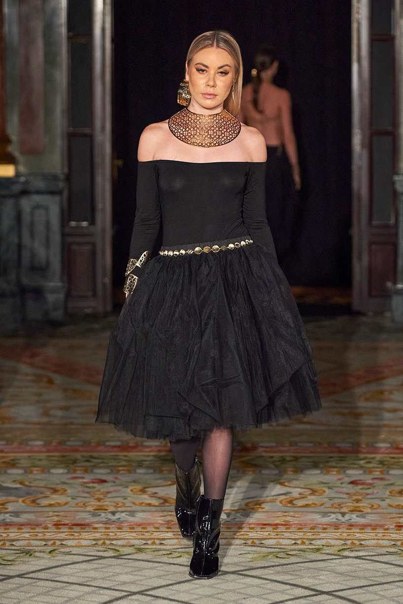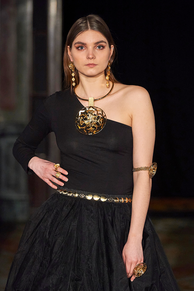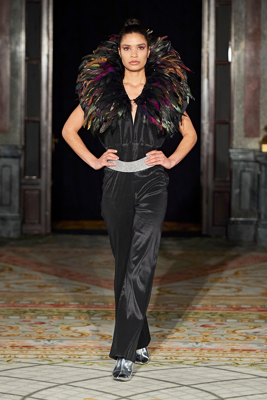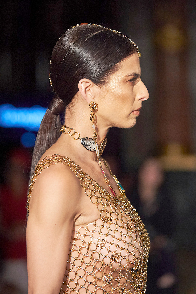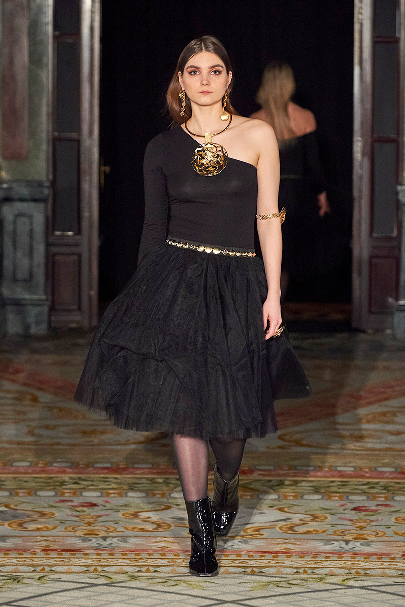 Spanish based designers Carmen Ramil and Gemma Pujalte, the phenoms behind the label Ramil & Pujalte presented a stunning collection entitled “Klimt” featuring tailormade pieces with intricate detailing that felt fresh and couture. The fabrics, made in-house, such as silk and plexiglass resulted in a sculptural and artistic collection that felt wearable and elevated. Inspired by Gustav Klimt, the designers used rigid materials such as metal and methacrylate, along with cotton and acetate to create ornamental garments. The concept of opposites dominated the color palette showcasing black versus white, gold versus silver and translucent versus opaque.