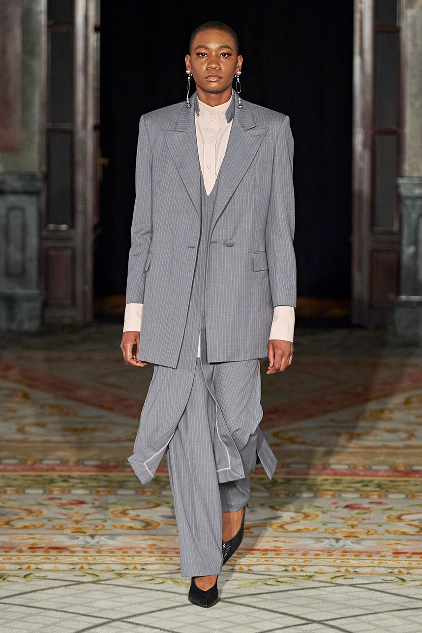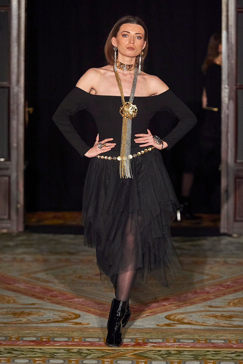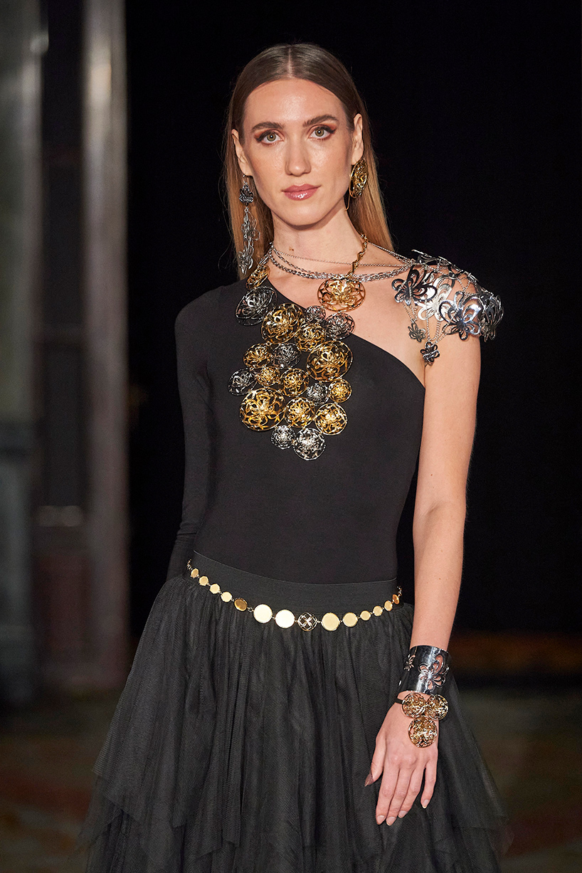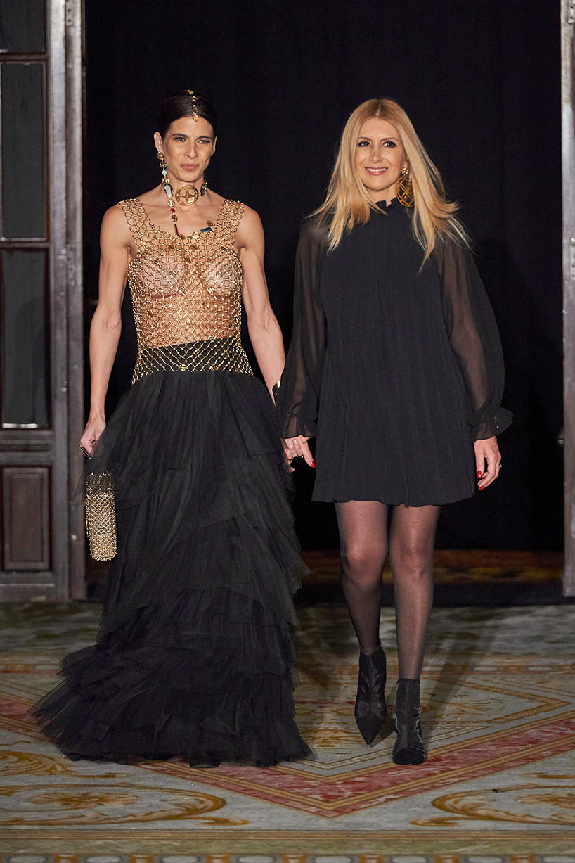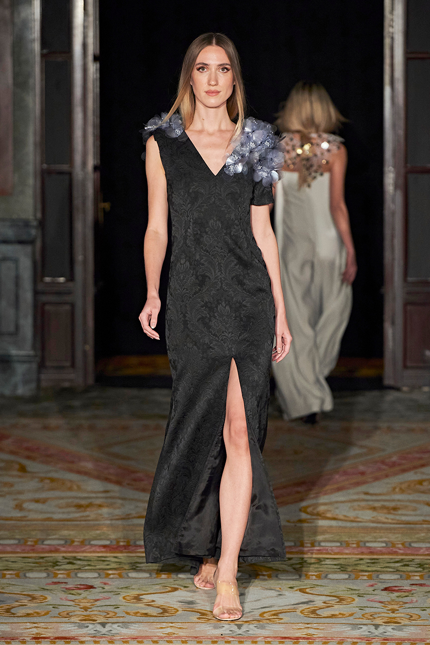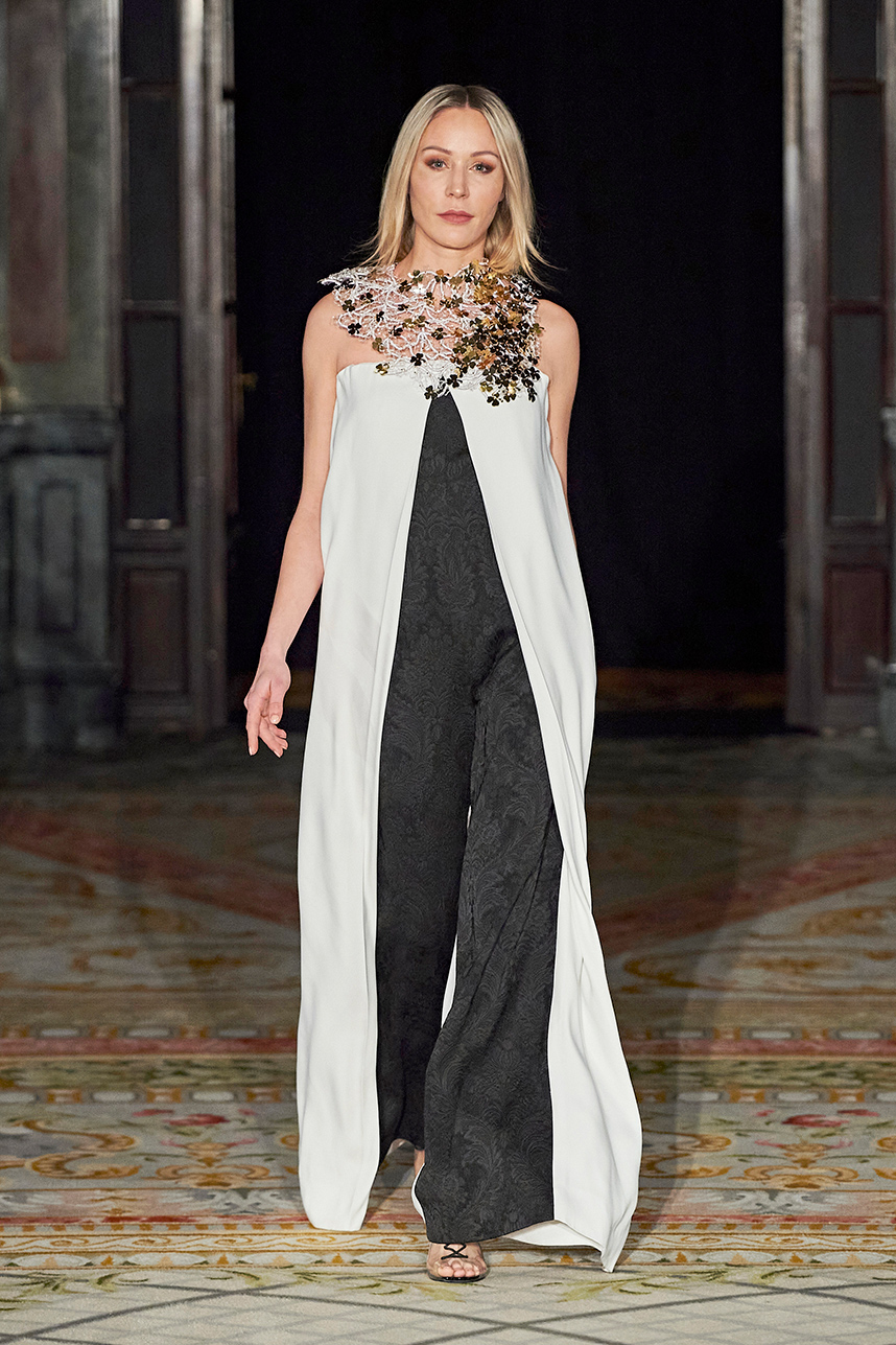 Spanish based designers Carmen Ramil and Gemma Pujalte, the phenoms behind the label Ramil & Pujalte presented a stunning collection entitled “Klimt” featuring tailormade pieces with intricate detailing that felt fresh and couture. The fabrics, made in-house, such as silk and plexiglass resulted in a sculptural and artistic collection that felt wearable and elevated. Inspired by Gustav Klimt, the designers used rigid materials such as metal and methacrylate, along with cotton and acetate to create ornamental garments. The concept of opposites dominated the color palette showcasing black versus white, gold versus silver and translucent versus opaque.