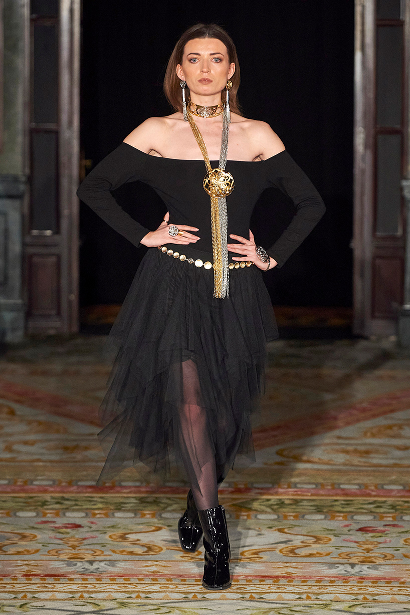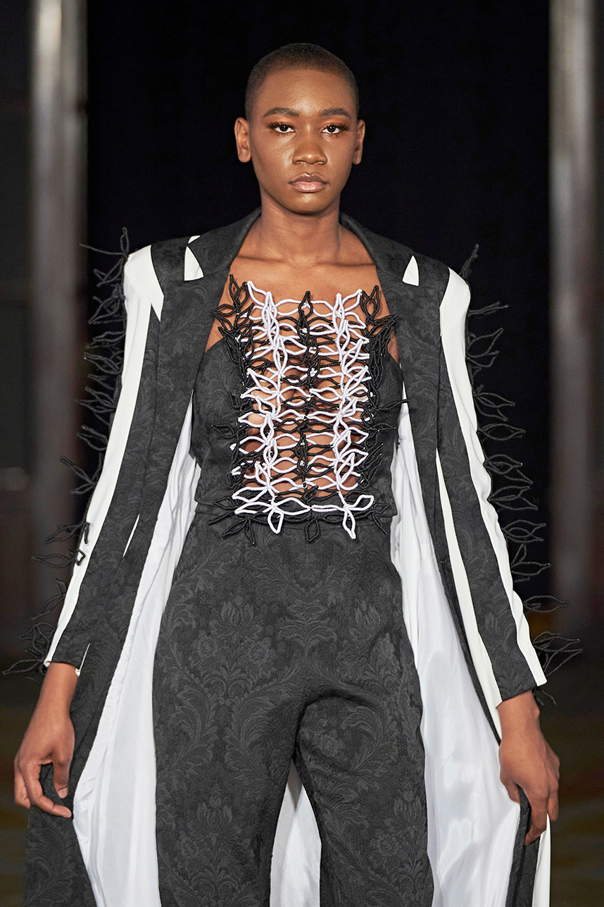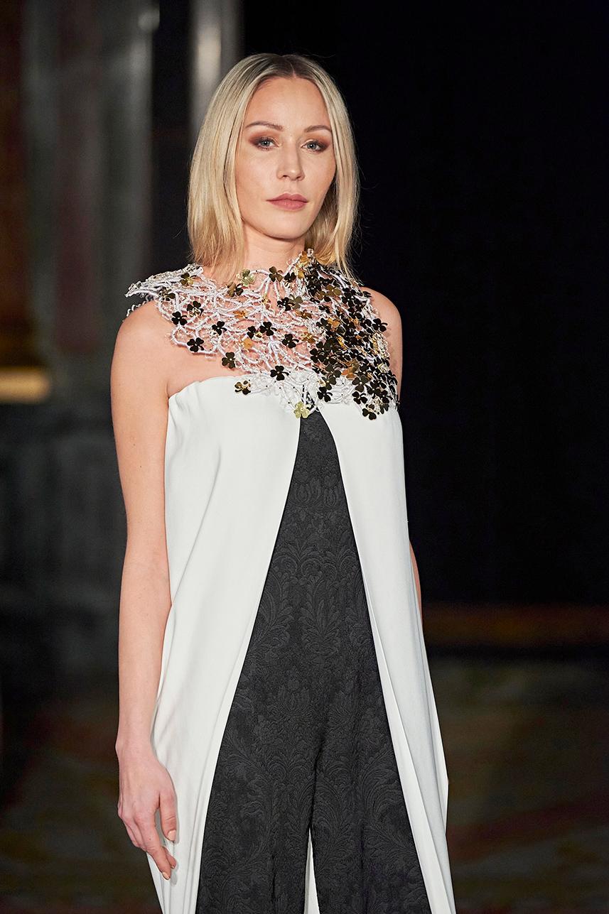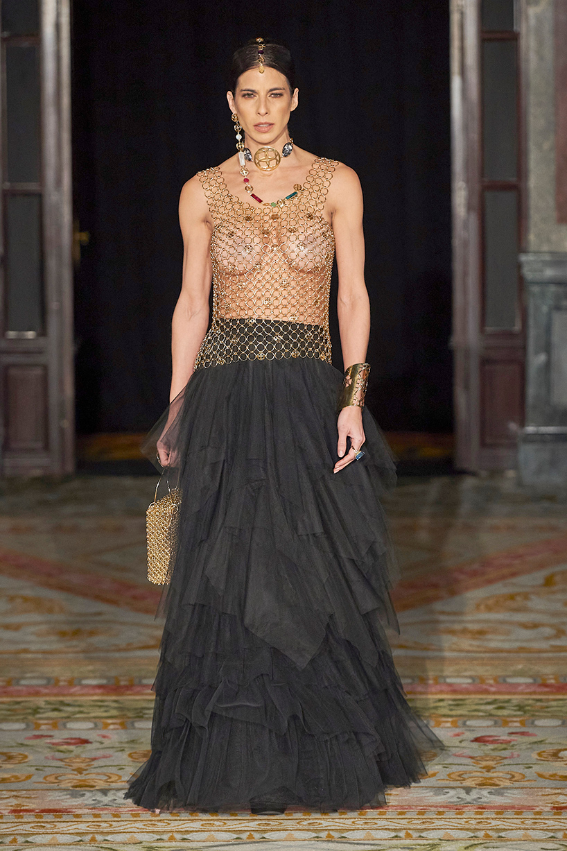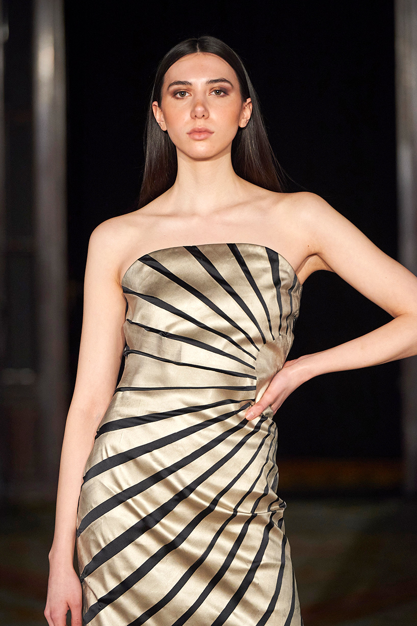 Spanish based designers Carmen Ramil and Gemma Pujalte, the phenoms behind the label Ramil & Pujalte presented a stunning collection entitled “Klimt” featuring tailormade pieces with intricate detailing that felt fresh and couture. The fabrics, made in-house, such as silk and plexiglass resulted in a sculptural and artistic collection that felt wearable and elevated. Inspired by Gustav Klimt, the designers used rigid materials such as metal and methacrylate, along with cotton and acetate to create ornamental garments. The concept of opposites dominated the color palette showcasing black versus white, gold versus silver and translucent versus opaque.