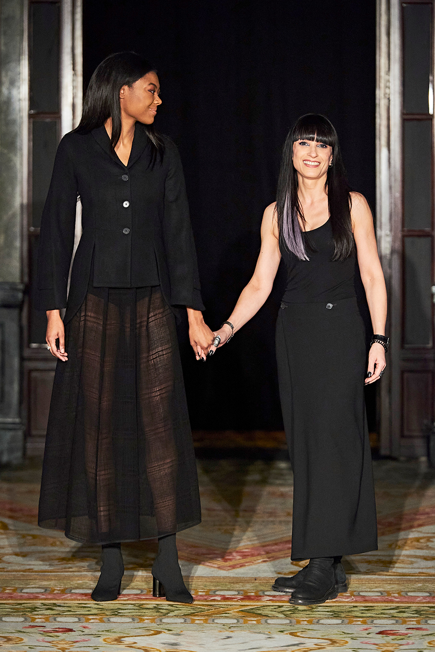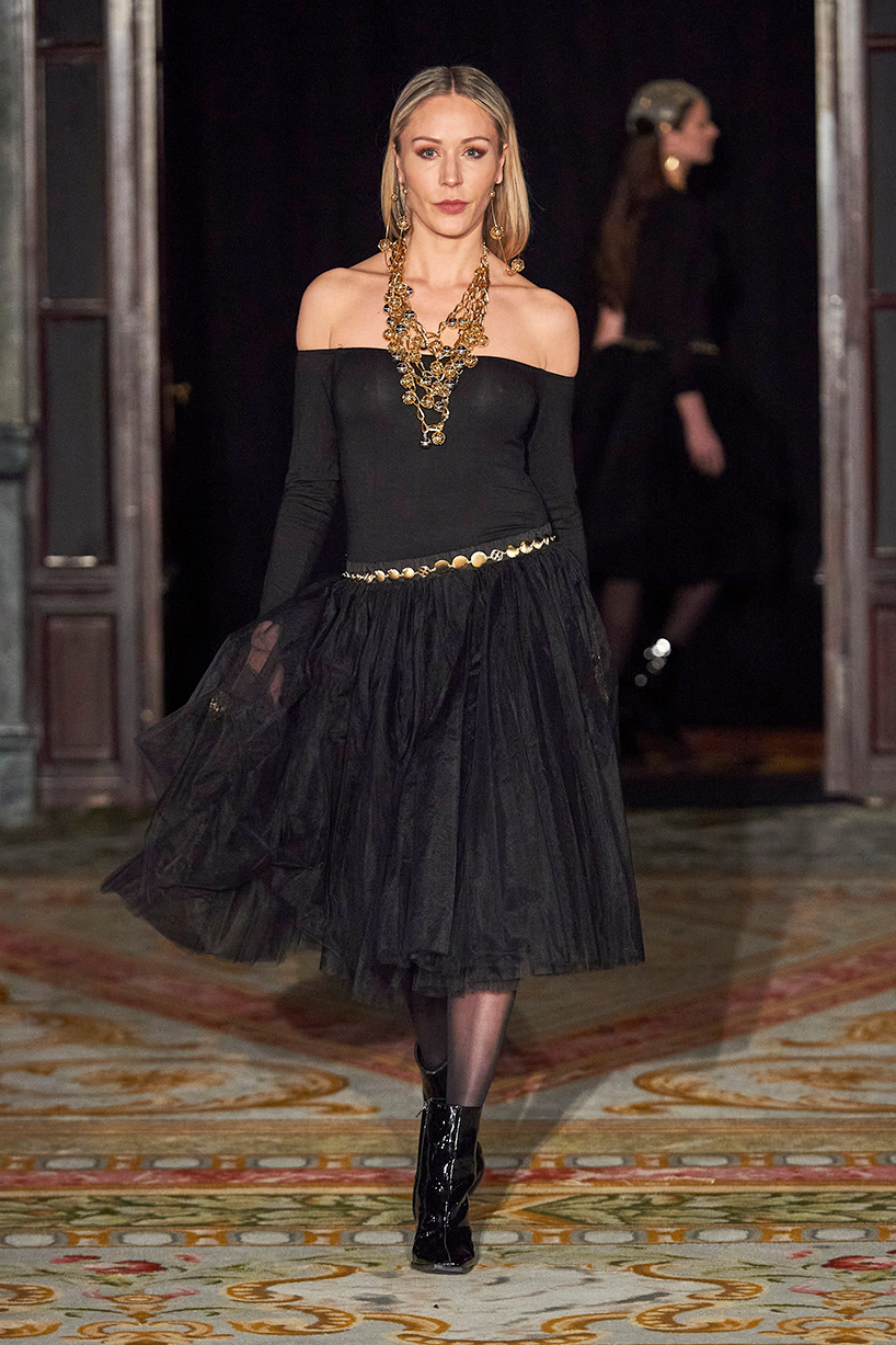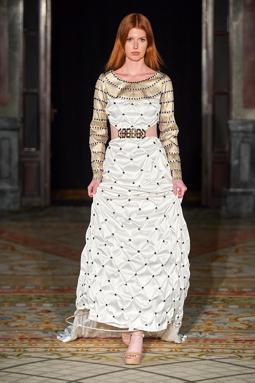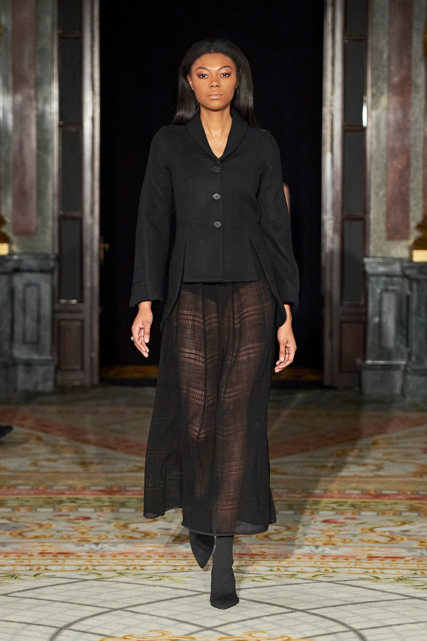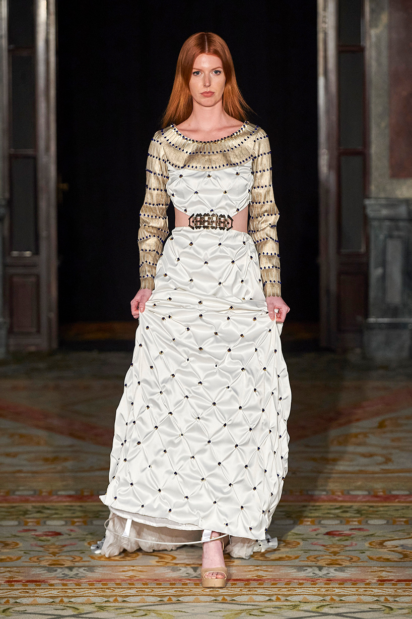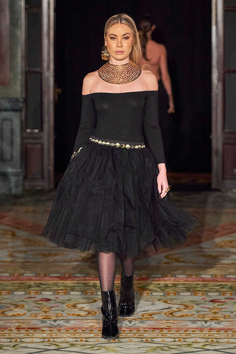 Spanish based designers Carmen Ramil and Gemma Pujalte, the phenoms behind the label Ramil & Pujalte presented a stunning collection entitled “Klimt” featuring tailormade pieces with intricate detailing that felt fresh and couture. The fabrics, made in-house, such as silk and plexiglass resulted in a sculptural and artistic collection that felt wearable and elevated. Inspired by Gustav Klimt, the designers used rigid materials such as metal and methacrylate, along with cotton and acetate to create ornamental garments. The concept of opposites dominated the color palette showcasing black versus white, gold versus silver and translucent versus opaque.