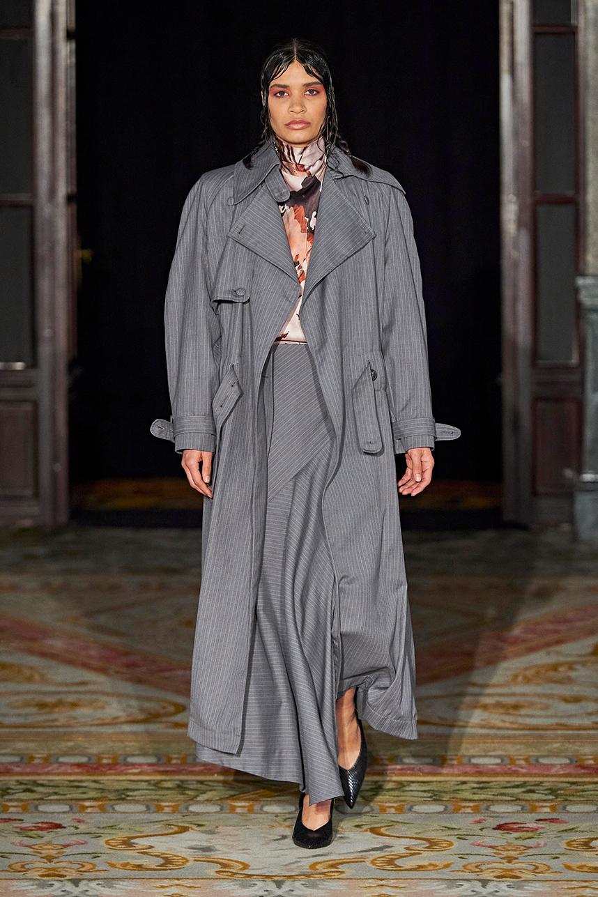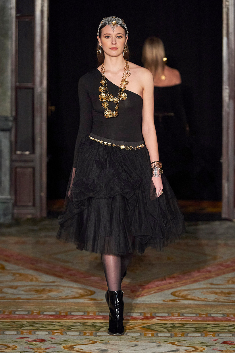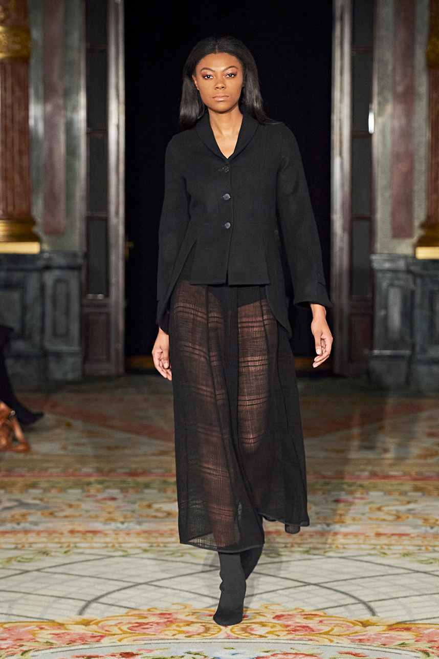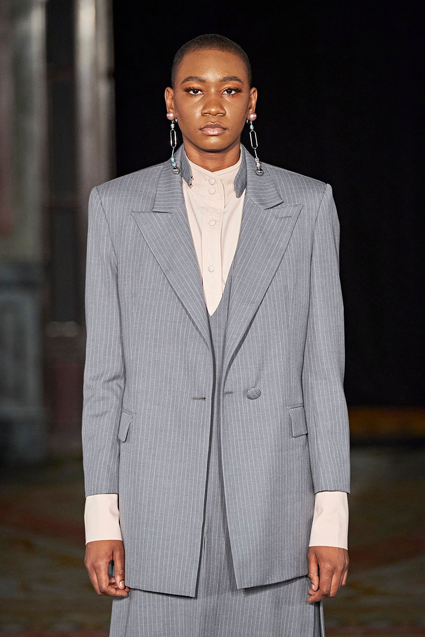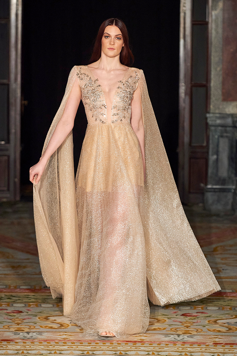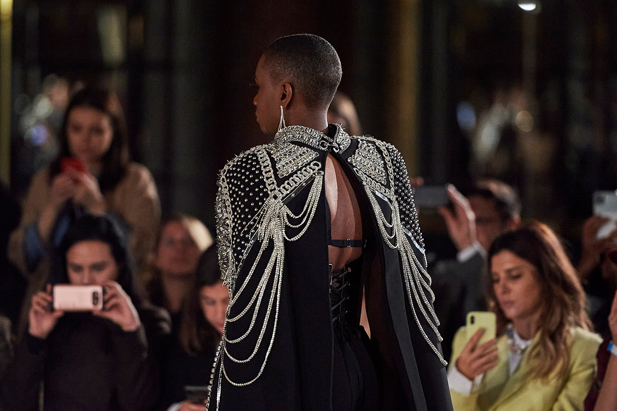 Spanish based designers Carmen Ramil and Gemma Pujalte, the phenoms behind the label Ramil & Pujalte presented a stunning collection entitled “Klimt” featuring tailormade pieces with intricate detailing that felt fresh and couture. The fabrics, made in-house, such as silk and plexiglass resulted in a sculptural and artistic collection that felt wearable and elevated. Inspired by Gustav Klimt, the designers used rigid materials such as metal and methacrylate, along with cotton and acetate to create ornamental garments. The concept of opposites dominated the color palette showcasing black versus white, gold versus silver and translucent versus opaque.