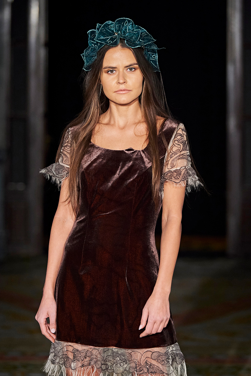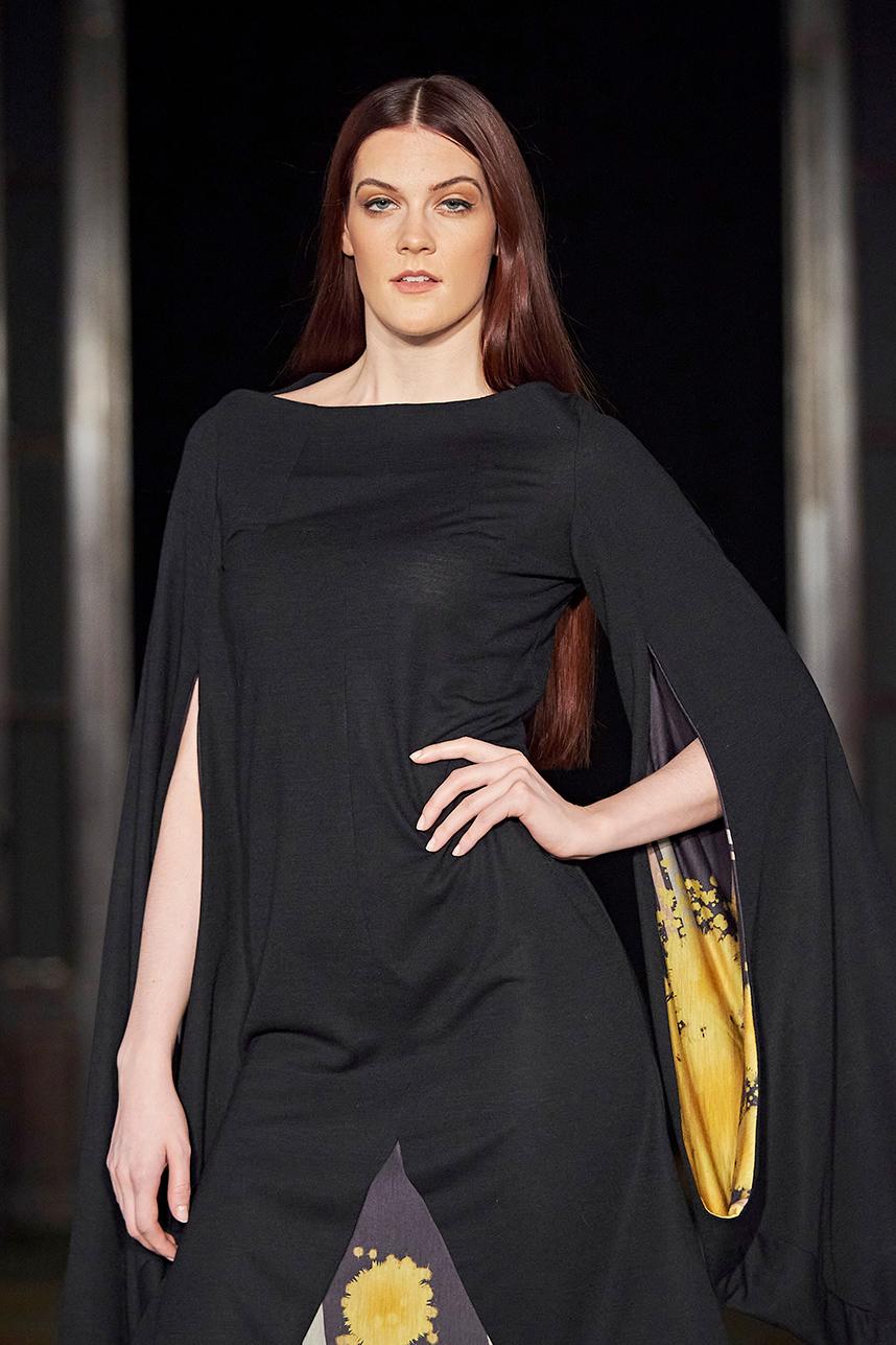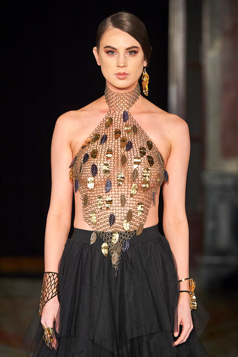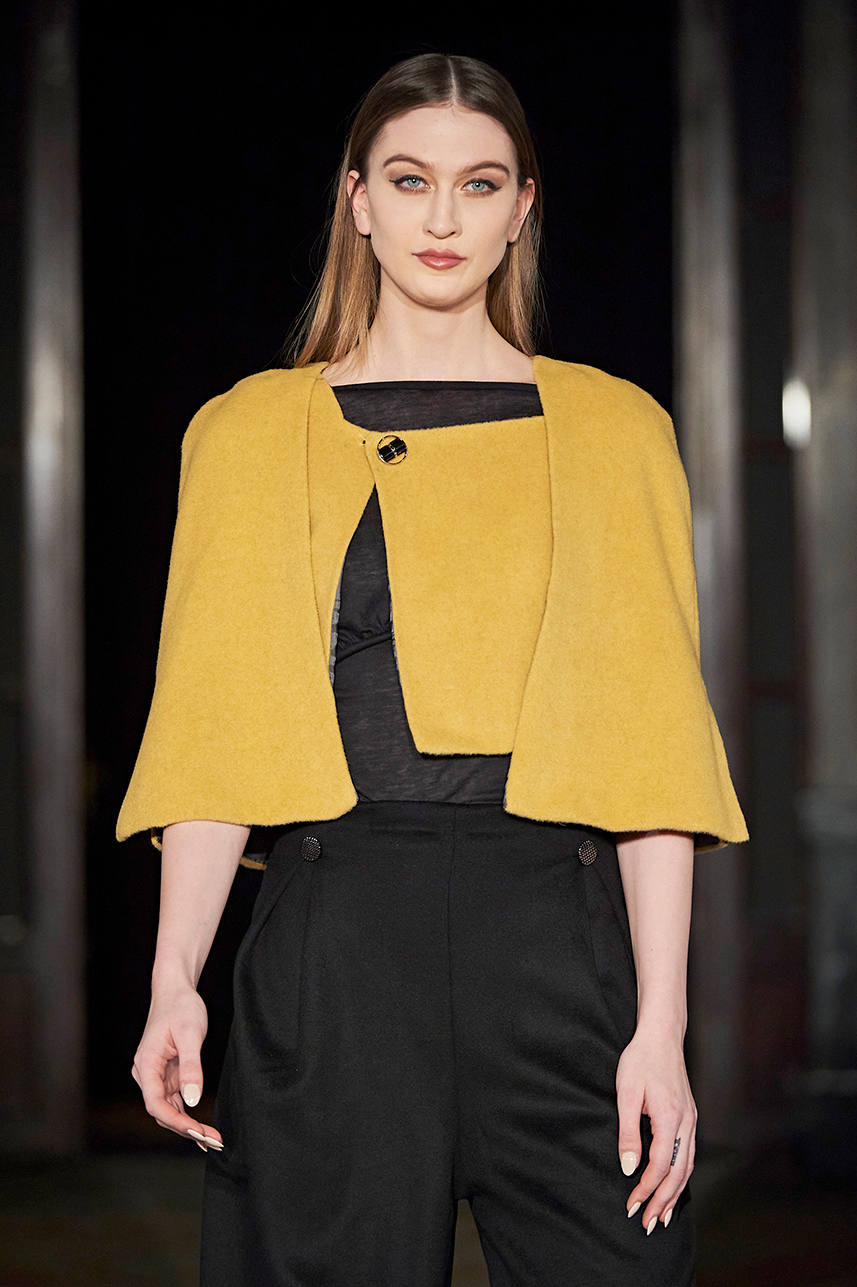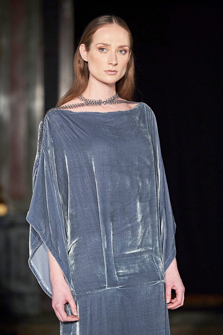 Wendy Ratcliffe from Australia, founder of InVintaged presented her collection “Chrysalis,” inspired by simple, classical vintage-inspired styles. The silhouettes were designed to perfectly enhance a modern woman’s natural elegance – From the 1920’s to 2020. Ratcliffe expertly paired silk velvets with chainmaille maintaining a classic femininity. Hand dyed Australian Merino Wool in shades Chainmaille, French navy, wattle yellow, black, smokey grey and Australian bush green were paired with silks with tailored draping and interesting details such as caped sleeves.
