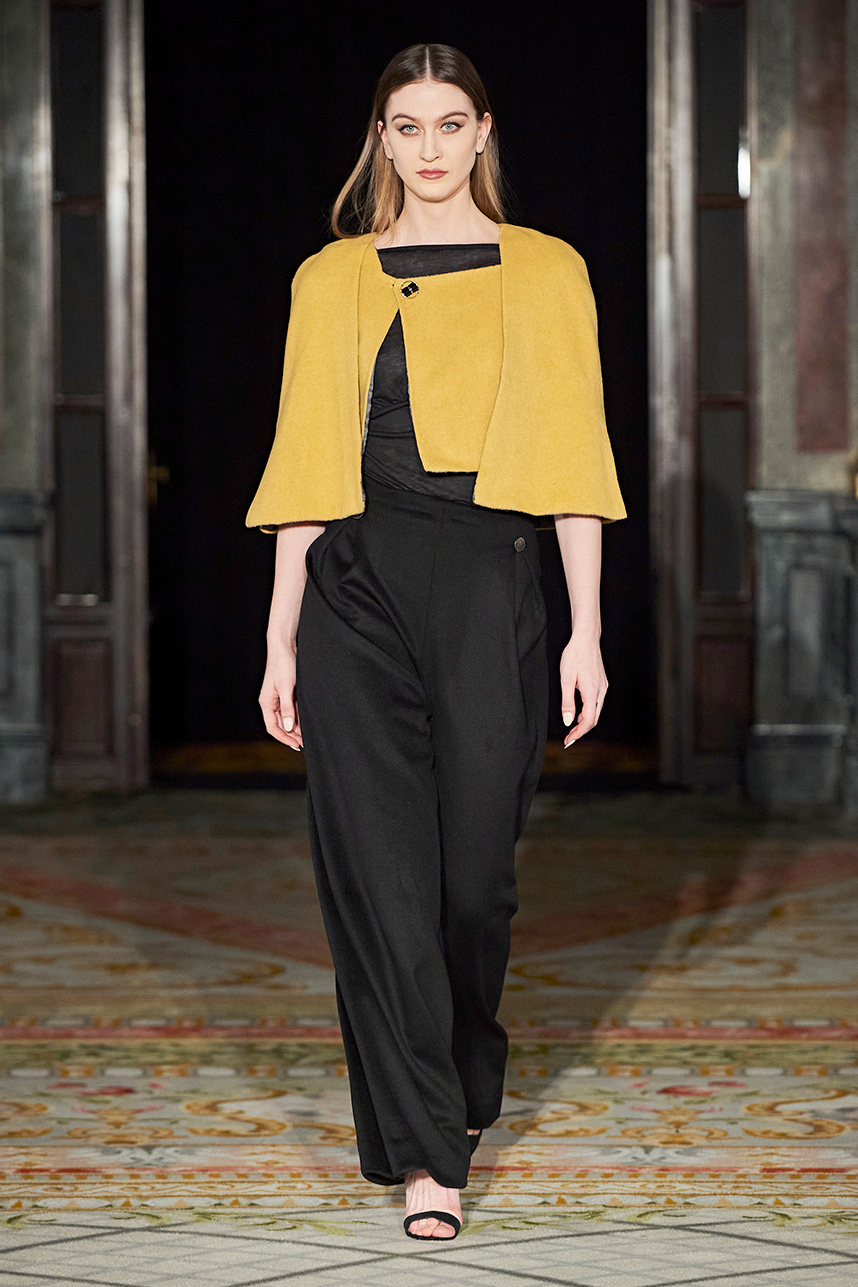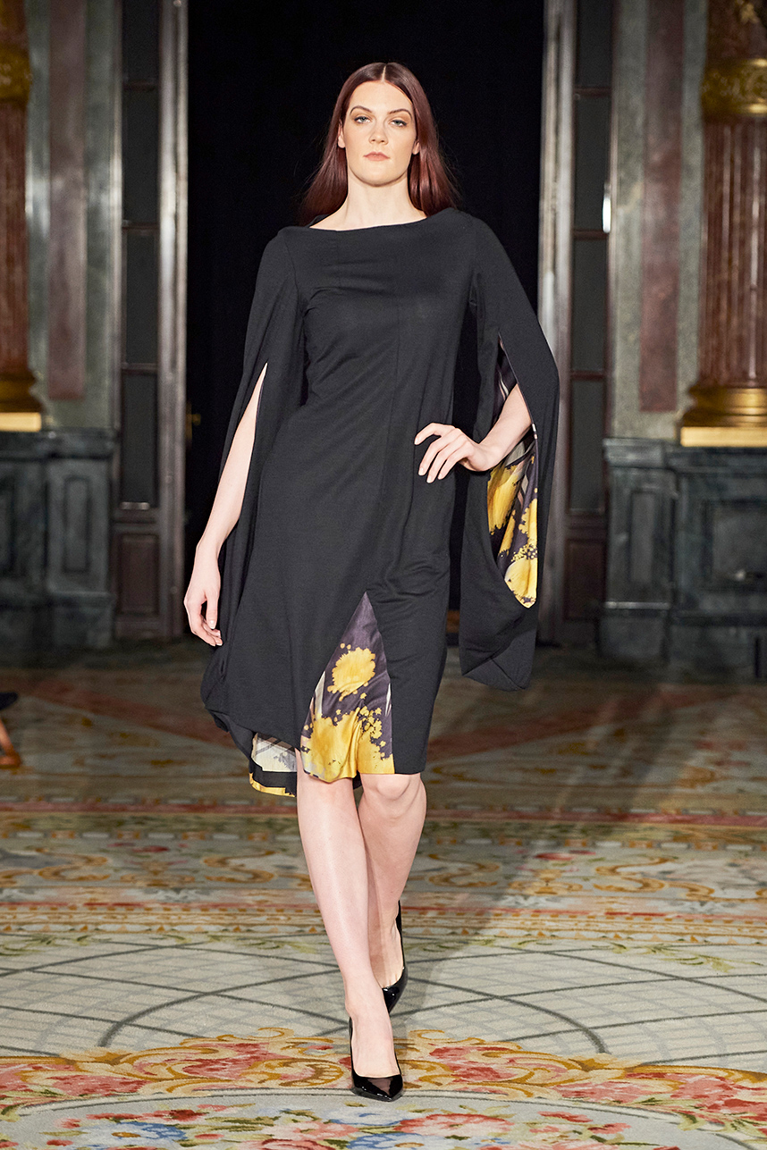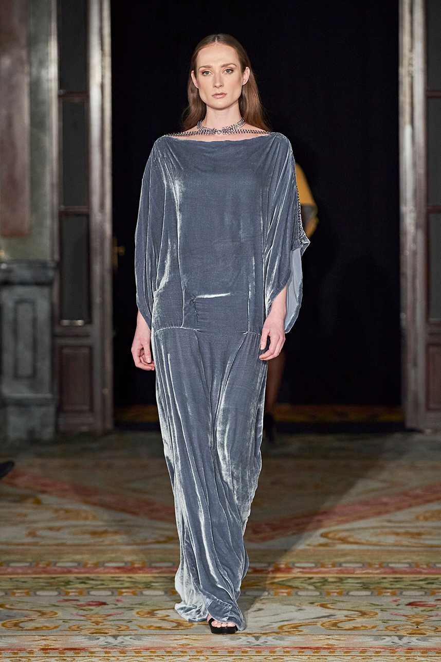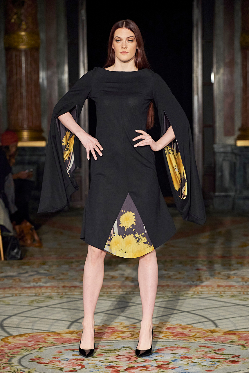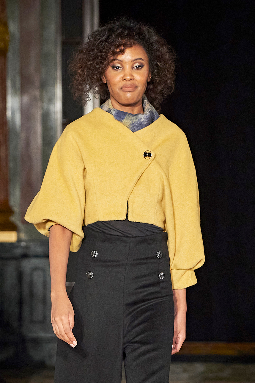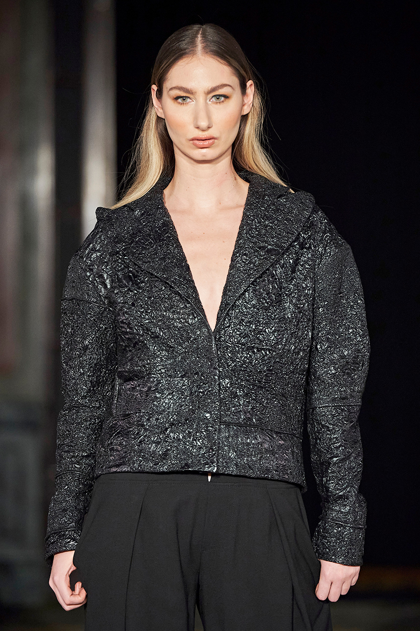 Wendy Ratcliffe from Australia, founder of InVintaged presented her collection “Chrysalis,” inspired by simple, classical vintage-inspired styles. The silhouettes were designed to perfectly enhance a modern woman’s natural elegance – From the 1920’s to 2020. Ratcliffe expertly paired silk velvets with chainmaille maintaining a classic femininity. Hand dyed Australian Merino Wool in shades Chainmaille, French navy, wattle yellow, black, smokey grey and Australian bush green were paired with silks with tailored draping and interesting details such as caped sleeves.