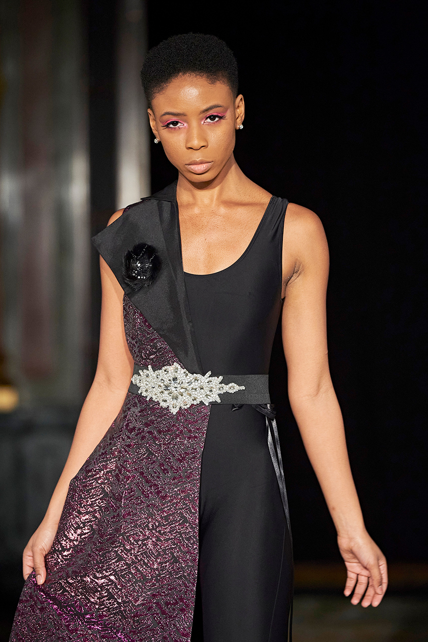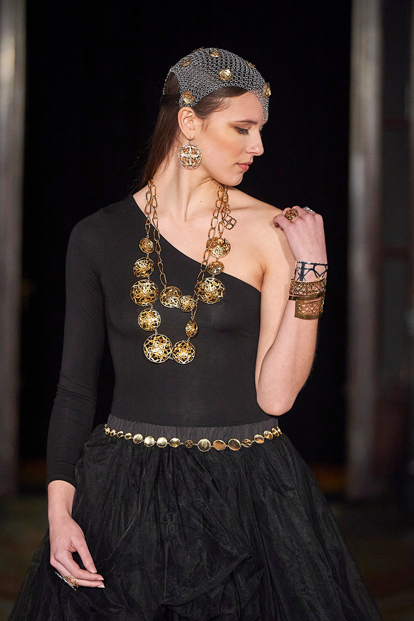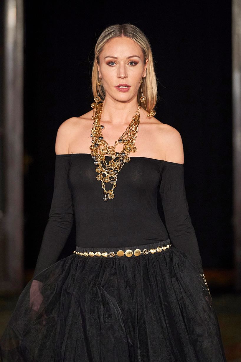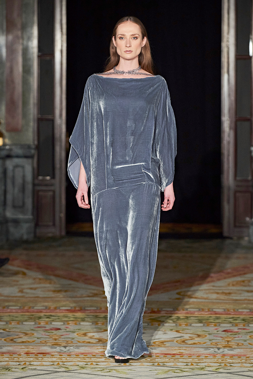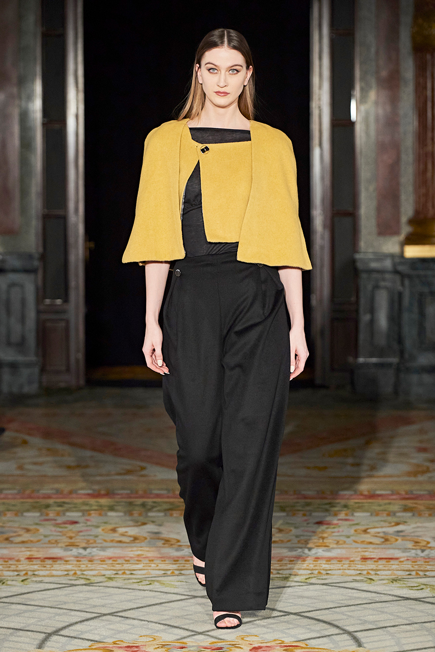Wendy Ratcliffe from Australia, founder of InVintaged presented her collection “Chrysalis,” inspired by simple, classical vintage-inspired styles. The silhouettes were designed to perfectly enhance a modern woman’s natural elegance – From the 1920’s to 2020. Ratcliffe expertly paired silk velvets with chainmaille maintaining a classic femininity. Hand dyed Australian Merino Wool in shades Chainmaille, French navy, wattle yellow, black, smokey grey and Australian bush green were paired with silks with tailored draping and interesting details such as caped sleeves.