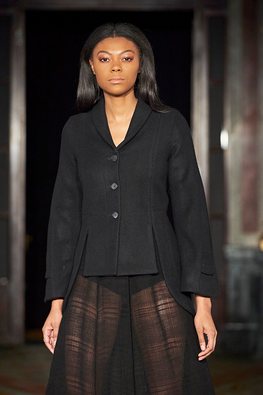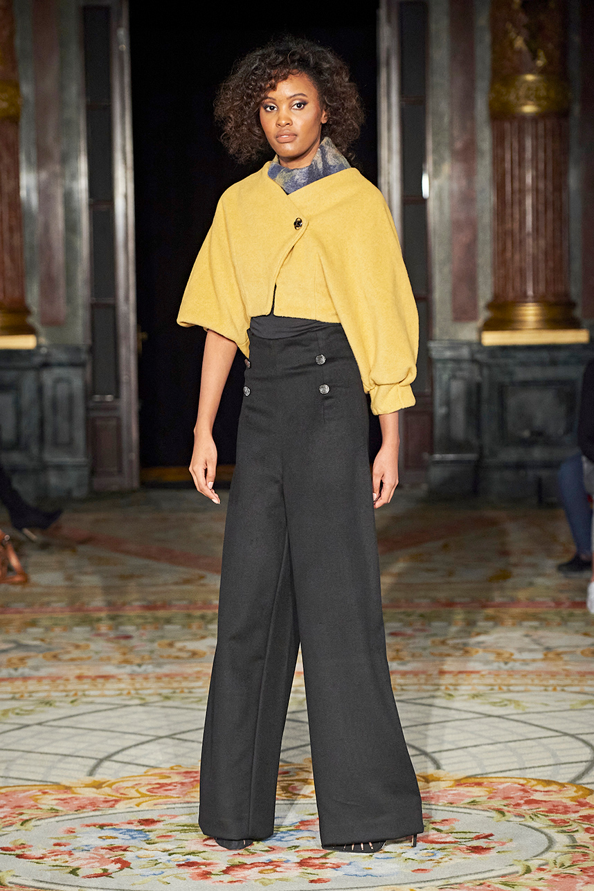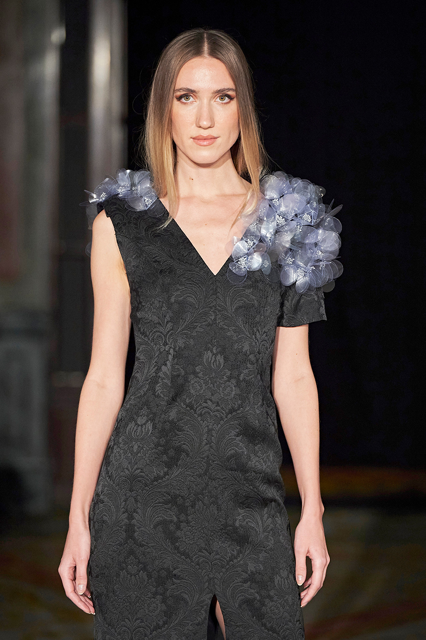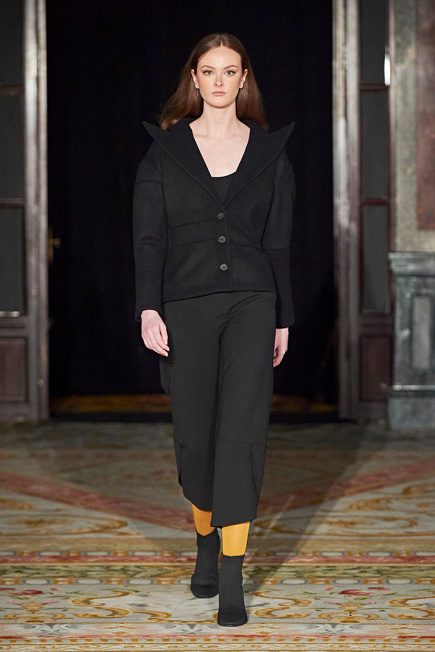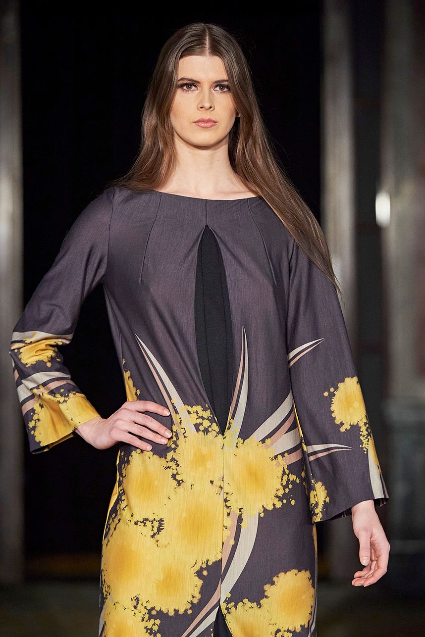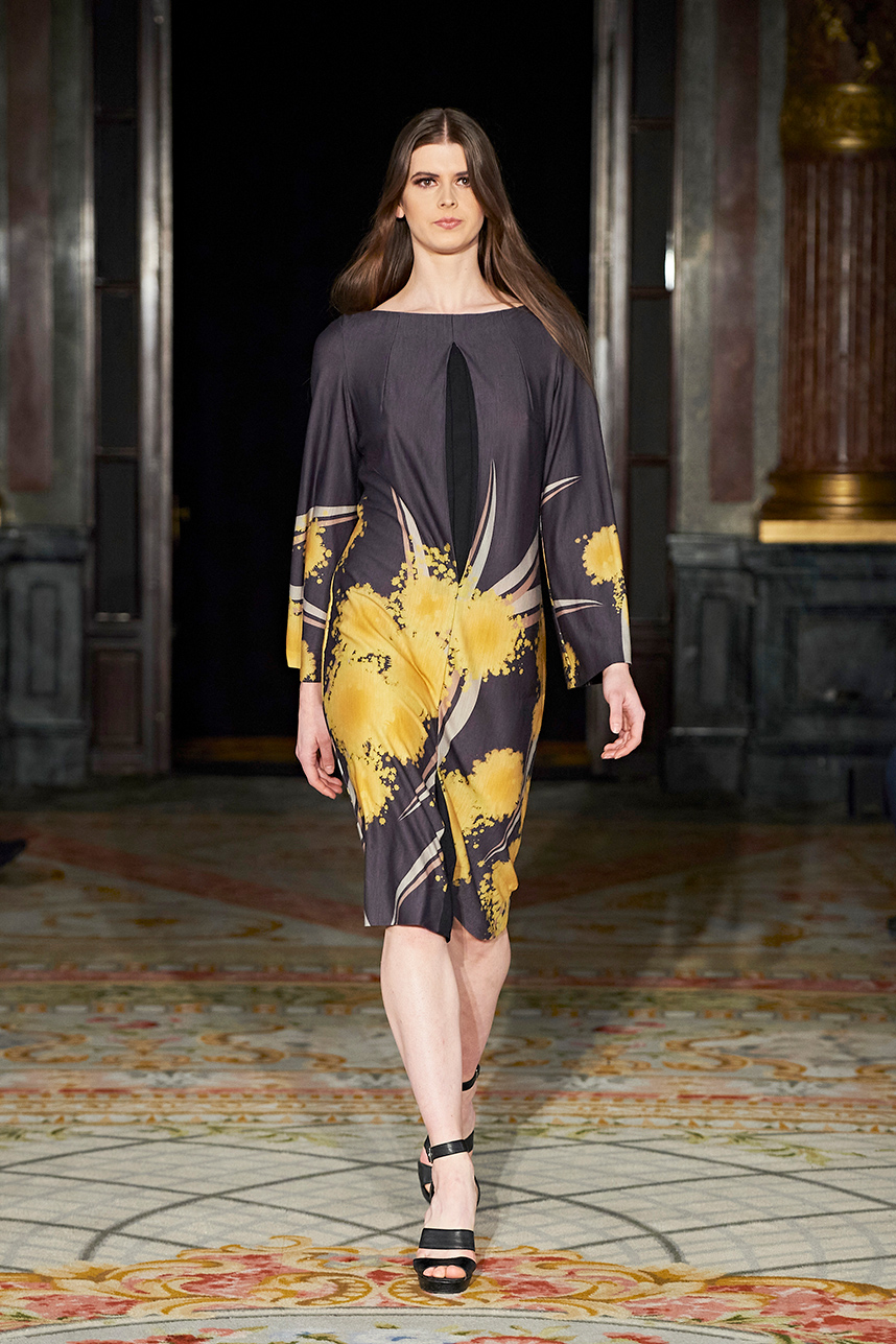 Wendy Ratcliffe from Australia, founder of InVintaged presented her collection “Chrysalis,” inspired by simple, classical vintage-inspired styles. The silhouettes were designed to perfectly enhance a modern woman’s natural elegance – From the 1920’s to 2020. Ratcliffe expertly paired silk velvets with chainmaille maintaining a classic femininity. Hand dyed Australian Merino Wool in shades Chainmaille, French navy, wattle yellow, black, smokey grey and Australian bush green were paired with silks with tailored draping and interesting details such as caped sleeves.